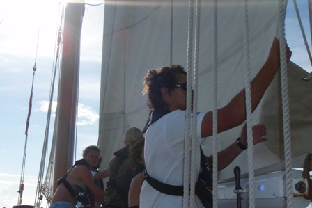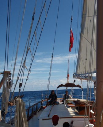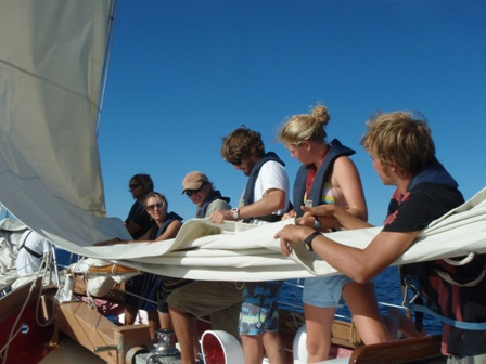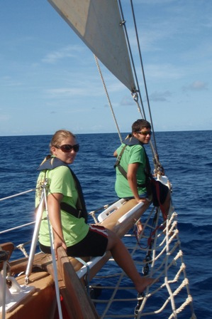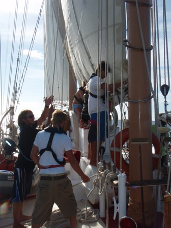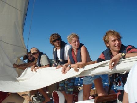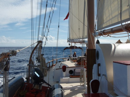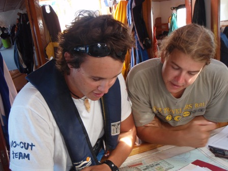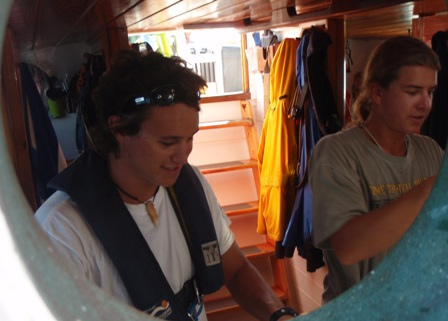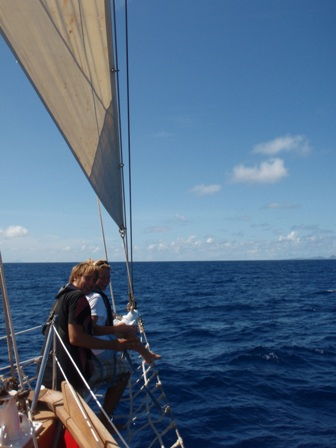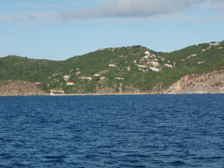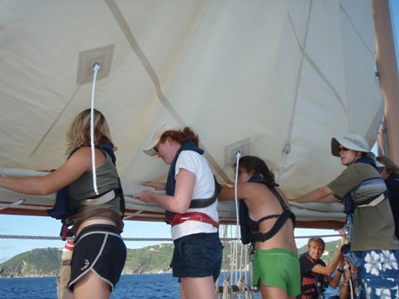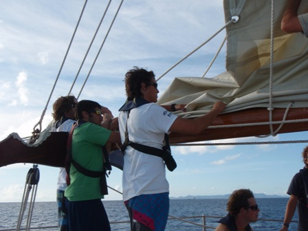 It was an early rising day, leaving Barbuda at 06:00, and the air was still chilly. A refreshing cereal medley was put out to keep our energy up, and we set the sails. We divided into 2-hour watch teams, with watch team one (Graham, Roxy, Chris, Mac, Ev, and Caroline) leading us out. Immediately afterward, everyone else went below to get a couple of extra hours of sleep. It was refreshing. A few people had sore chests from surfing the close breaks at Barbuda, so working under the shade of a sail was nice, too. We dodged some crab traps, keeping a course between 280 and 300 degrees, varying throughout the day. Overall, we had very light winds and had to run the motor most of the way. Arriving in St. Barth’s was like anywhere else, except we flaked the sails as we lowered them this time! WHEW! That was a relief. There were a few rock islands on the outer edge of the harbor, too. (Hopefully, we’ll dive them during our visit.) I had a nice, leisurely shower and totally touched the bottom (so did Ben and Chris) (40 ft down, no big deal). We had curry with potatoes, along with rice and canned chicken. Mac picked out some great tunes for after-dinner clean-up, and we watched Captain Ron after a scheduling meeting around 19:30. New provisions tomorrow and fresh food coming aboard!