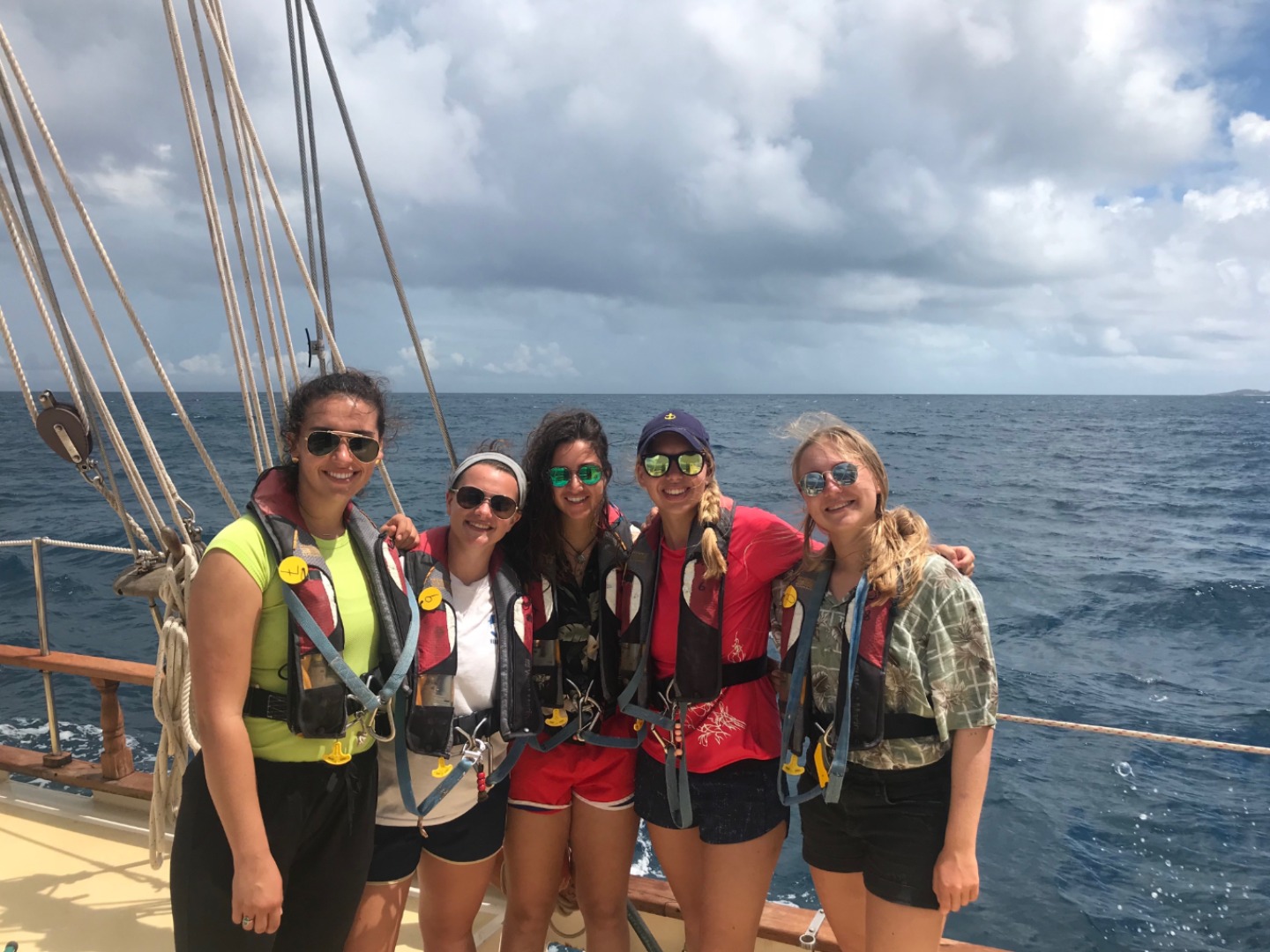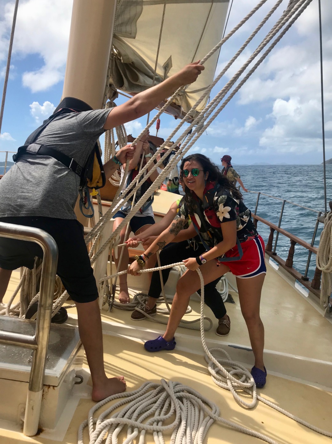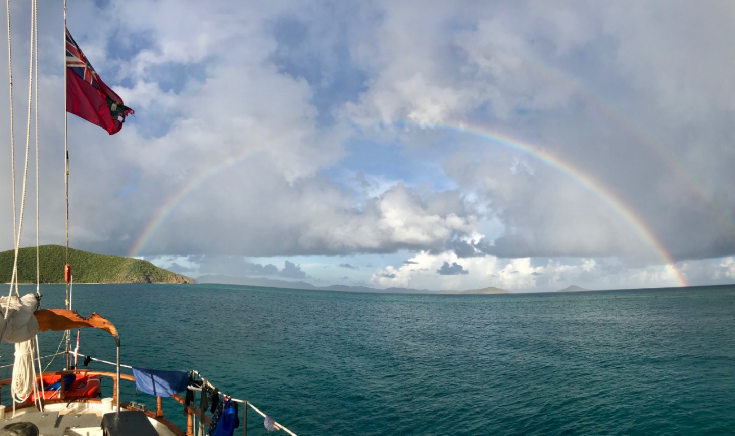 Waking up in Savannah Bay, we enjoyed a good breakfast of corn puffs with the view of a double rainbow and got ready to sail out. We learned how to pull up the anchor and raise each of the three boom sails, working together as a real crew. Throughout the sail, we practiced both tacking and gybing. Shortly after, we anchored at Mountain Point and had an amazing lunch of pasta salad (oh, and the cold water – everyone’s favorite). The afternoon was spent completing more Open Water SCUBA training dives, swimming, and reading. Once everyone got back to the boat, it was time for our “Wash Workout” and a quick yoga class by Sinclair, which was a really great way to relax after such an activity-packed day. Then we started getting ready for dinner – chicken wings, brussels sprouts, and potatoes were a hit! To close dinner, we did our traditional “squeeze” and talked about our favorite books… It’s been a long day full of learning new skills and getting to know each other better, and we can’t wait to continue to Leverick Bay tomorrow!