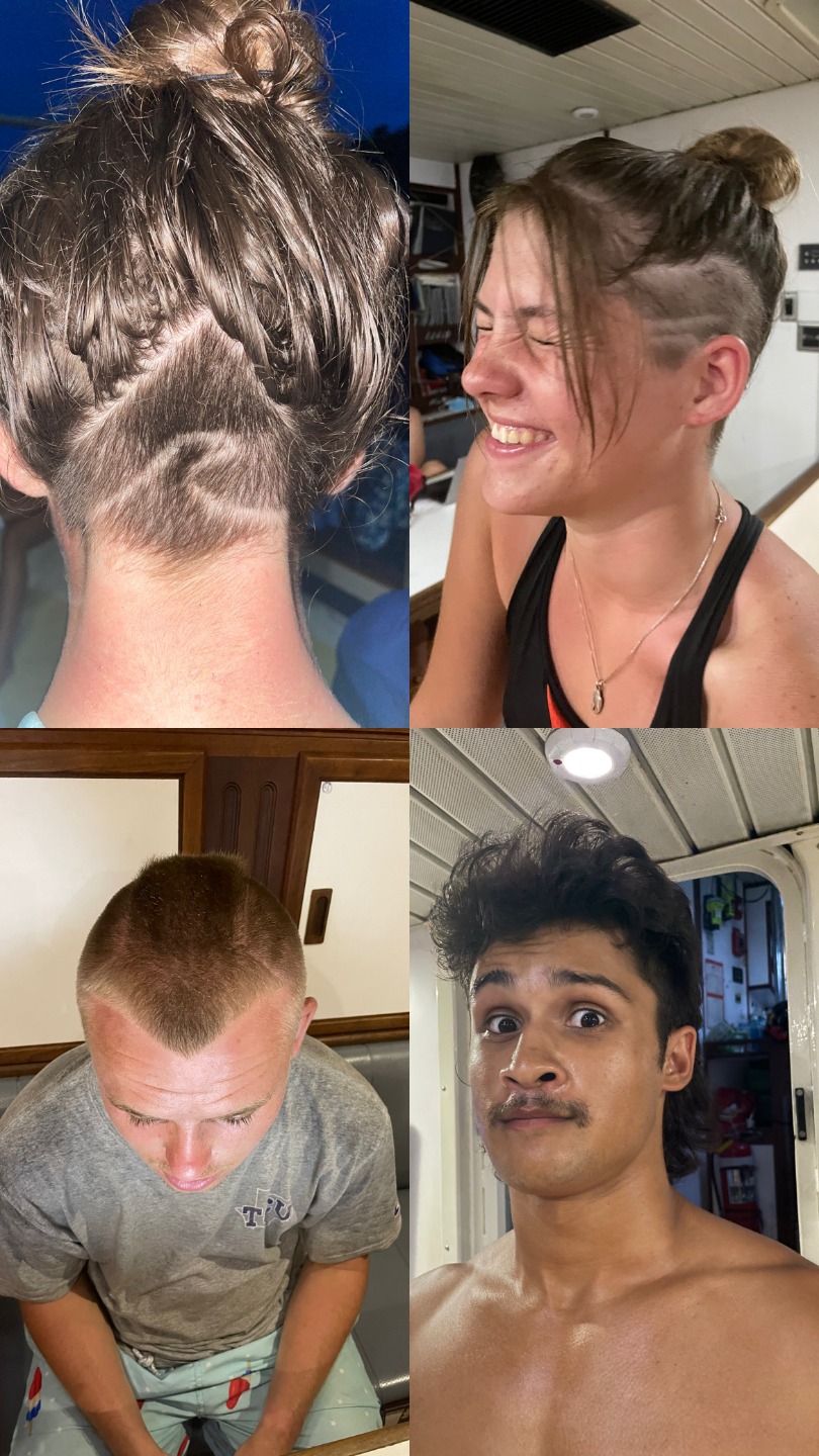 We woke up this morning in Waisai, the main town in Raja Ampat. We spent a stormy night at anchor there after getting our permits for diving and moving around the marine protected areas of Raja. We had some delicious fresh fruit salad with our yogurt and granola for breakfast, which was a welcome treat for everyone after a passage. The produce in Palau was somewhat limited, but Lolo and I stocked up on a bunch of fruits and veggies for the boat before we departed Sorong yesterday. After the sweet mango, papaya, and bananas were consumed, we raised anchor and started our ~80-mile passage to Wayag. Watch Team 2 began the watch rotation, while the royal barber (aka me) began more haircuts to commemorate our equator crossing a few days ago what most of the students didn’t know when we first started moving, as we actually were going to cross the equator again TODAY! We think in total, we will likely cross it four times this semester before it is all said and done. With some buzzcuts, a few undercuts, and mullet, and some daylight touchups, the morning brightened up to a sunny afternoon. If not on watch, the students played games in the salon, worked on their upcoming lit review papers for oceanography, and rested. If you think some of the haircuts are strange, they asked for them and showed me pictures of what they wanted, and don’t worry. It’ll grow back!