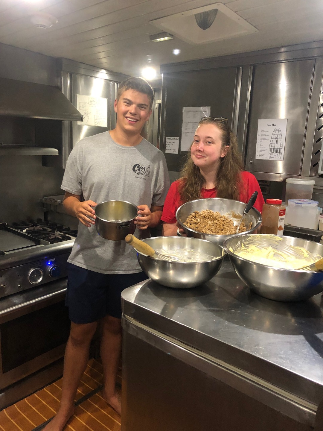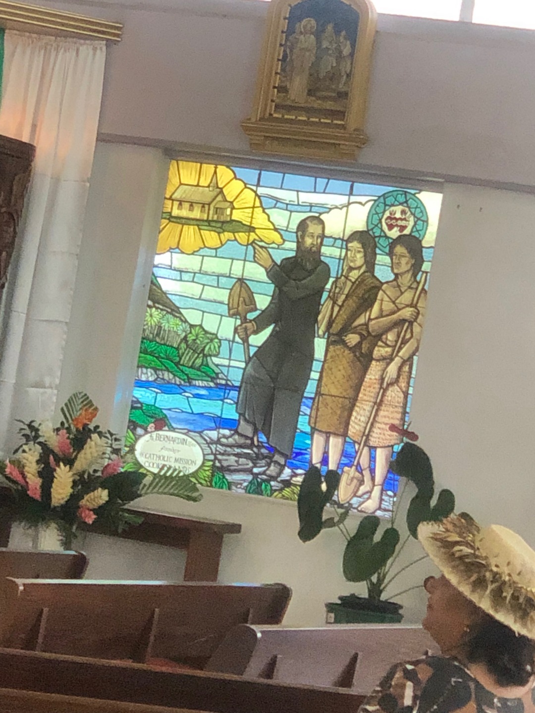 Pictured: Garrison and Anastacia in the galley; sunset in the marina; stained glass windows in church this morning.