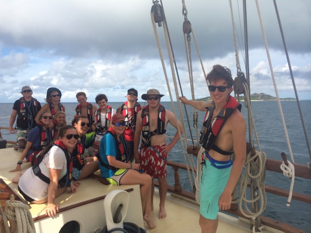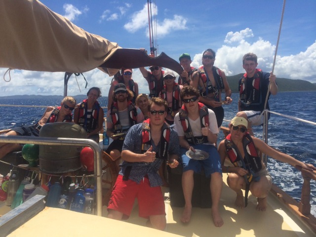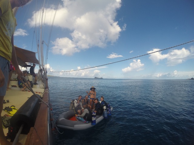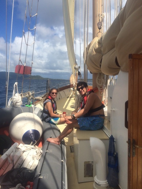 My foggy extra-early morning wake-up was brightened by my first skipper duty of the morning, waking everyone with some deafening 90s hip-hop tunes. Soon after, we devoured some bagels and divided them into dive teams. The special team and I hopped the boat side to our dinghy, wrenched BCDs onto our backs, and made for the dive site. I feel the experience builds every time I dive, and I no longer have trouble with equalizing my ears or balancing the massive baggage keeping me alive. One stingray and many unconcerned fishies greeted us at the bottom and proved a worthy audience for our fin-less back-flips. Apart from clumsily gawking at marine life, we got in a bit of sailing today from Mountain Point to BVI. Teeming with resorts, this usually bustling side of Virgin Gorda was still and peaceful today as we gained familiarity with this complicated boat. Pinrails and the gaff-rigged foresail are new components for me, but I’m sure we’ll be somewhat independent sailors in no time. A nice sunset and stir-fry finished off another awesome day.