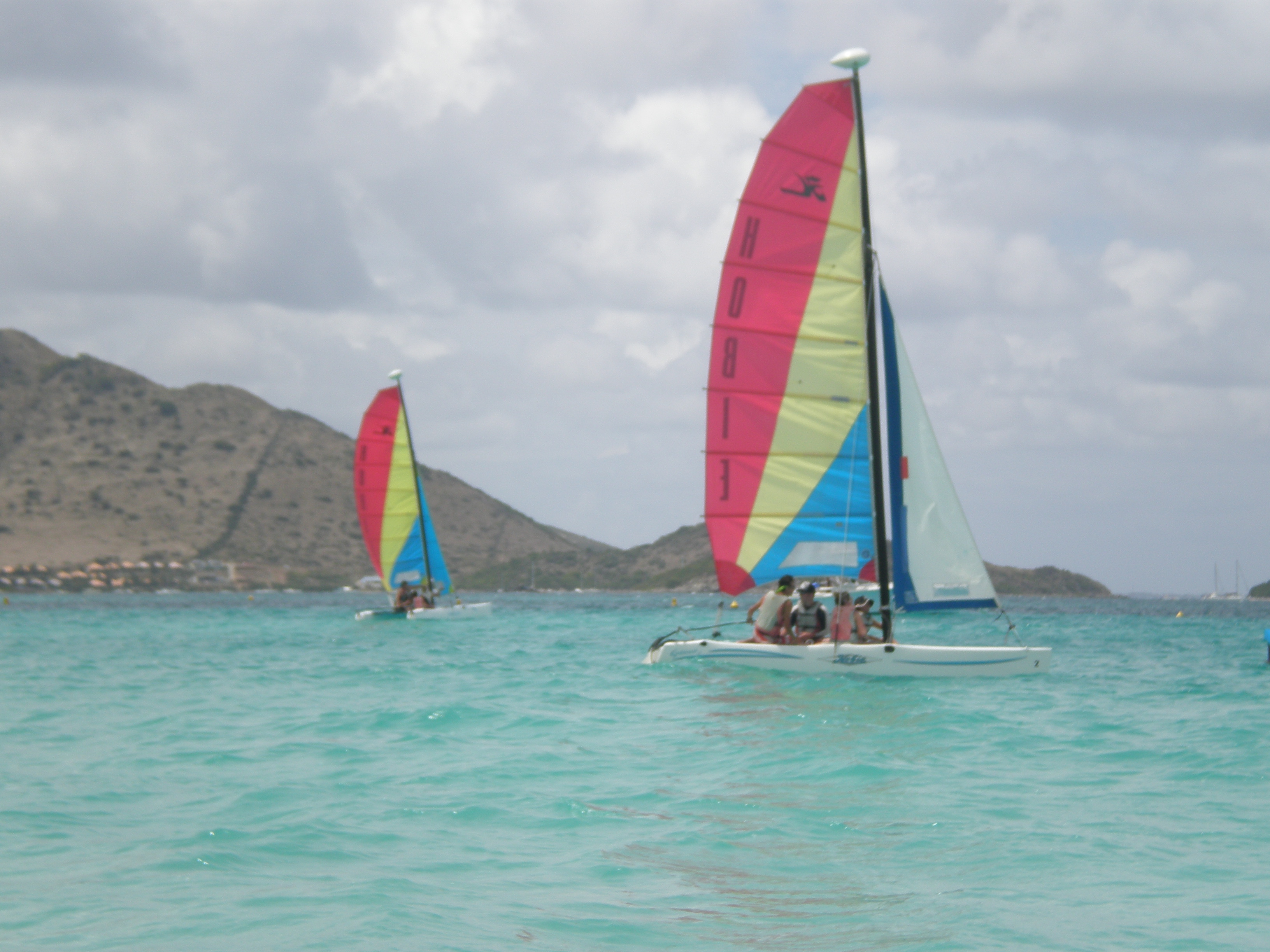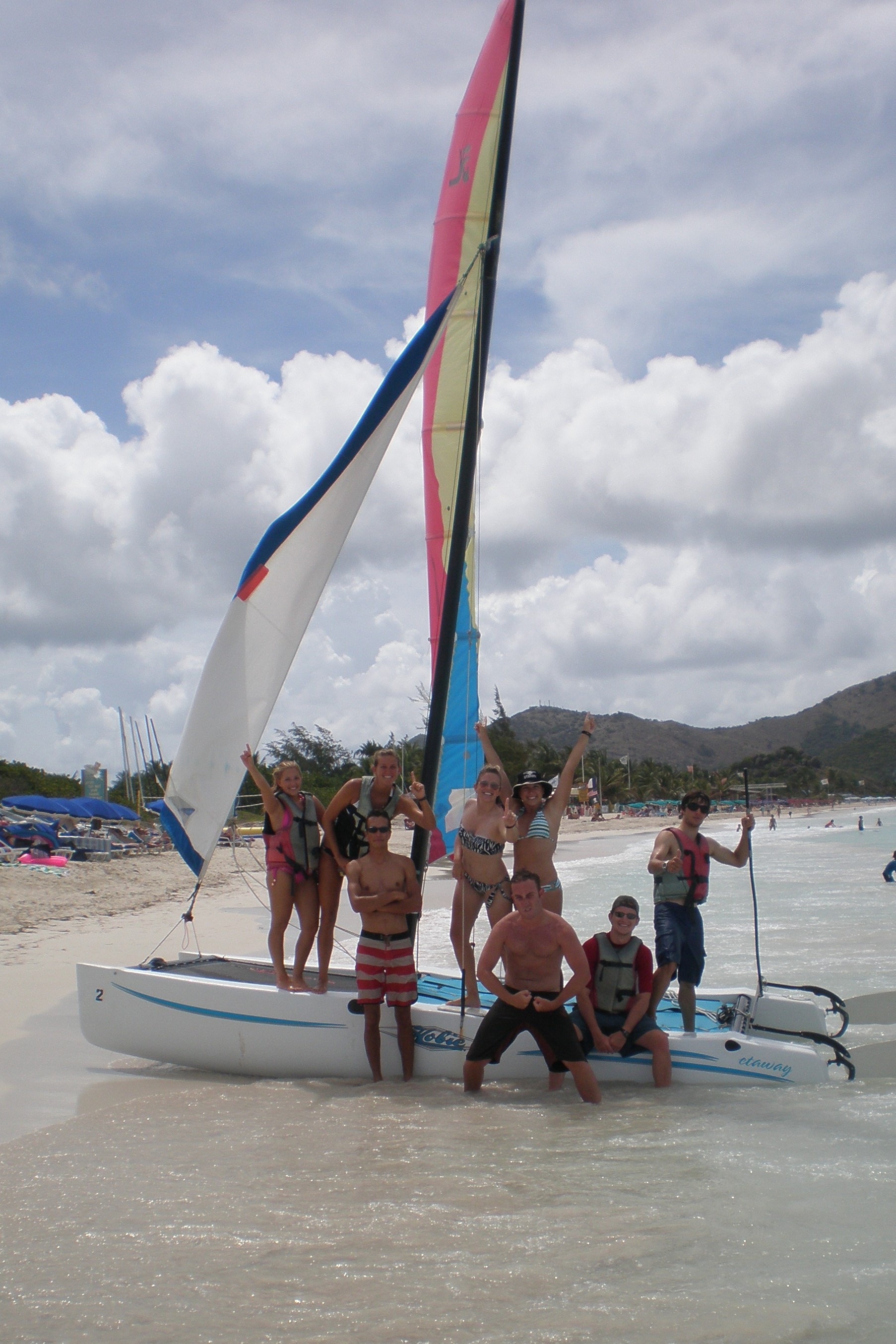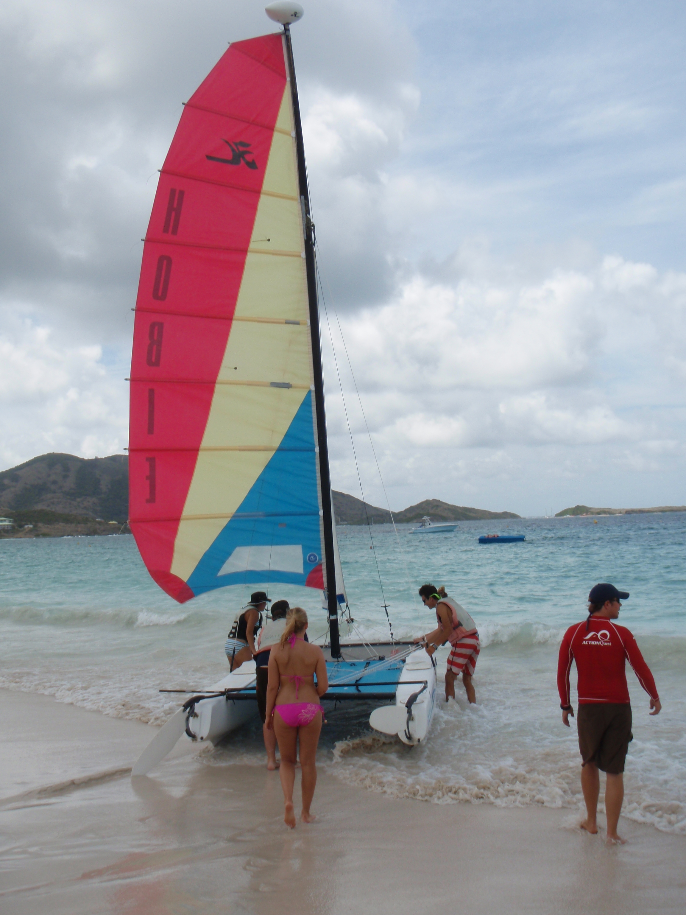 What a beautiful day. We awoke this morning to Captain Dan’s famous pancakes. This was followed by some MTE class and a little PADI work. Many of the shipmates then went ashore in St Marten for some shore time before we convened at 12:30. Our travels today took us to Orient Bay, on the Dutch side of the island, where we rented some Hobie-cats and practiced our skills at small boat sailing. It started off as a race around some buoys, followed by some sail practice and a little bit of beach time. Tonight we had a late dinner and prepared the boat for our sail to Saba tomorrow. Skipper Casey singing out..