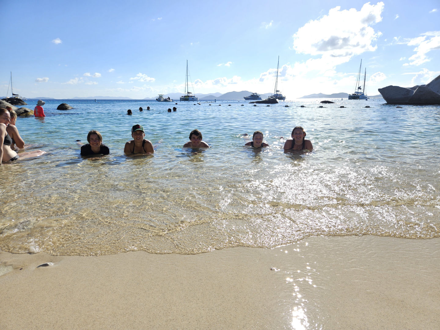 Our fabulous chef group today, Abby Beau and Andrea, made us a pasta salad for lunch before we headed off to the Baths. We loaded into dinghies and were dropped to a swim line, swimming the rest of the way to our first beach and first steps back on land in 5 days. We climbed, swam, and jumped through the beautiful rock formations scattered through the water. Jax and Michael ended our little excursion with a gift. Our top two climbers swung up into a mango tree on the shore and swam them back to the boat on our way back to Ocean Star.