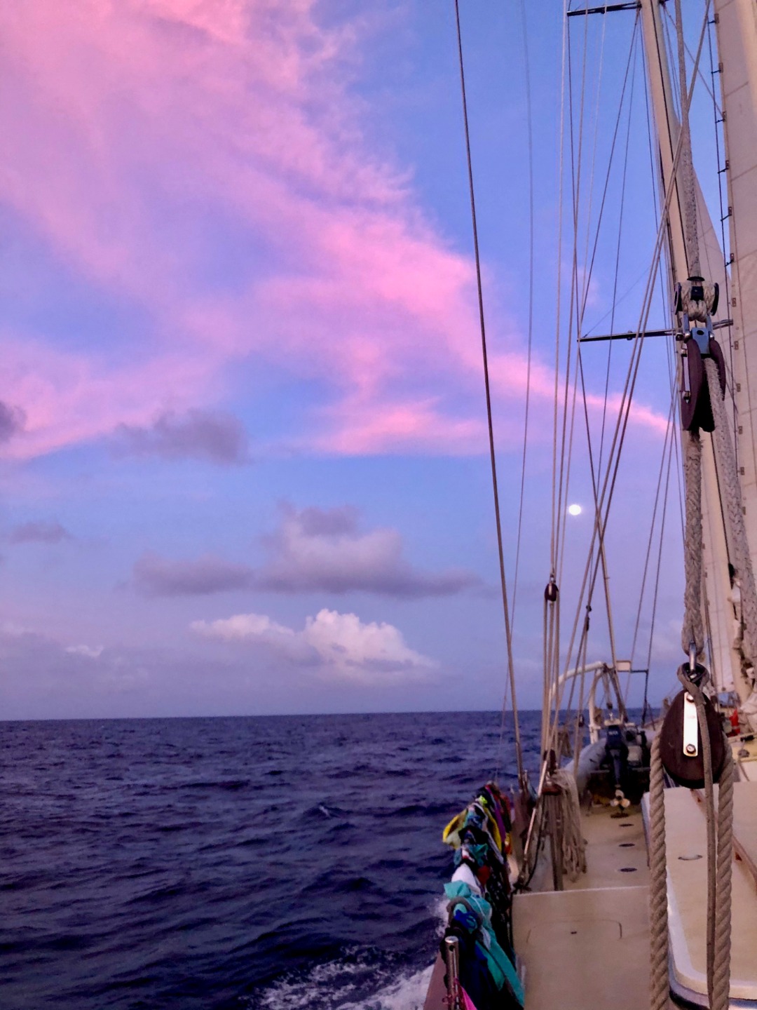Picture 1: The full moon peeking between the rigging during the sunrise