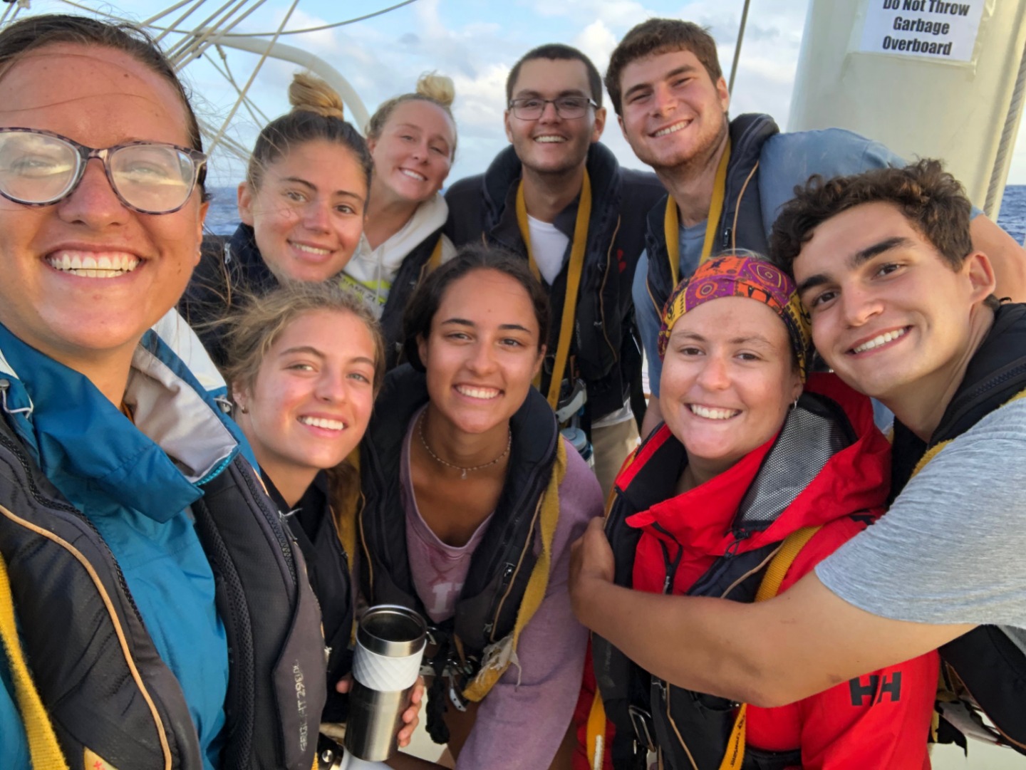 Picture 2: Watch team 2 consisting of myself, Elle, Nick, Gill, Ezra, Riley, Una, Sam, and Elie after our 4-8 am watch