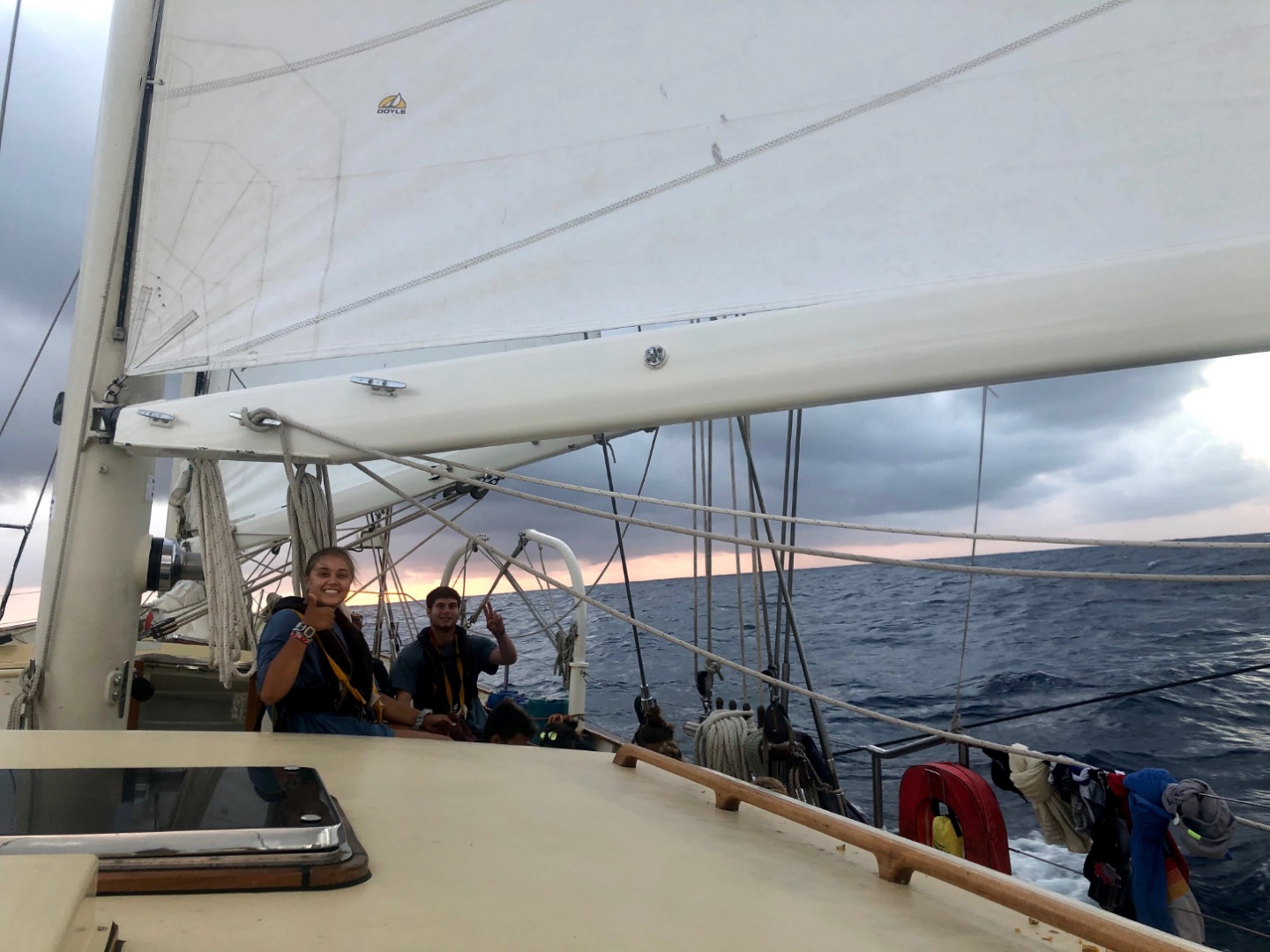 We are officially through day 6 of our passage, which means that my abs have been engaged for six straight days in an effort to stay upright on our ever-rolling Argo. For watch team 2, run by Elle and myself, the day started nice and early with 330 am wake-ups for our 4 am to 8 am watch. We had a big bright full moon last night that lit up the sky for almost the entirety of our watch, even though the beautiful 630 am sunrise. After watch, we were all able to go back to sleep for 4 hours before lunch, which I am always a big fan of. Conveniently lunch was exactly the same as that last time I wrote this blog, pumpkin and sweet potato curry expertly prepared by Tim. After lunch the I taught oceanography, where the students learned all about the currents and water circulation patterns throughout the globe, and specifically the South Equatorial Current that is helping us on our voyage across the Pacific right now. Following oceanography was leadership class and then a nice sunny round of deck showers. Watch team 2 then finished out their 2-6 watch that led us right into our dinner of pork roast and veggies. Right before dinner cleanup, we were also treated to our first of six-time changes of this passage, which also means an extra hour of sleep for watch team 2 before our 12 to 4 am watch later this evening (: