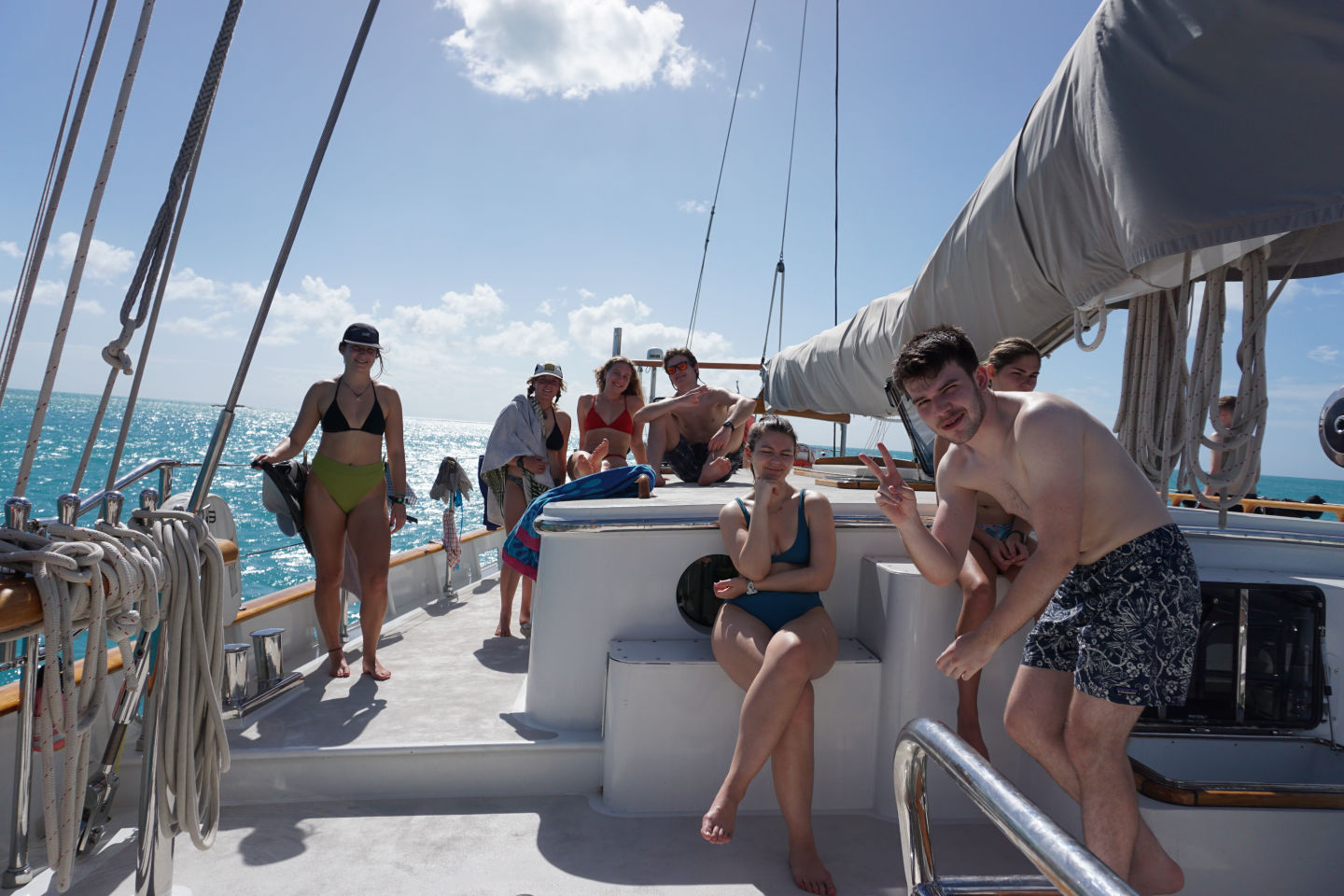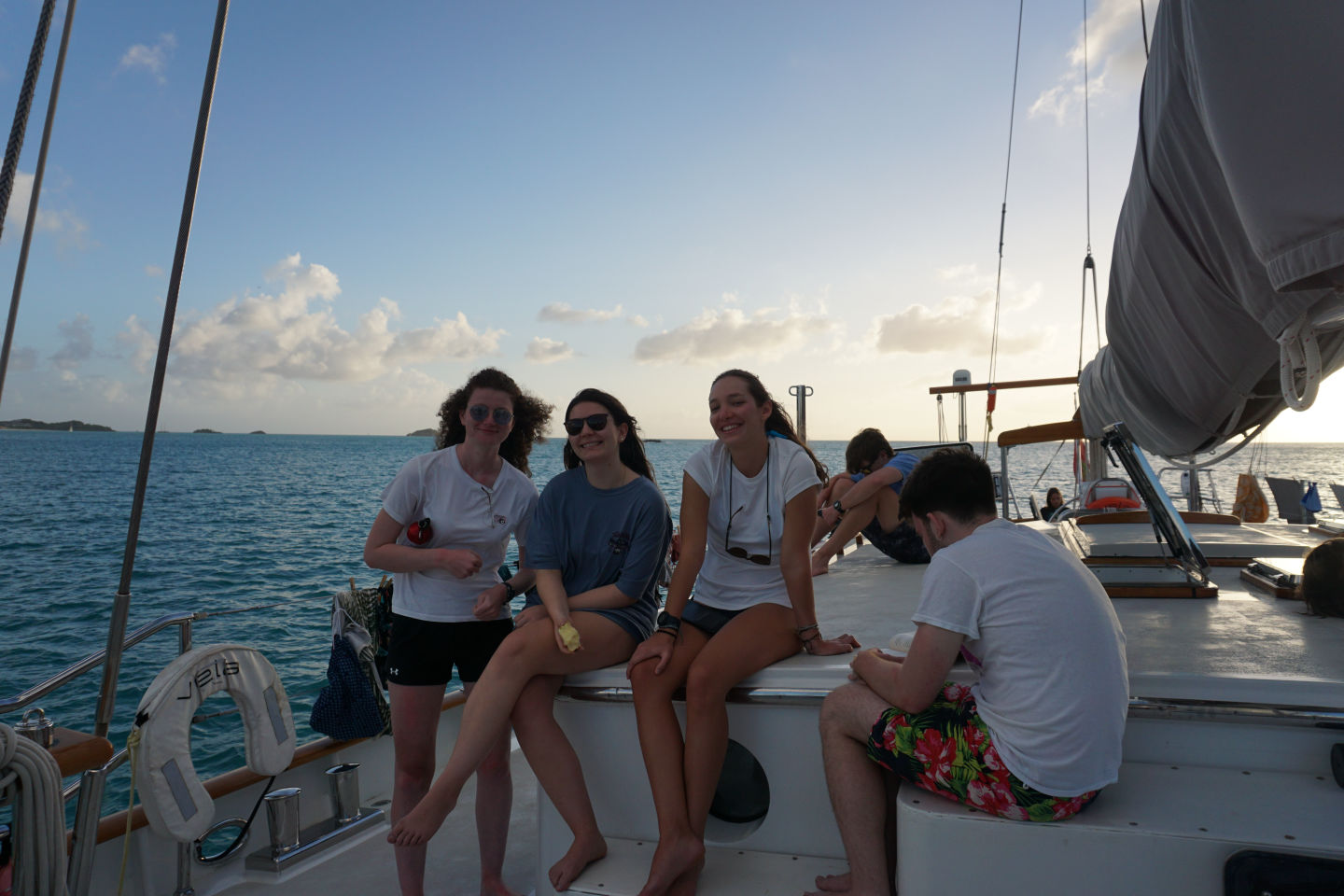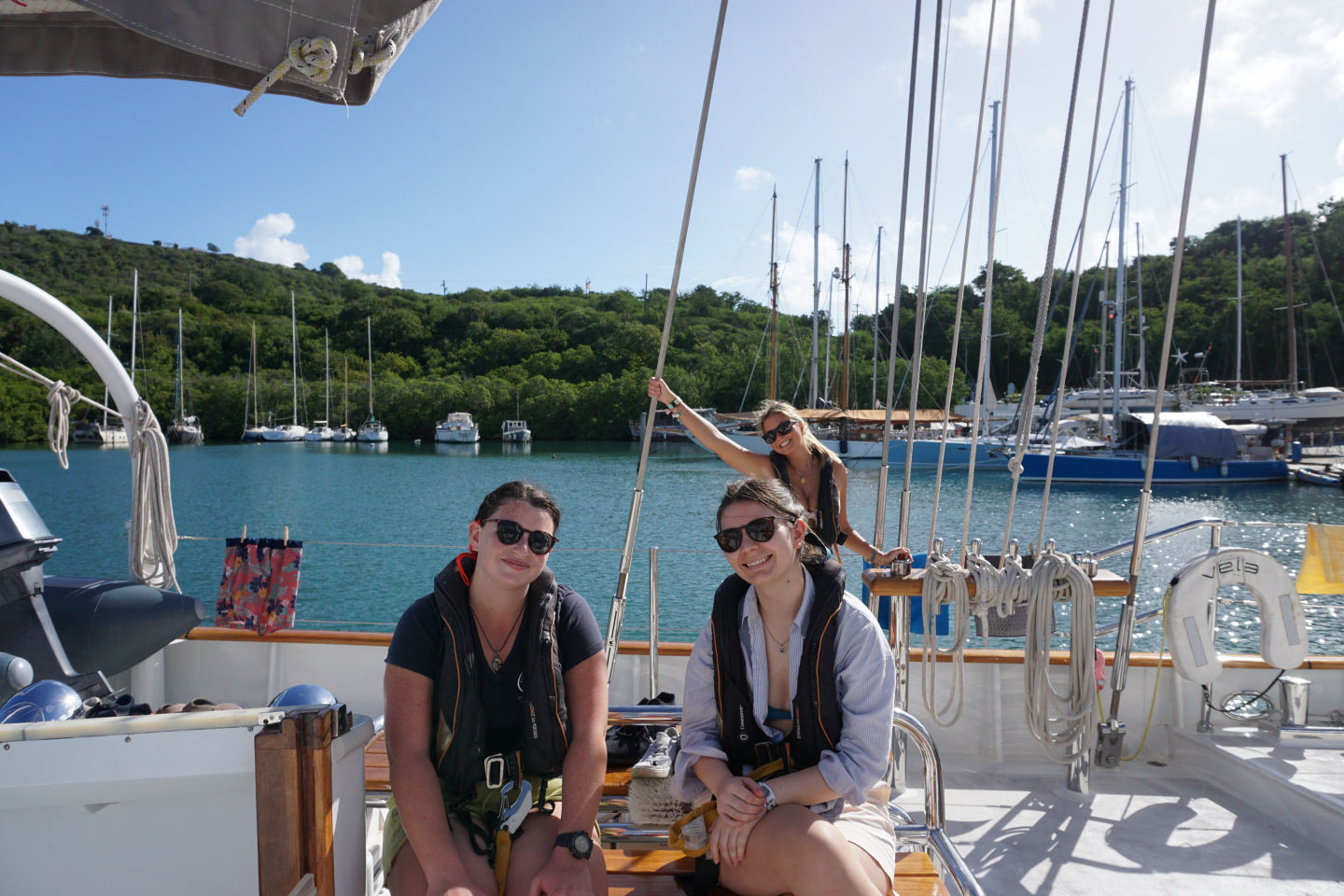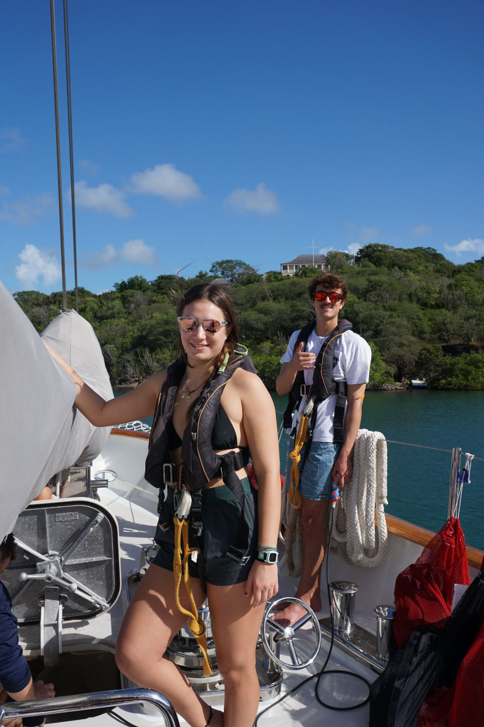 Today was finally the day we set sail out of English harbor for the first time and hit the water after a nice breakfast of croissants and pain au chocolats. It was a real mood lightener (if that’s a word) to get out of the harbor and out to sea as it made the journey and adventure we are about to experience all the more real. While sailing, we saw hundreds of flying fish shoot out of the water, shimmering against the sun-reflecting waves. Then those needing to get qualified for their open water PADI sat in the galley studying away while those who already qualified, including me, got to soak up the rays and chill listening to an envious class below :). After the first set of videos and learning was done, it was time for a quick lunch after arriving at Pinching Bay near Five islands. Then the unqualified group got to jump off the boat for the first time and swam around while the qualified group prepared to have a ‘refresher’ dive, which went anything but what the name suggests. 8 of us got ready to get in with our gear, and 5 of us didn’t even manage to make it under. Carnage. Clara lost her mask when jumping off the boat into the water (luckily, we had a spare), and some of us didn’t manage to deflate our BCDs to get under. I got a few mouthfuls of seawater from my regulator during our equipment check at the surface, to which Allie then checked and so suffered the same fate I did. Luckily, my alternate was working fine, and I was ready to go. Those who did manage to make it under Miles, Ben, and Fargo found that the visibility was about as good as being in a huge sandstorm, so they couldn’t see each other or anything well enough to perform their skills. Before those of us at the surface made additional attempts to descend, they came up to tell us that the visibility wasn’t clear blue as the water at the surface suggested. A few minutes later, the dive was aborted as we’d all rather dive with good visibility to see all of the cool animals the Caribbean has to offer. We all took ourselves out of the water sheepishly after looking like the pros all day.