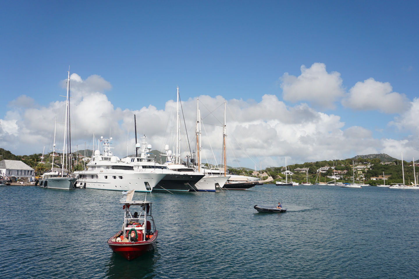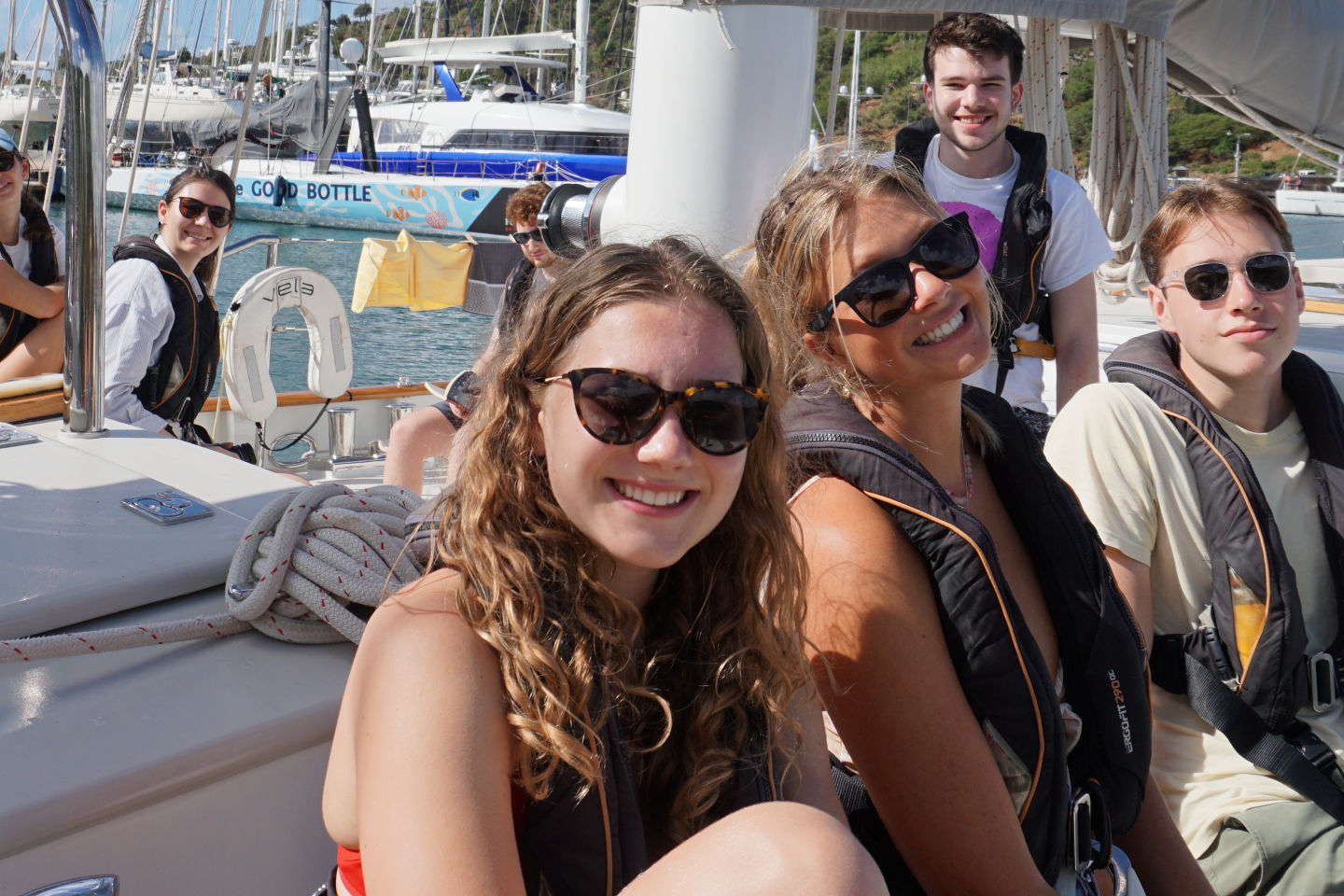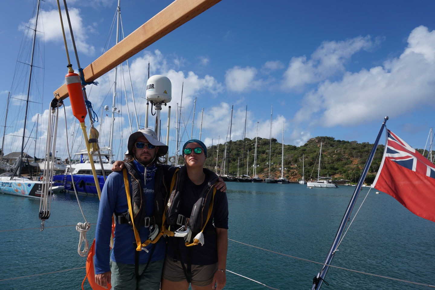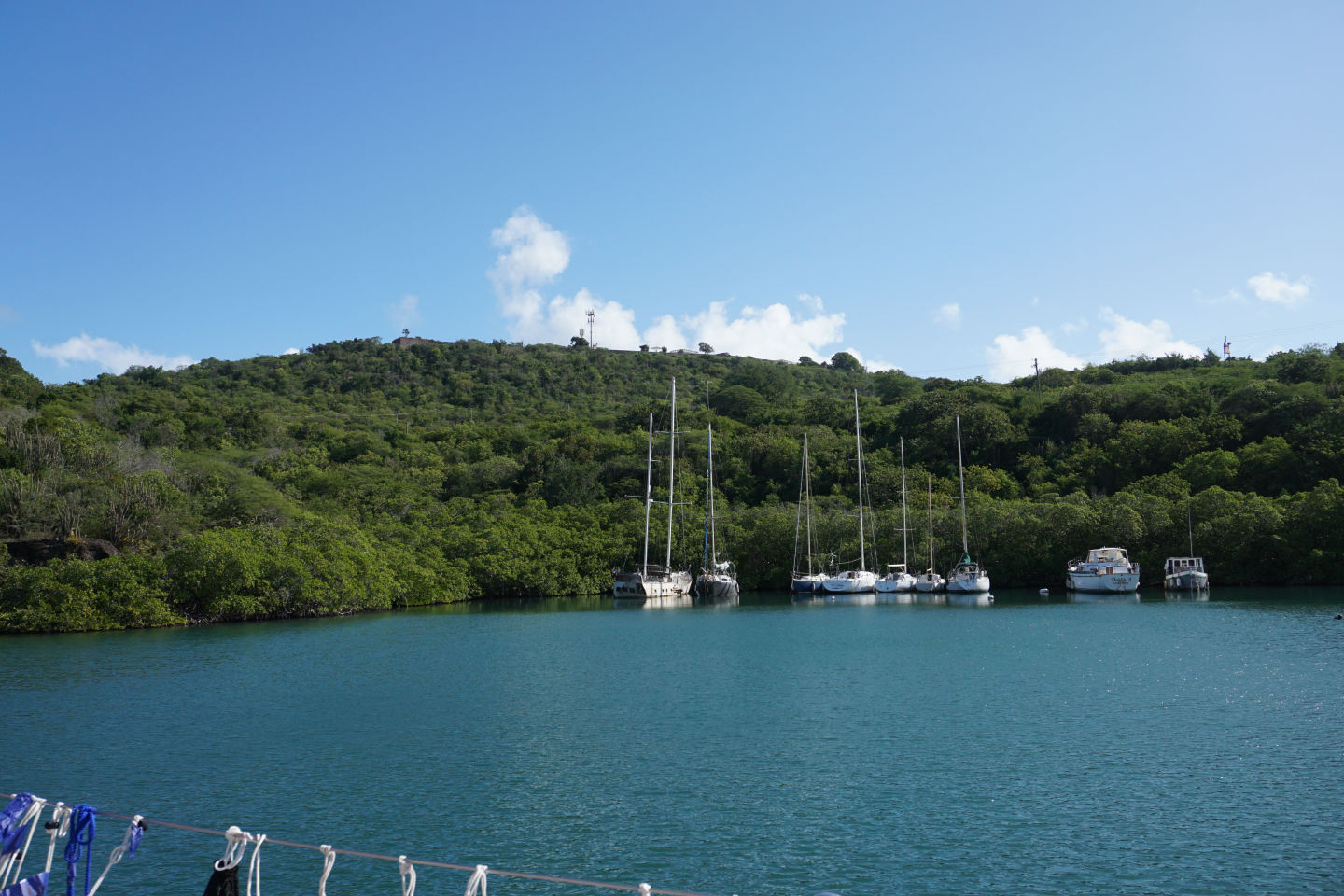 Today was finally the day we set sail out of English harbor for the first time and hit the water after a nice breakfast of croissants and pain au chocolats. It was a real mood lightener (if that’s a word) to get out of the harbor and out to sea as it made the journey and adventure we are about to experience all the more real. While sailing, we saw hundreds of flying fish shoot out of the water, shimmering against the sun-reflecting waves. Then those needing to get qualified for their open water PADI sat in the galley studying away while those who already qualified, including me, got to soak up the rays and chill listening to an envious class below :). After the first set of videos and learning was done, it was time for a quick lunch after arriving at Pinching Bay near Five islands. Then the unqualified group got to jump off the boat for the first time and swam around while the qualified group prepared to have a ‘refresher’ dive, which went anything but what the name suggests. 8 of us got ready to get in with our gear, and 5 of us didn’t even manage to make it under. Carnage. Clara lost her mask when jumping off the boat into the water (luckily, we had a spare), and some of us didn’t manage to deflate our BCDs to get under. I got a few mouthfuls of seawater from my regulator during our equipment check at the surface, to which Allie then checked and so suffered the same fate I did. Luckily, my alternate was working fine, and I was ready to go. Those who did manage to make it under Miles, Ben, and Fargo found that the visibility was about as good as being in a huge sandstorm, so they couldn’t see each other or anything well enough to perform their skills. Before those of us at the surface made additional attempts to descend, they came up to tell us that the visibility wasn’t clear blue as the water at the surface suggested. A few minutes later, the dive was aborted as we’d all rather dive with good visibility to see all of the cool animals the Caribbean has to offer. We all took ourselves out of the water sheepishly after looking like the pros all day.