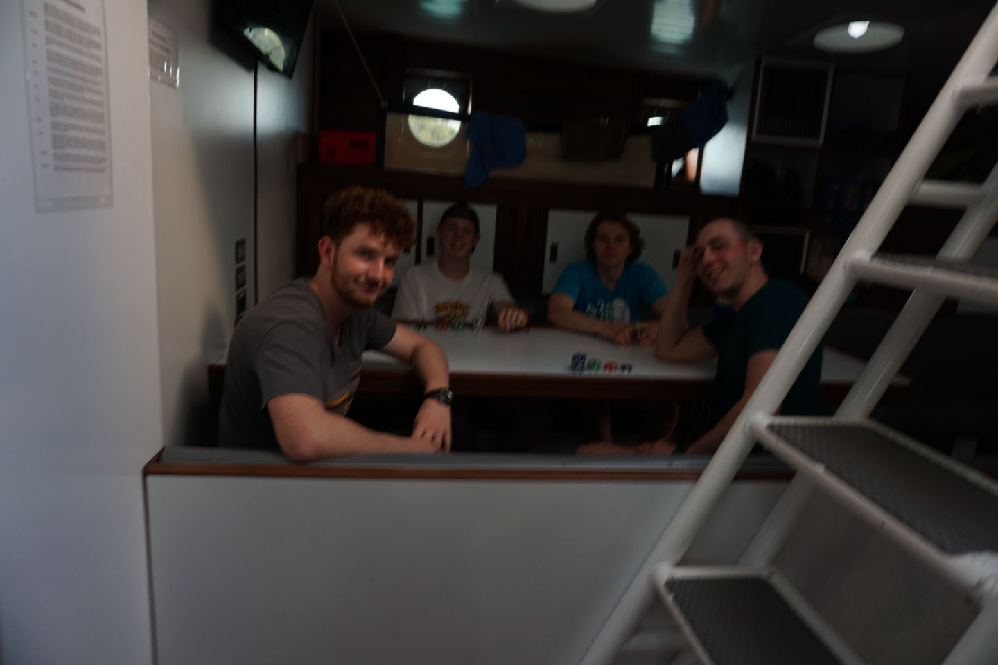 Having finished our “dive,” all the crew took their first ‘ocean shower’ which can be basically boiled down to jumping in the sea, getting out and washing with soap before jumping in again, and lastly, getting a freshwater hose spray for a few seconds and drying off. This was a new and fun experience, and I’m sure we are ALL looking forward to our next one. After another PADI informational video, the unqualified took the plunge to be qualified while others played board games or chilled. By then, it was time for dinner, which was a delicious poke bowl, and after finishing dinner, I wrote this – Enjoy the photos, particularly the blurry one of me, Miles Charlie, and William playing poker lol.