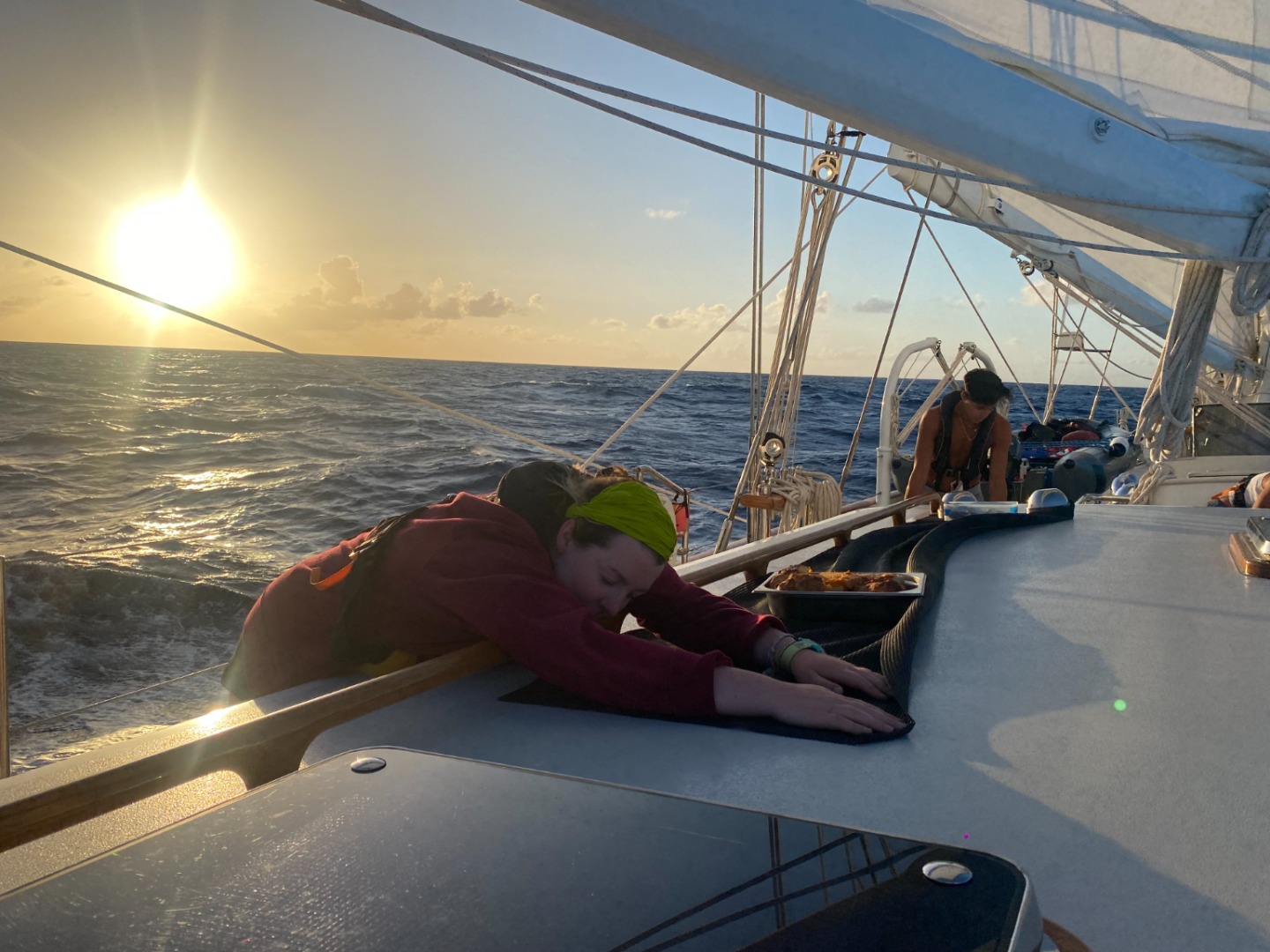 We started our day bright and early at 6:30 AM to hoist ourselves back up the infamous Ladder to test our bodies for disease. To get to The Ladder, our entry to the beach is quite wet, and for those of us 5’4 and under, it’s always nice to start the morning with a clothed swim. As Issy and I mustered our womanly bodies up the mountain, taking a break on every 10th step, we couldn’t help but take in the breathtaking views Saba offered us. After our Covid tests, we made our way back down to Vela and started on passage prep for the journey to the beautiful British Virgins Islands. When booms were topped, and halyards were attached, we then began Marine Bio with Dylan, followed by Nav Master with Calum! It was our first time plotting points on our charts, and I feel like quite the master of navigation today. Once class was over, we began to set sail, and right as our sails were raised, we saw a small whale breaching not far off the port side of Vela. We all rushed to get a better view, but she decided it was time for her to dive deep into the depths of the Caribbean sea. For dinner, we enjoyed grilled cheese and tomato soup prepared by chef Jaycee, which, yes, I did accidentally flick on the main sheet (oops) (thanks, deckie team, for cleaning up all my messes today). All in all, a nice day, and we will miss you so much, Saba!