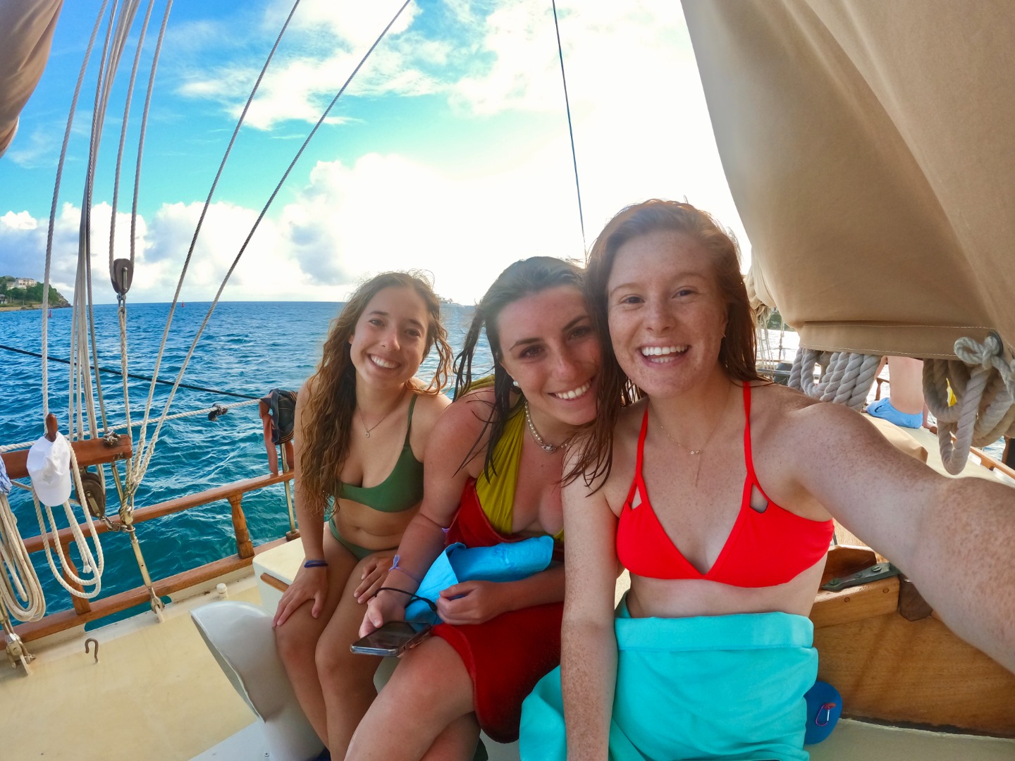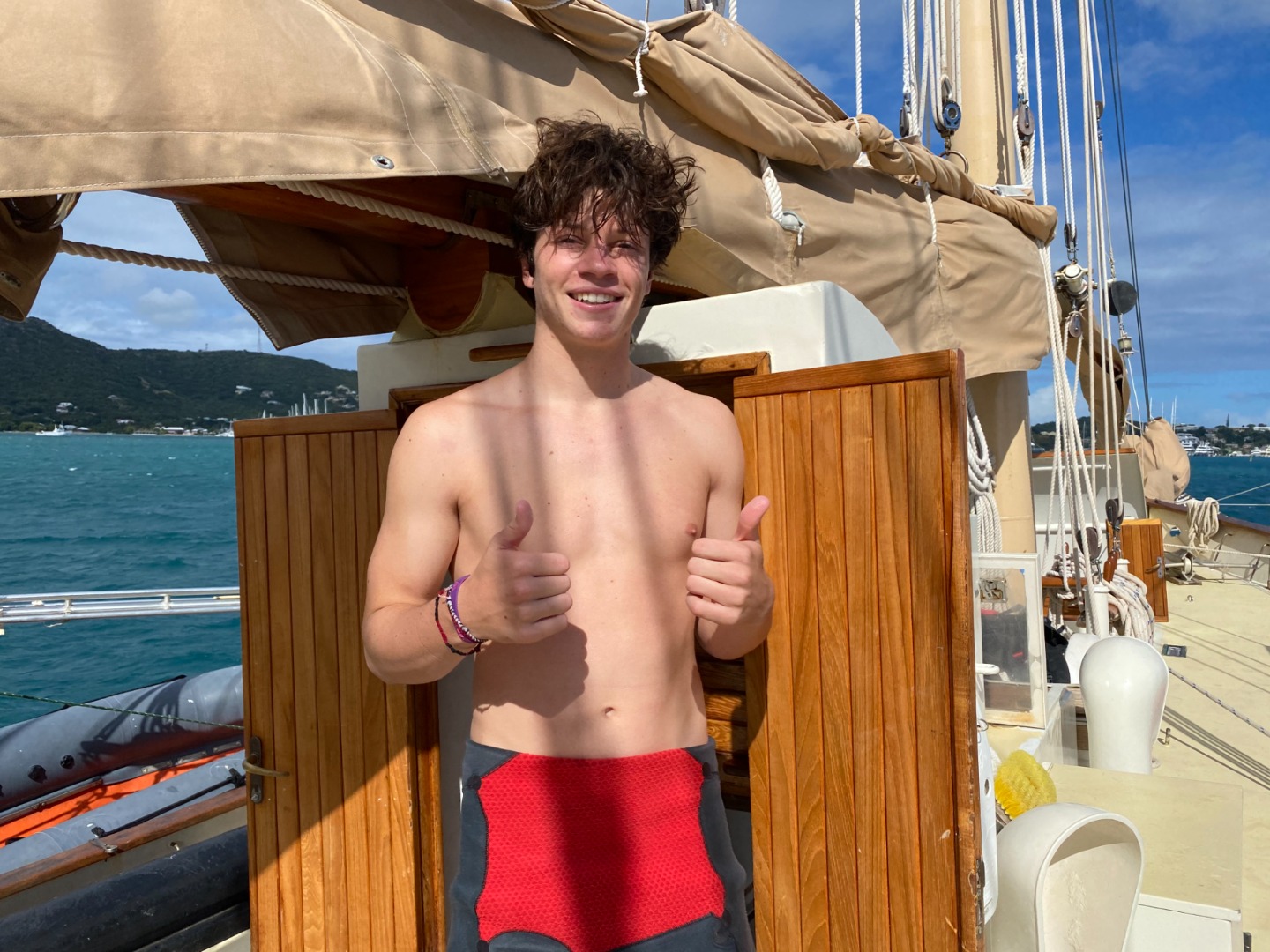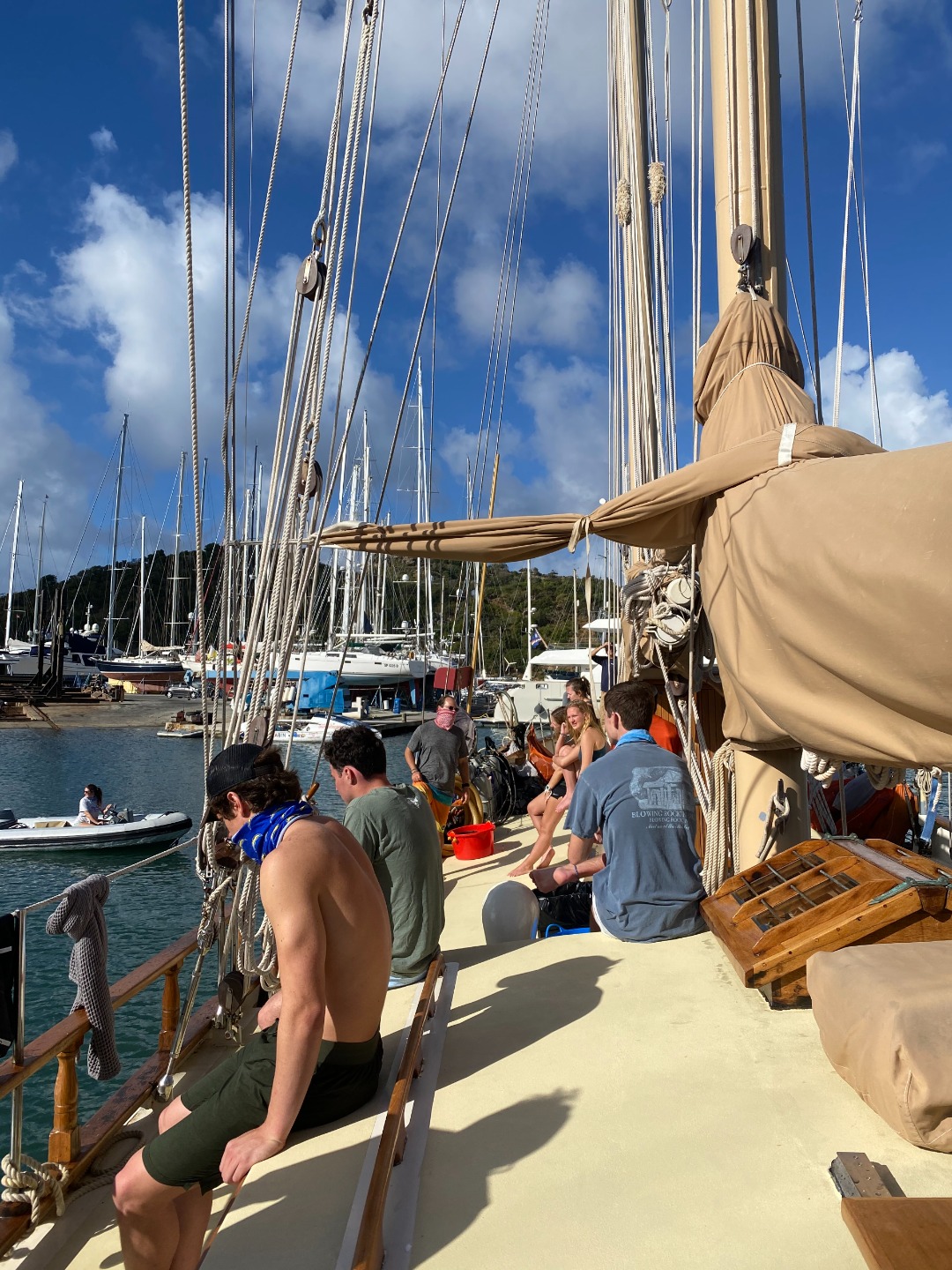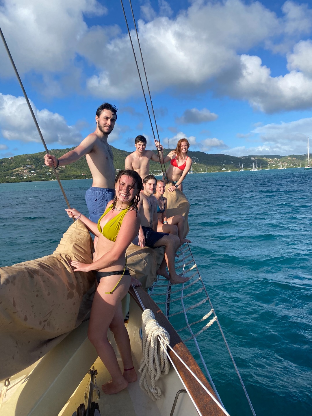 The crew also took their first saltwater showers, which quickly turned into who could swim under the boat, backflips off the bowsprit, and a Pitbull dance party. Pitbull has been the theme of the day, we only know about 10 lines to every song, but that stops nobody from having his wonderful songs stuck in our heads all day. “It’s going down, I’m yelling timber”…maybe not the best thing to be singing as we are hoisting anchors and heaving halyards on the mast, but it’s all good.