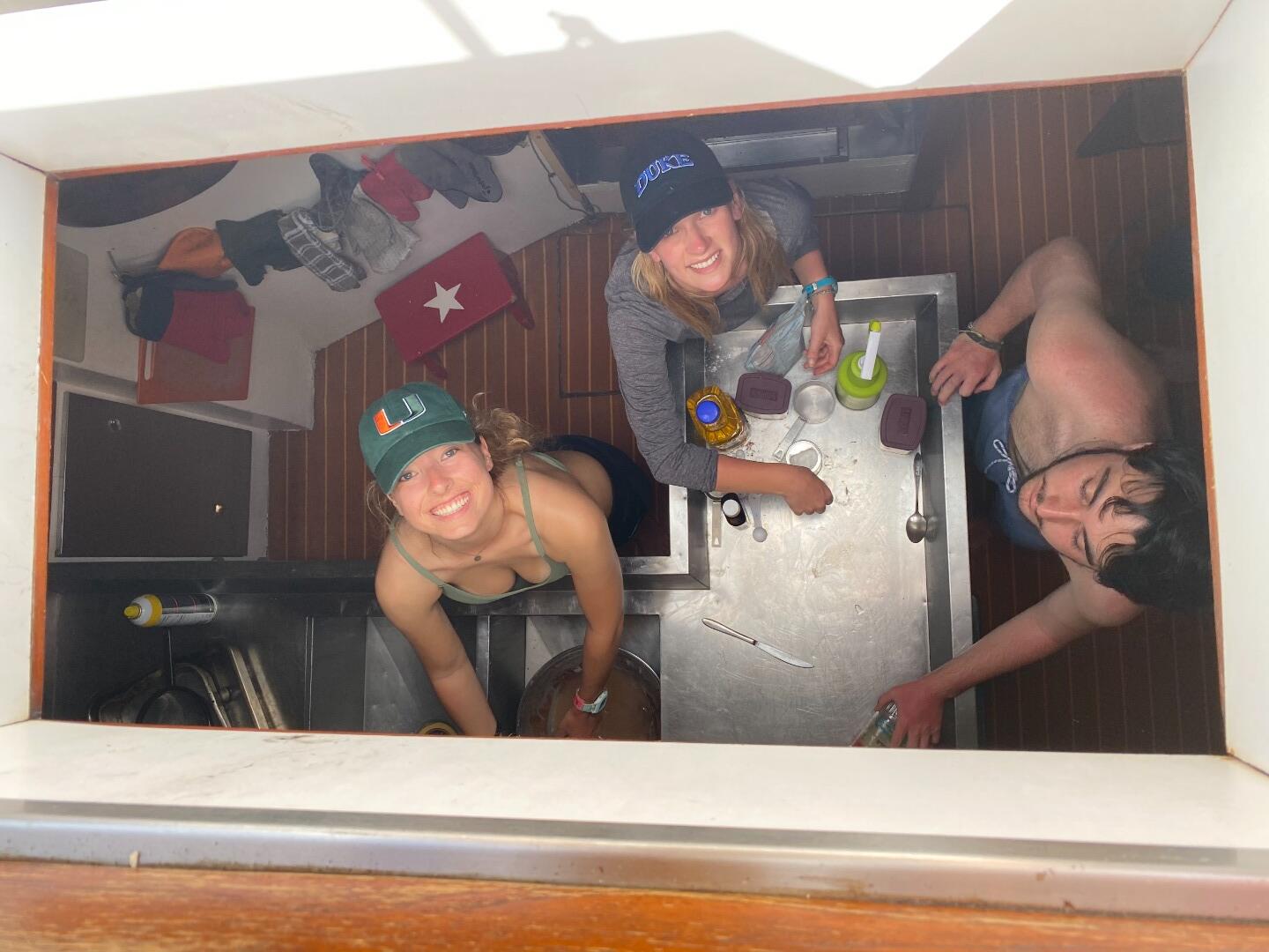 Photo 1- Addisen, Erin, and Johnny cooking up a cake in the galley