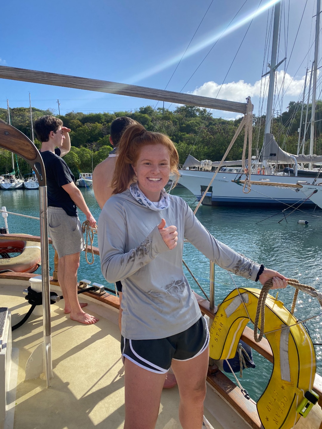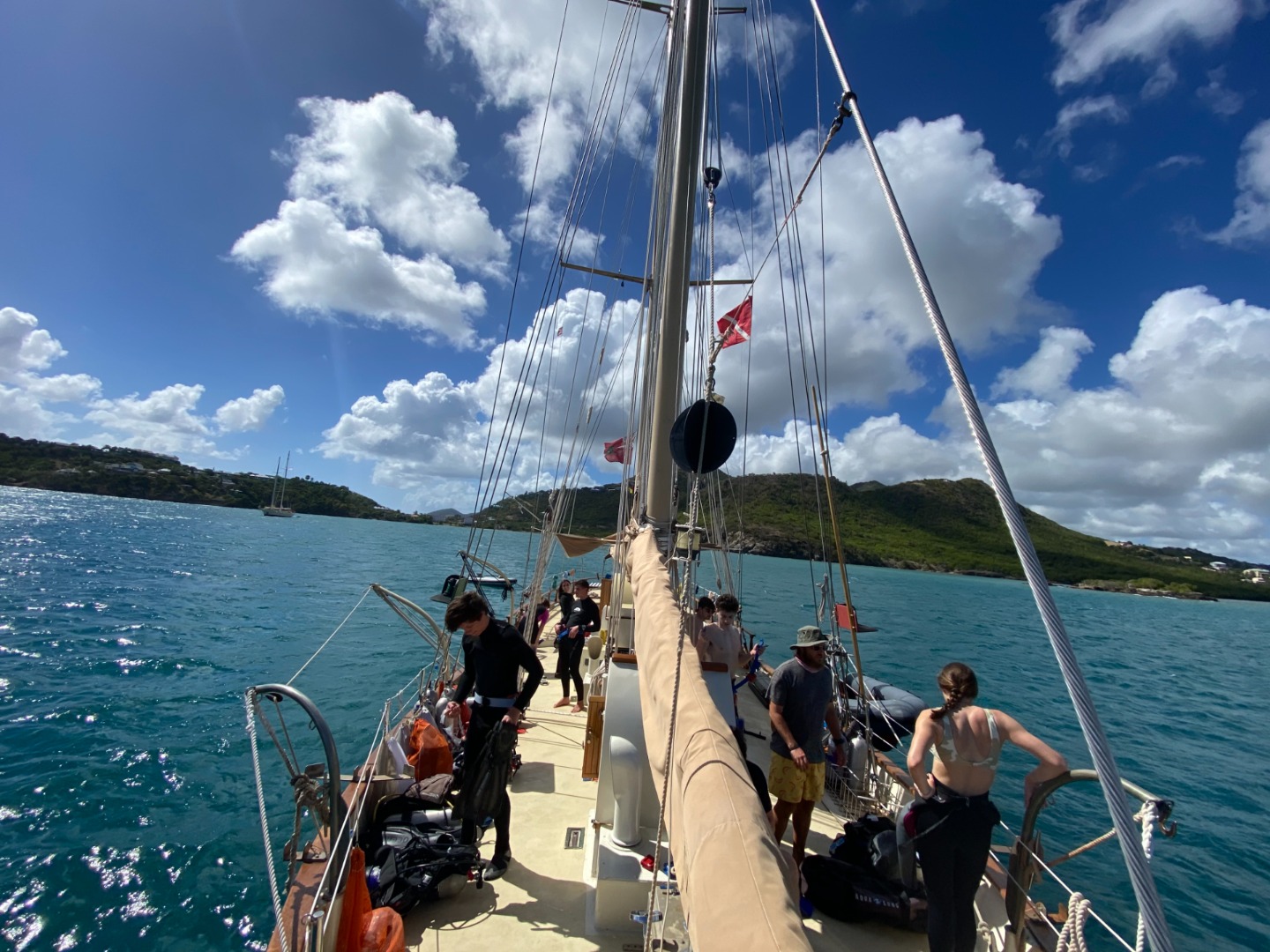 Howdy from the rockin’ and rollin’ Falmouth Harbor. Tonight the crew will find out who has their sea legs and who will need to keep working on them. Today has been a chaotic but very informative day. We all learned what a sandline was, but more importantly, we learned the importance of not sucking it into the prop of our 67 ton home on our way out of the harbor. We quickly learned how to handle fenders, distribute weight on mooring lines, and what to do when almost everything goes wrong while surrounded by multimillion-dollar mega sailboats and yachts. Once we figured all that fun stuff out, we were finally off. Ocean Star made her initial trip with our crew out of the gross water of the harbor into the blue glacier Gatorade water of Antigua. A quick trip around the cliffs, and we came up alongside Argo, waving and blowing our horns to the other shipmates. Anchors set, dive kits put together, and lunch demolished, the shipmates getting certified jumped off the boat for their first open water dive. The already certified divers did some free diving around the boat and baked a birthday cake for Meg! Happy 20th Birthday, Meg!