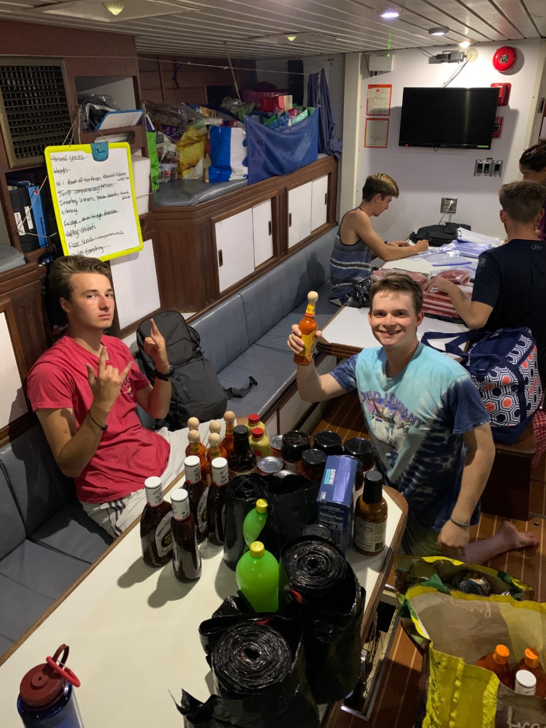 T-minus two days until Argo departs! After a fantastic wakeup from Skipper Ethan blaring The Final Countdown and Kanye West in all of the bunks, the Argo crew ate a delicious breakfast and then started a deep clean. Before the clean commenced, the crew had the choice of bringing all the dirty laundry on deck to be sent off to the laundromat. Most people did. While we were cleaning the boat, we also got to change our sheets which were nice because the starboard six-man had a pungent smell protruding from it. Now it has ceased to exist. After the deep clean, we had lunch and then a short period of free time before we had to go refuel Argo at a local fuel dock. After Captain Tim miraculously parallel parked Argo, we sat there for more than an hour eating and fuelling about 2,000 gallons at 13 gallons a minute, give or take. After the long wait, we did squeeze and remained snugged up on the fuel dock for the night. The crew began a heated “Spit” tournament. The tournament ended with one victor and the crew passed out in their bunks catching some Z’s before the next day.