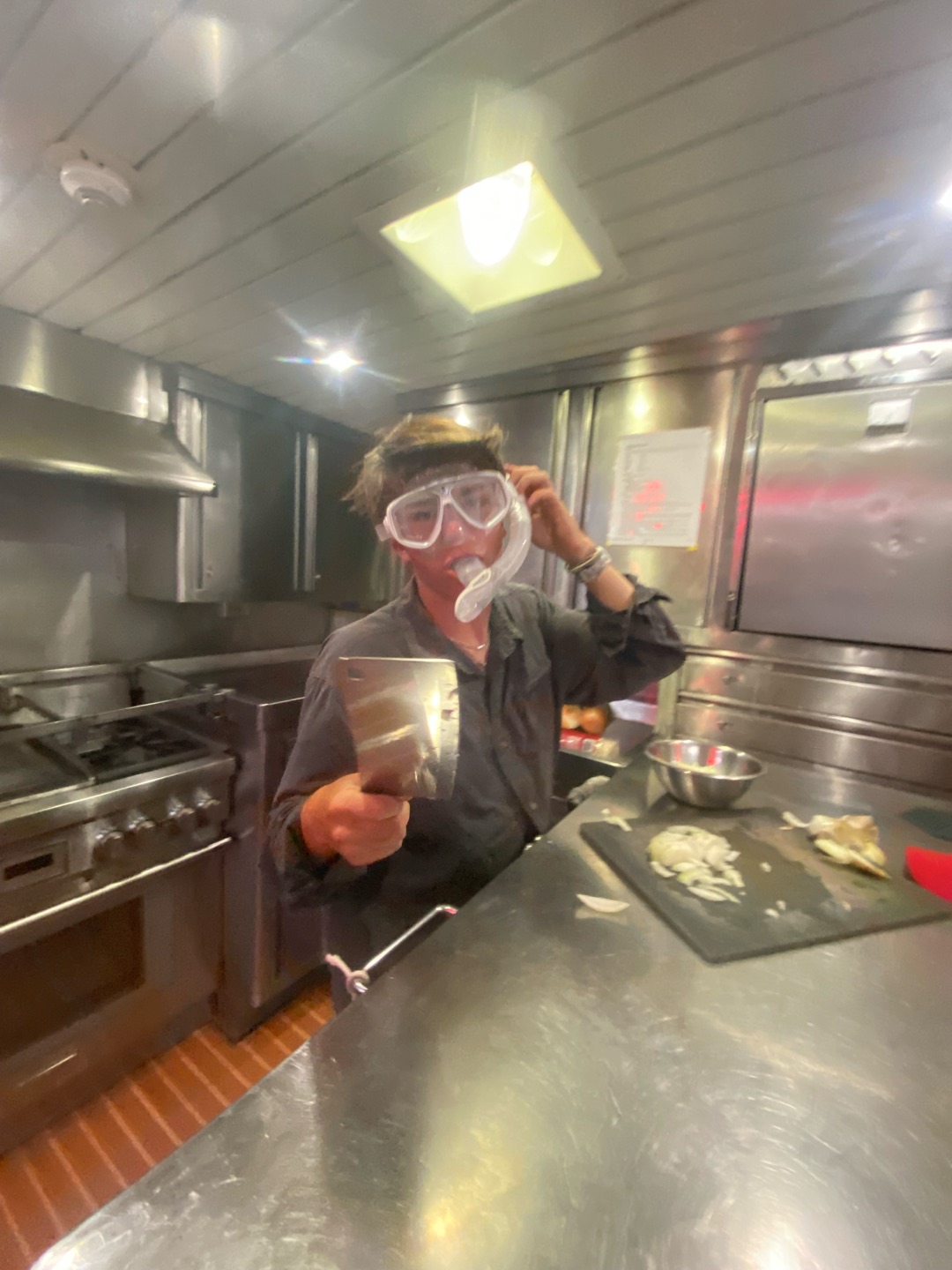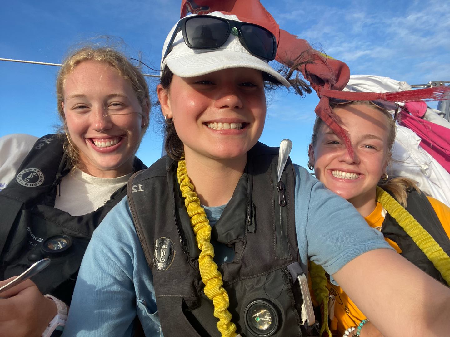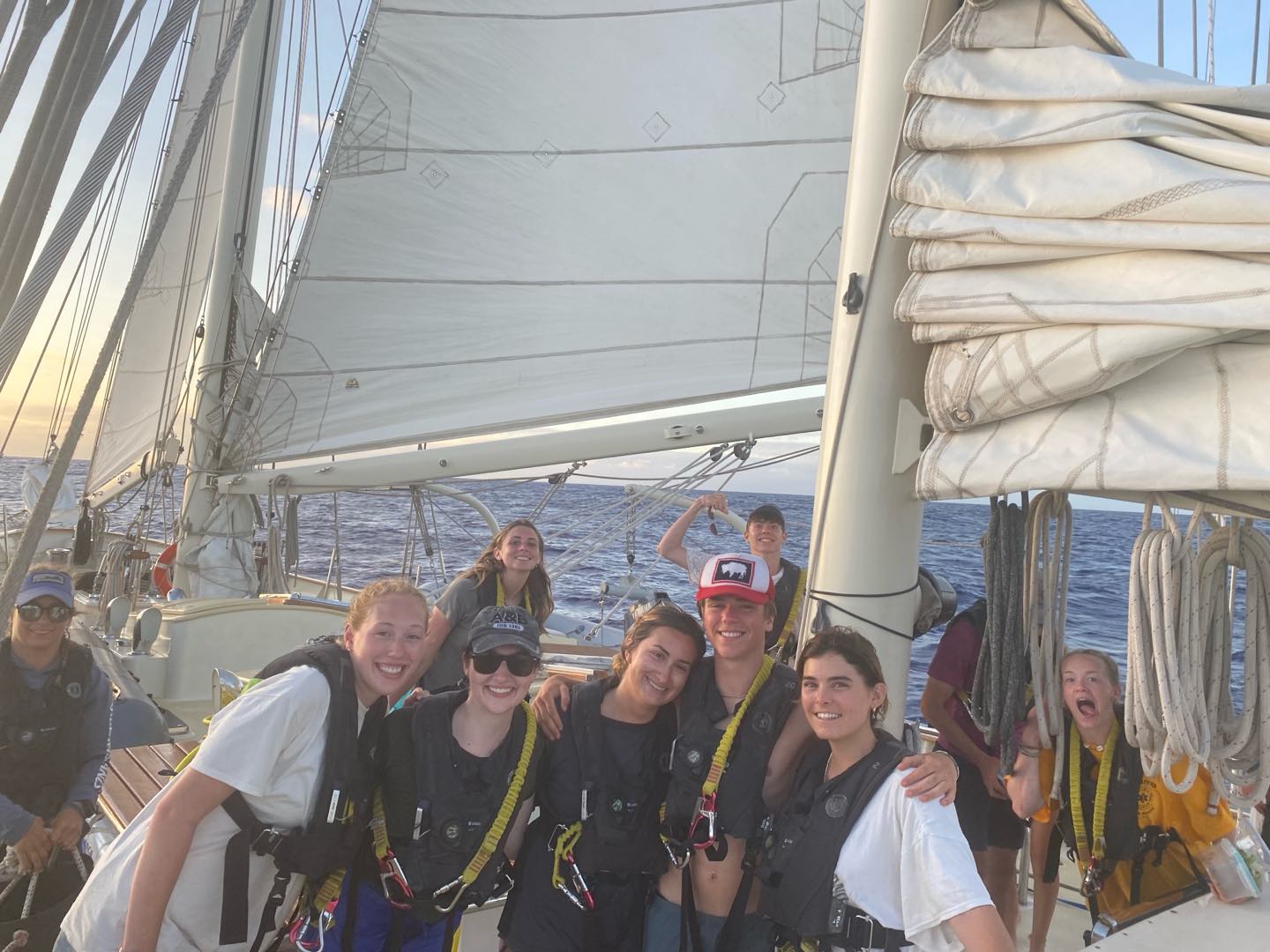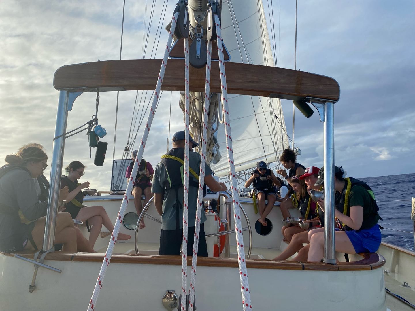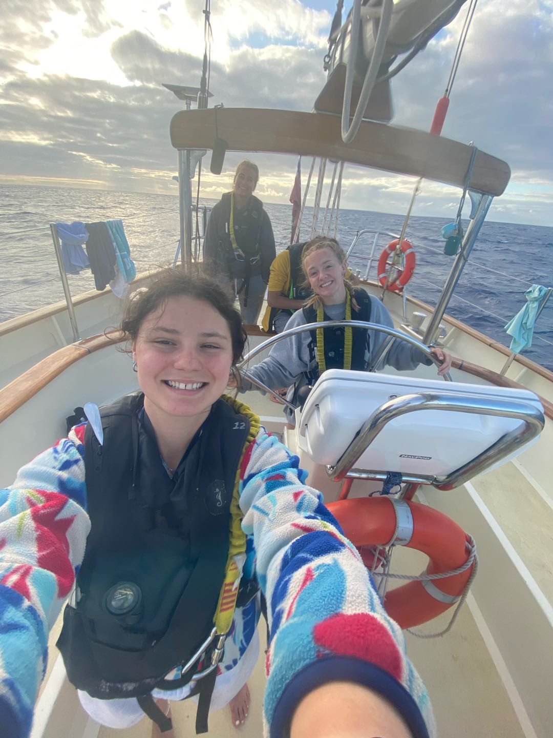 Hello from the international high seas!! Since the last blog post, we have had a little bit more celestial navigation practice from a night of very bright stars, guitar tunes, and lots of laughs on the night watch. Today (or maybe it was yesterday; I have completely lost all track of regular time in the real world sense), we crossed over from Saint Helena territory into international high seas. We are true and thought back on the passage. We started off strong this morning with a new Helmsona! Olympus was steering Argo for four hours straight with watch team one on the 12 am to 4 am watch It was probably the hardest watch shift to face this feat thus far and also a very, very rainy one after such bright stars on the previous watch. I believe Olympus was the fourth one to gain this title after Isaac, Syvler, and Eli. She chose the name Helmlock for her title–the best part of this accomplishment. Then my watch team (watch team two) had a rather quiet watch as we got back into the groove of passage on day 3; that was until we started talking about ice cream and sandwiches and how much ice cream we would eat once we reached Barbados but after Fernando and Devil’s Island of course. And it’s a lot. You guys have no idea how badly we are all craving ice cream. This boat really has you appreciating the little things. I think collectively, as a boat, we could all eat at least 15 gallons. After that, watch team 3 took over operations on deck for the work watch from 8 am-12 pm. They managed to get some good scrubbing in, and Cecily was working away sewing our torn flying jib, which hopefully should be up and running soon! However, we might not need it anytime soon because Calum said that the wind is looking rather weak for this passage. Apparently the doldrums might have moved down closer to Fernando?! I didn’t even know they could do that. Anyway, Benny made us lunch with some help from Sylver and Kiki. They made BBQ chicken and chickpeas, and it was yummy and definitely a crowd-pleaser. It wasn’t looking so hot for a minute there, but Benny managed to pull it off quite nicely. After lunch, we had oceanography with Meg, where we had a short little quiz, and then seamanship, where we did a lines test. Essentially, we named every line aboard Argo. And if I’m not wrong, everyone did rather splendidly. Now, we can confidently go to any line on deck without wasting any time to get those sails going and happy. Watch team two, then take over again on the deck while the rest of the crew maybe took some very precious and seldom nap/study/chill time. In between then and dinner, Calum finished going over the Colregs section of PSCT class with Zac, Kiki, Ben, and me, very exciting stuff. Just now we finished up dinner of some chicken or veggie Pho and had our squeeze circle. That is after a Darien-organized dance part,y of course. We also had some great appreciations of the day and maybe some even better embarrassing stories shared that I wouldn’t dare to expose on this blog.