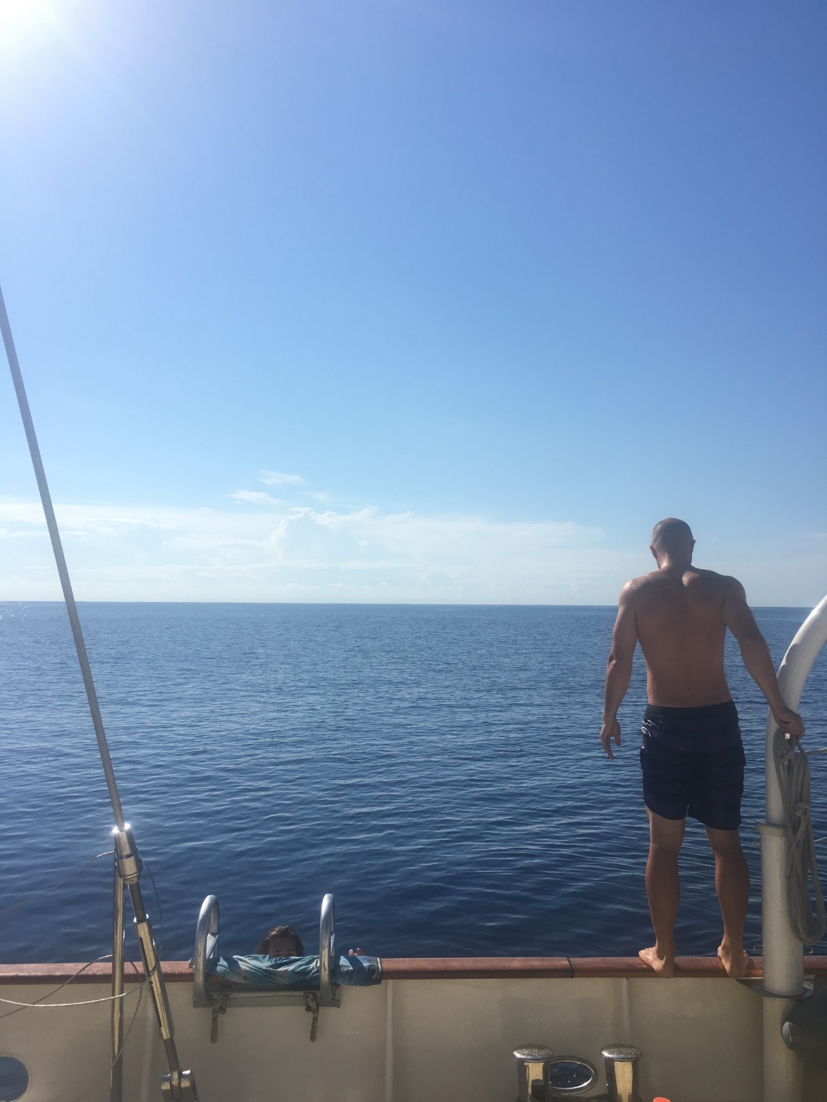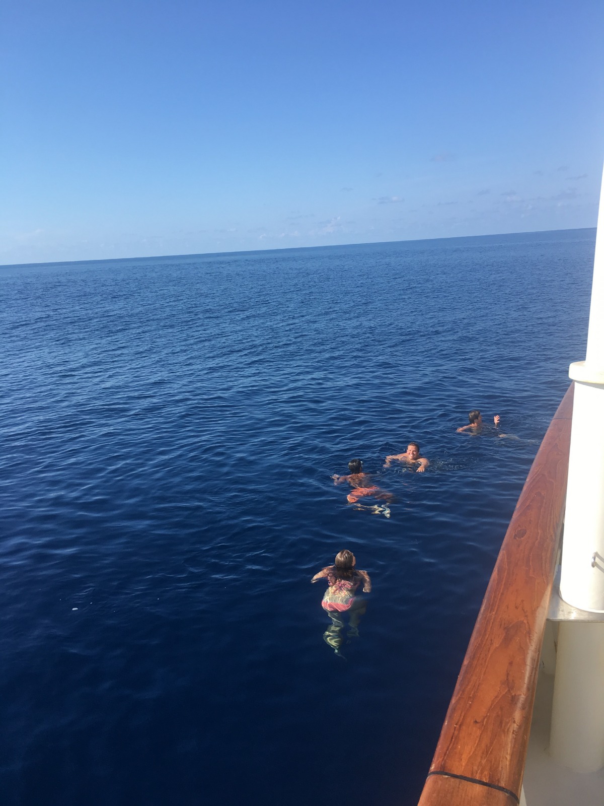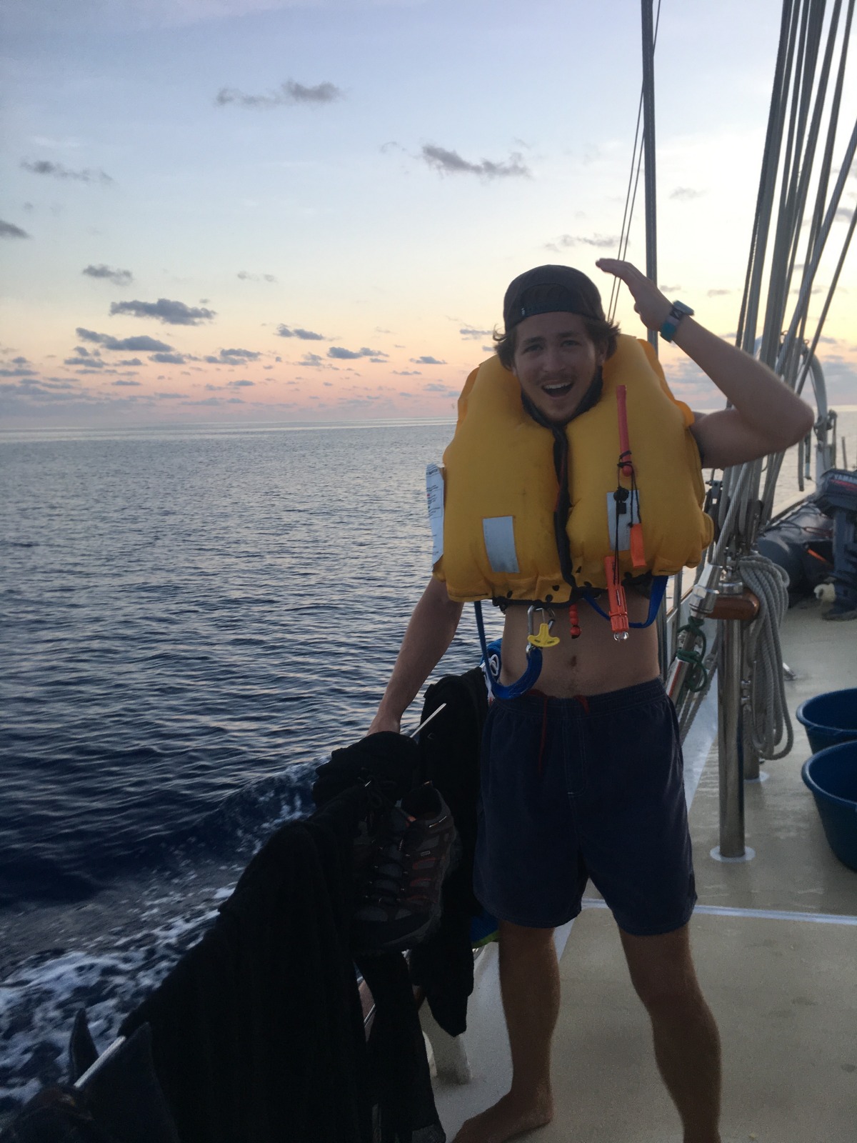 Day 3 into our ~900 nautical mile passage from Panama to the Galapagos. For lunch, Chef Grantis put together a delicious meal of vegetable curry, which was only topped by his dinner, stuffed peppers, and stuffed tomatoes. We decided, since we are doing well, to stop again and jump back in the water, this time without the tiny, annoying jellyfish that we had yesterday. It was a pretty good day. All in all, not a lot happened until right after dinner. While Tom was getting saltwater for the dishy buckets, he accidentally pulled the tag on his lifejacket, causing it to inflate. The look of surprise on his face was priceless. Tomorrow we have our first Oceanography exam; hopefully, everyone has been studying.