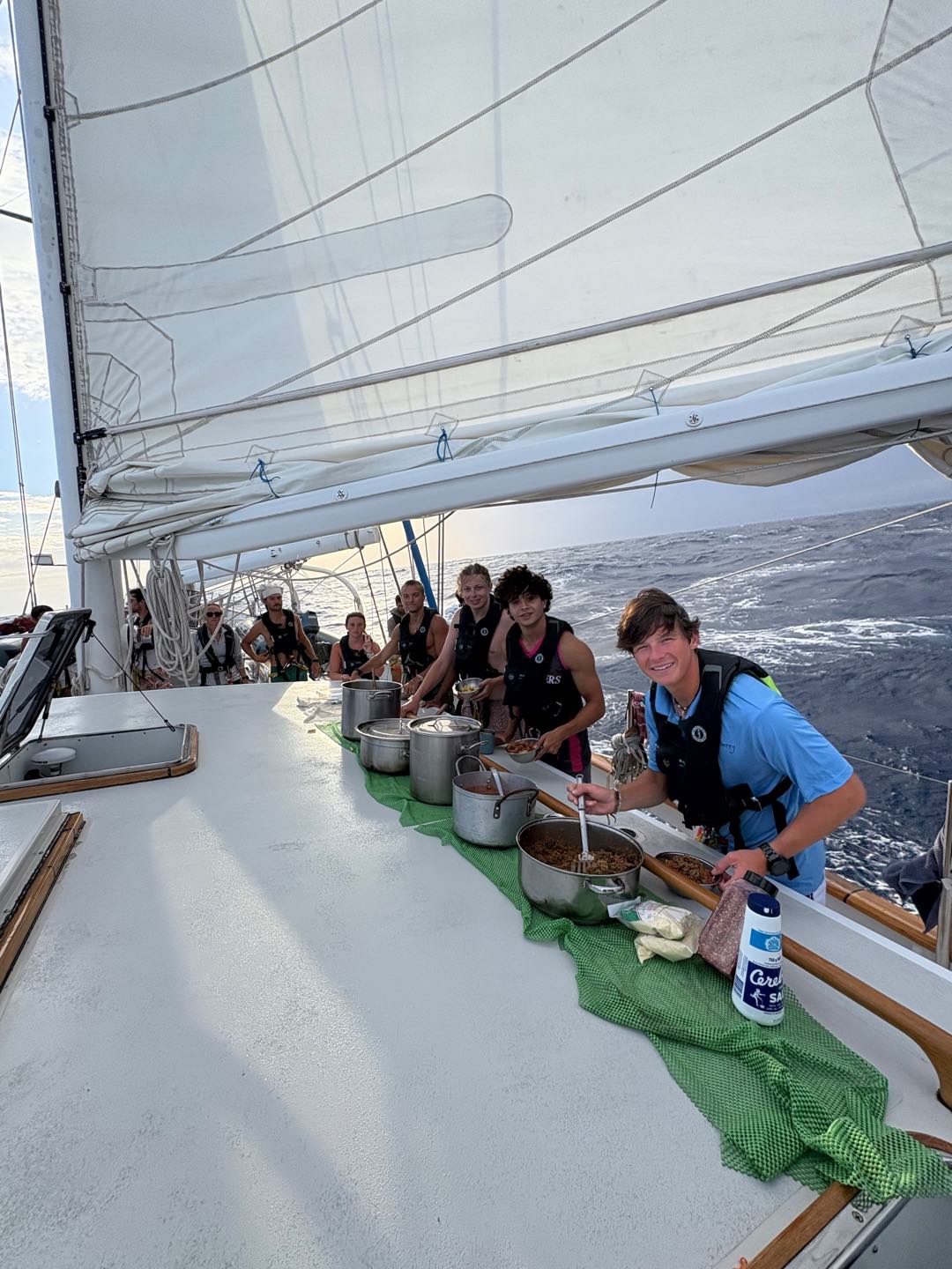 As we sail on, the students are getting more and more comfortable down below in the Galley, and both meals today were great. The chefs provided the “feed we need”.