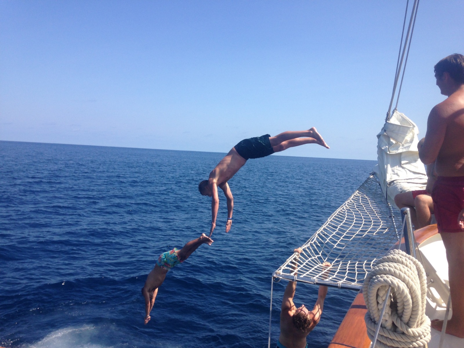 Photo 2 – Spence and Nick jumping off the bowsprit during our mid-ocean showers