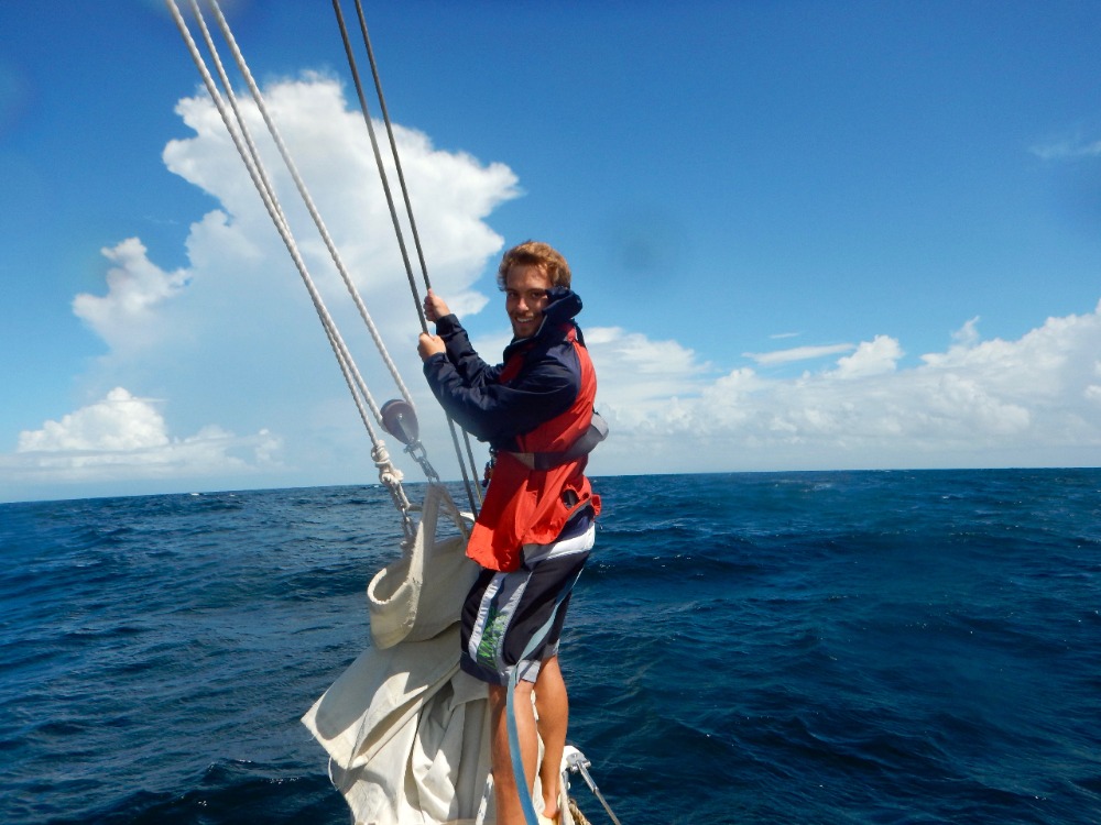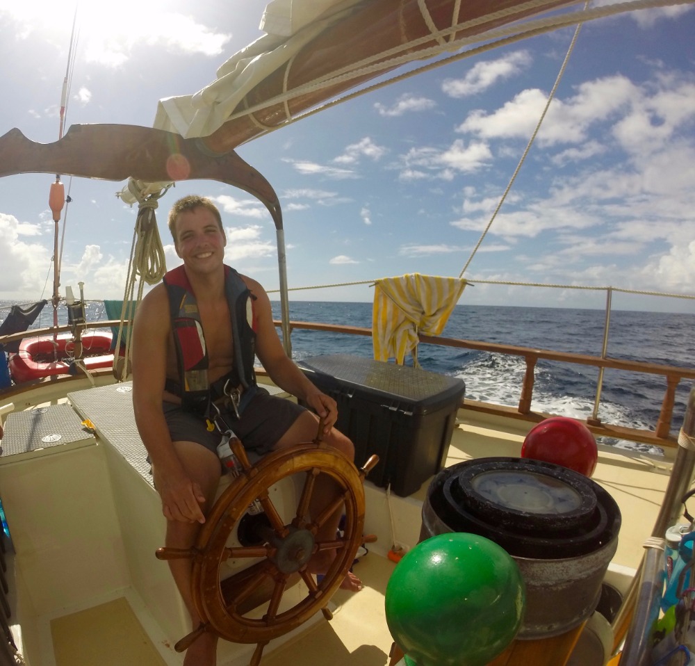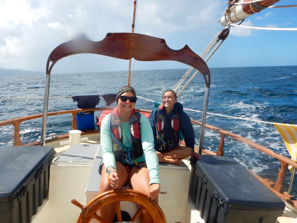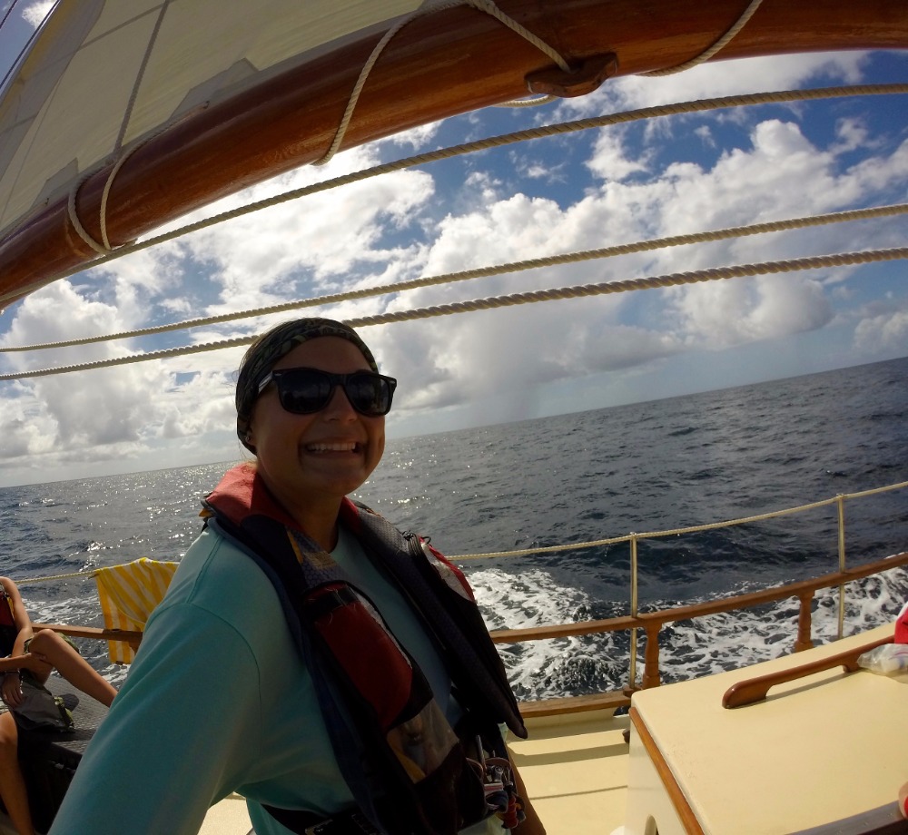 Early wake-up today at 6 am. Went underway, putting our Navigation knowledge to the test, planning our sail, and finding our headings. The mountain we climbed the day before slowly disappeared behind us. Beautiful blue sky dotted with white and black clouds. It rained on and off throughout the sail. We motor-sailed a lot today due to the fact that the wind shifted, causing us to sail into the wind. Watch teams went on deck for two-hour incrementsthose not on watch studied for the upcoming exam tomorrow morning. Along the way, a pod of dolphins greeted us as we arrived in Saint Lucia. There was an attempt to use a hydrophone to listen to dolphins, but the engine was too loud. We picked up a mooring ball next to a mountain called Petit Piton. It is something out of Jurassic Park. We are all half-expecting to see dinosaurs on the shore.