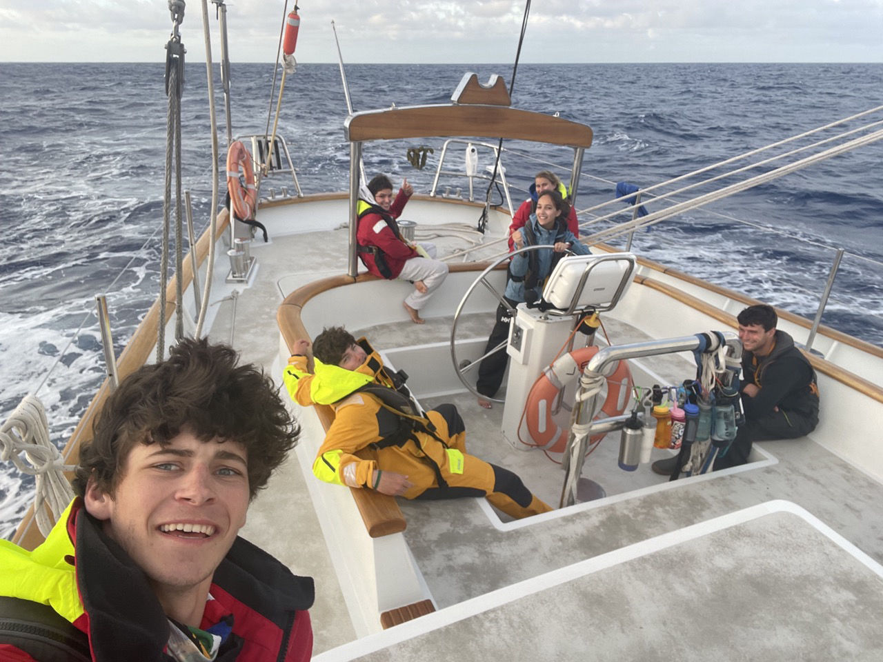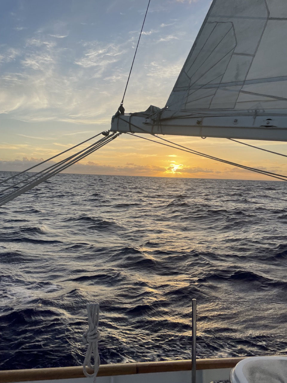 After nine days of passage, we have all found our rhythm and role in this new lifestyle. As alien as it felt at first waking up at odd hours of the night to go do night watch, we all look forward to the possibility of a moonless starry night or an angelic sunrise. I might be speaking for myself here, but having never been a morning person, I have come to especially appreciate these sunrises. This morning, my watch team of Conor, Kip, Arielle, and Christina played a new game where we tried to guess what time we would first see a full orb the name of the game being FORB. Unfortunately, Christina blew me and everybody else out of the water with a guess of 8:05. After veggie fried rice for lunch we had another Oceanography lecture with Will and a part two to our lesson on Dead Reckoning with Jake. I am hoping that sacrificing our weekends to have class will mean we have more time to explore our destination. Despite the sense of newfound routine, it is becoming very clear that many of us need a break from this rigorous schedule. With less than 48 hours in our passage (according to our GPS), I can tell that every single one of us is ecstatic for St. Helena. This is mainly because of the excursions and activities, like snorkeling with whale sharks and hiking the island. Still, many of us are yearning to sip a cold beverage for the first time in weeks, as well as download all the shows, movies, and music that we missed before leaving Cape Town. I myself am running dangerously low on energy drinks and bars that have been my lifeblood on my long night watches we were laughing that the St. Helenans might have to ration for a couple of weeks after we are through with their general store. Many of us are also curious about what living on a ceaselessly rocking boat has done for our motor skills- Are we going to be walking in serpentine patterns? I am also hoping for a soccer field where I can play some sports and engage in light competition with my crew mates to ensure I haven’t lost my touch. Mom, Dad, everybody here is crazy. Please come take me home.