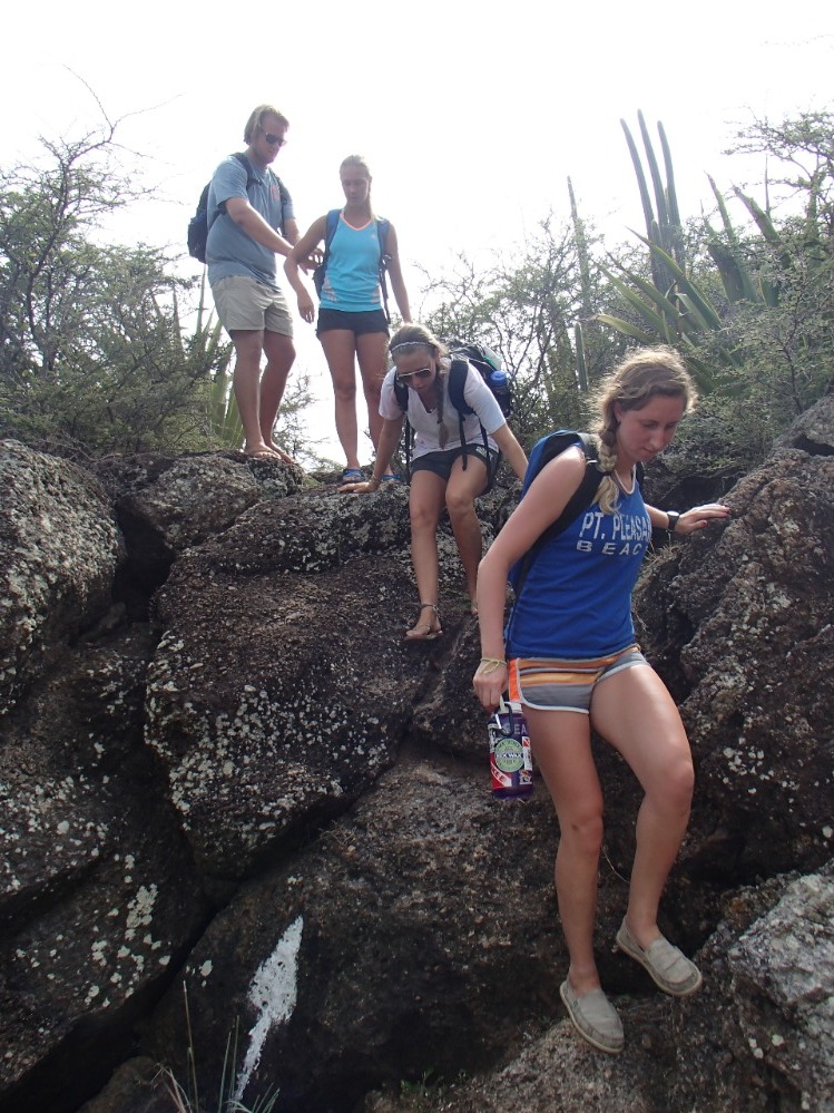 Nevertheless, we found our ice cream and headed back to Ocean Star to see what the rest of the day had in store. Emma and Jack took us on a walk in the afternoon. It was a hike up an extremely rocky landscape. Once we were all sweating and panting from our brisk walk, we discovered that our destination was some beautiful, secluded cliffs. These cliffs were perfect for rock climbing, exploring marine life, and excellent photo-ops. On our hike back to the beach, we got creative with some hiking songs. The hills were alive with the sound of “the ants go marching one by one, hoorah, hoorah.” Once we got down to the beach, we enjoyed a quick swim before heading back to Ocean Star for dinner. Day one in Antigua was most definitely a success, and we cannot wait to see what other adventures are in store while we are here.