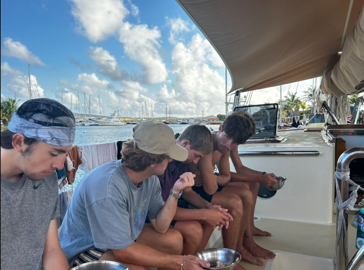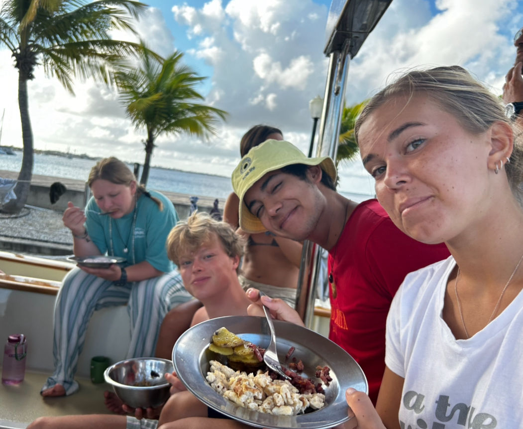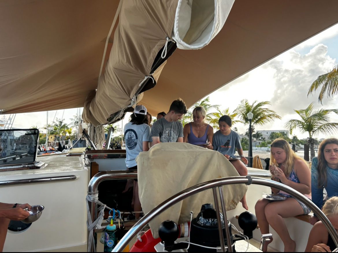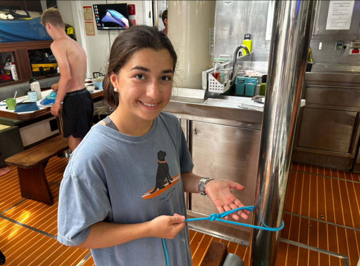 We started the day off with a hearty breakfast and went straight into class after cleanup. First up was Oceanography [oh-see-an-ography], where we learned about plate tectonics and oceanic hot spots [two riveting topics], which both play an interesting role in island formation. Next, we had Seamanship, which was dedicated to knot learning, boat anatomy, and line identification. Gabe is a great teacher and those of us who haven’t sailed before are finding his classes super helpful.