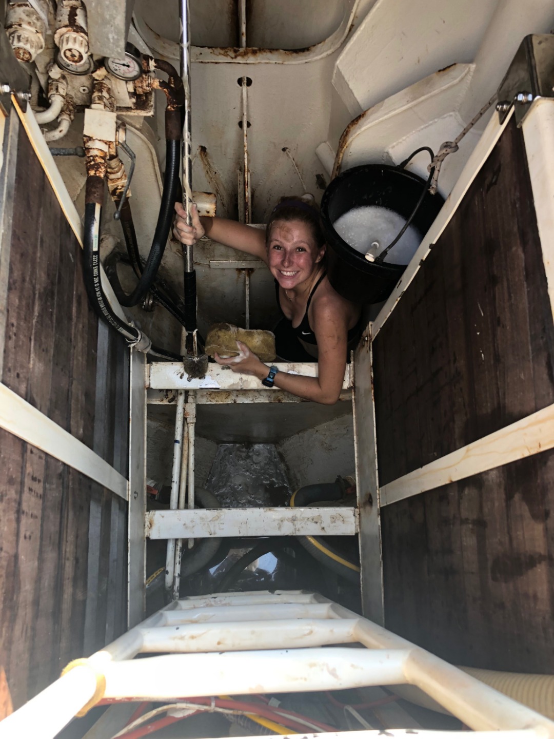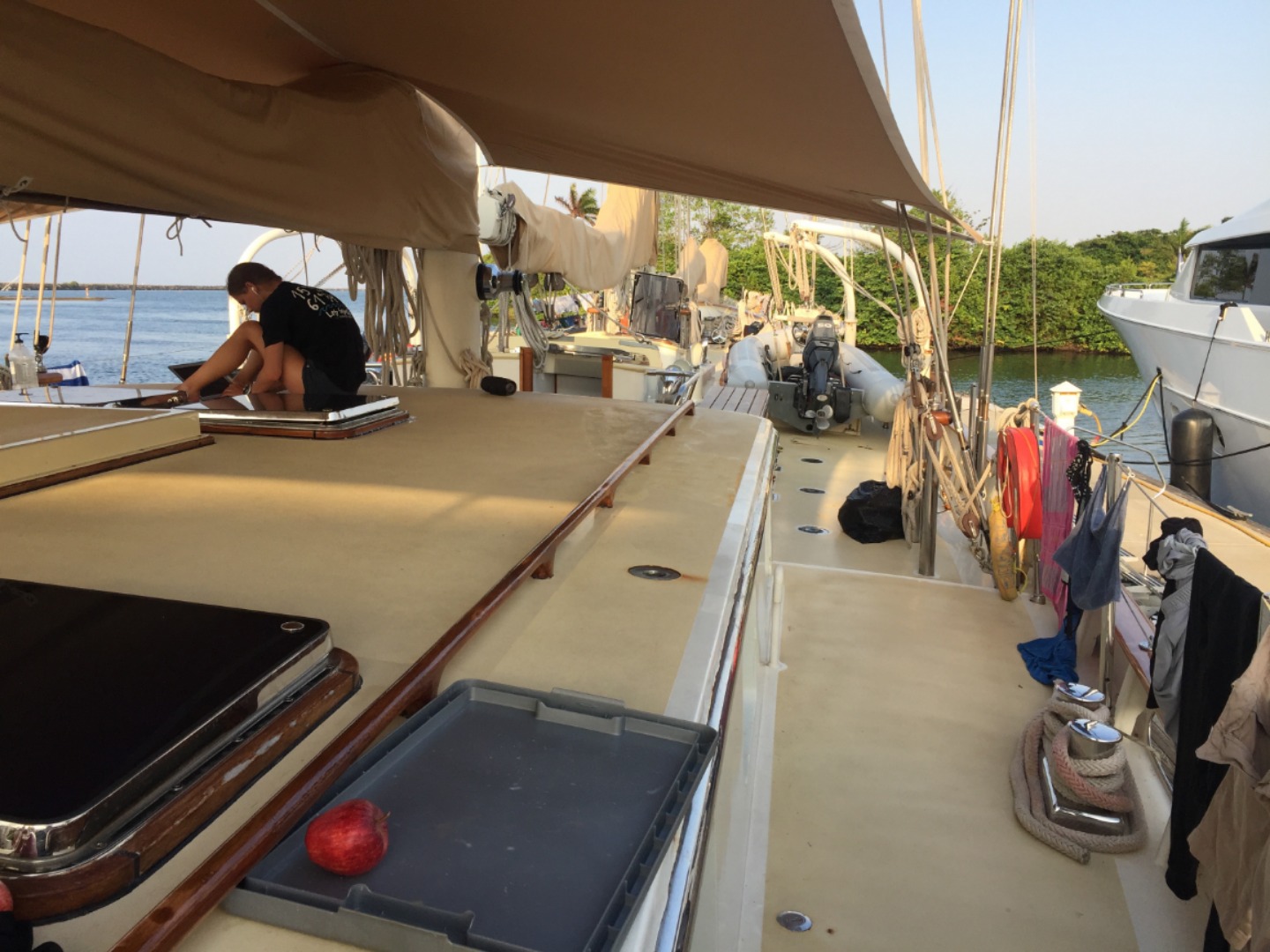 Our second day in Colon brought us a whole new world of cleaning joy. Shortly after a humble oatmeal breakfast, we split into cleanup teams to tackle all of the remaining boat appreciation tasks, of which there were many. Some of us went down below deck to inventory the many stashes of food we had hiding all around the saloon. Some of us crawled deep into the damp underbelly of Argo, the bilges, to continue yesterday’s deep clean. Those of us who stayed up on deck were given a variety of laborious tasks, from cleaning the anchor locker and organizing tools to spending hours wire-brushing the rust off of some highly corroded bolts (shoutout to Bianca for cleaning many stubborn bolts with me this morning). I cannot attest to how most of the tasks on board went; however, let me assure you we all did our fair share of work to bring our lovely sailboat to a new and previously undiscovered level of cleanliness.