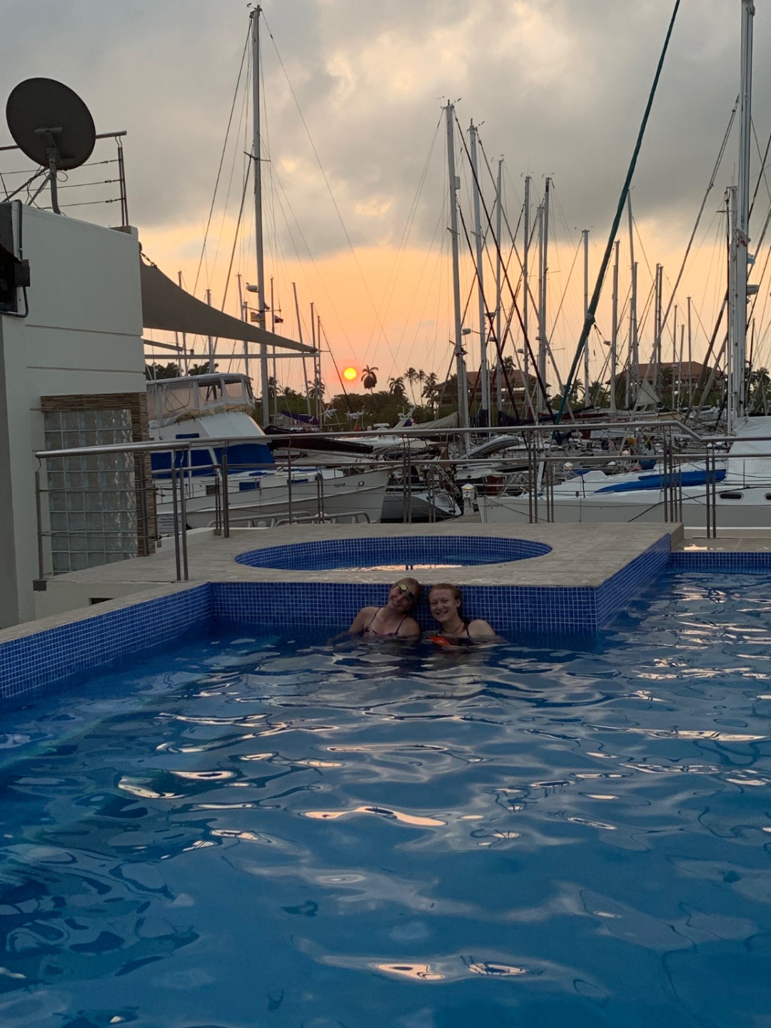 Pictured: Argo is looking good at the dock at Shelter Bay Marina; Eliza still smiling while cleaning out the anchor locker; Amanda cleaning out the bilge underneath student bunks; Argo’s deck looking clean; Eliza and Bianca enjoying the sunset in the pool at the marina; the group at Squeeze after dinner.