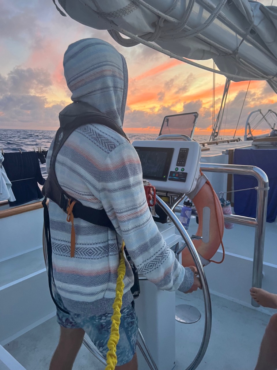 We’ve come to the final day of passage, and the proximity to land is clearly marked by an increase in the seabirds and passing vessels. It’s surreal how short and, at the same time, eternal it feels we have been at sea, and now the prospect of an island coming with sunrise has the crew full up with butterflies. The day started wonderfully with a surprise bake of cinnamon roles from Shelby and was soon followed by a false killer whale sighting by Michelle, myself, and watch team 3. Post cetaceans, I shot some hypotheticals at Nathan and Tom, and the conclusion was that Nate would prefer sailing the trackless seas of the doomed reach between worlds for six months out of every twelve than eat a pound of fruit every day and the good Captain would prefer riding as cowboy on a cattle drive for three months across Nevada over continuing to sail. Head chef Ruffles and his team of Emma and Flo fixed a very special lunch of what I would classify as Sicilian naan, pasta, and assorted toppings, and we followed the meal with leadership class, in which Dan helped us to create a SMART plan to fulfill some choice goals. As I’m scribing this, Emma is digging under her bed for chocolate and screaming that everyone has passed their PSCTs; congratulations to Emma, Andy, Joey, and Johnathan!!! We all know they worked so hard. For Squeeze, I asked if everyone was to write a best-selling novel, with themselves as the main characters, what would be the plot. I recall Anda saying he would be a detective with a chimpanzee sidekick, and Dan said he would be dressed as a caterpillar in a picture book about eating and getting fatter until metamorphosis.