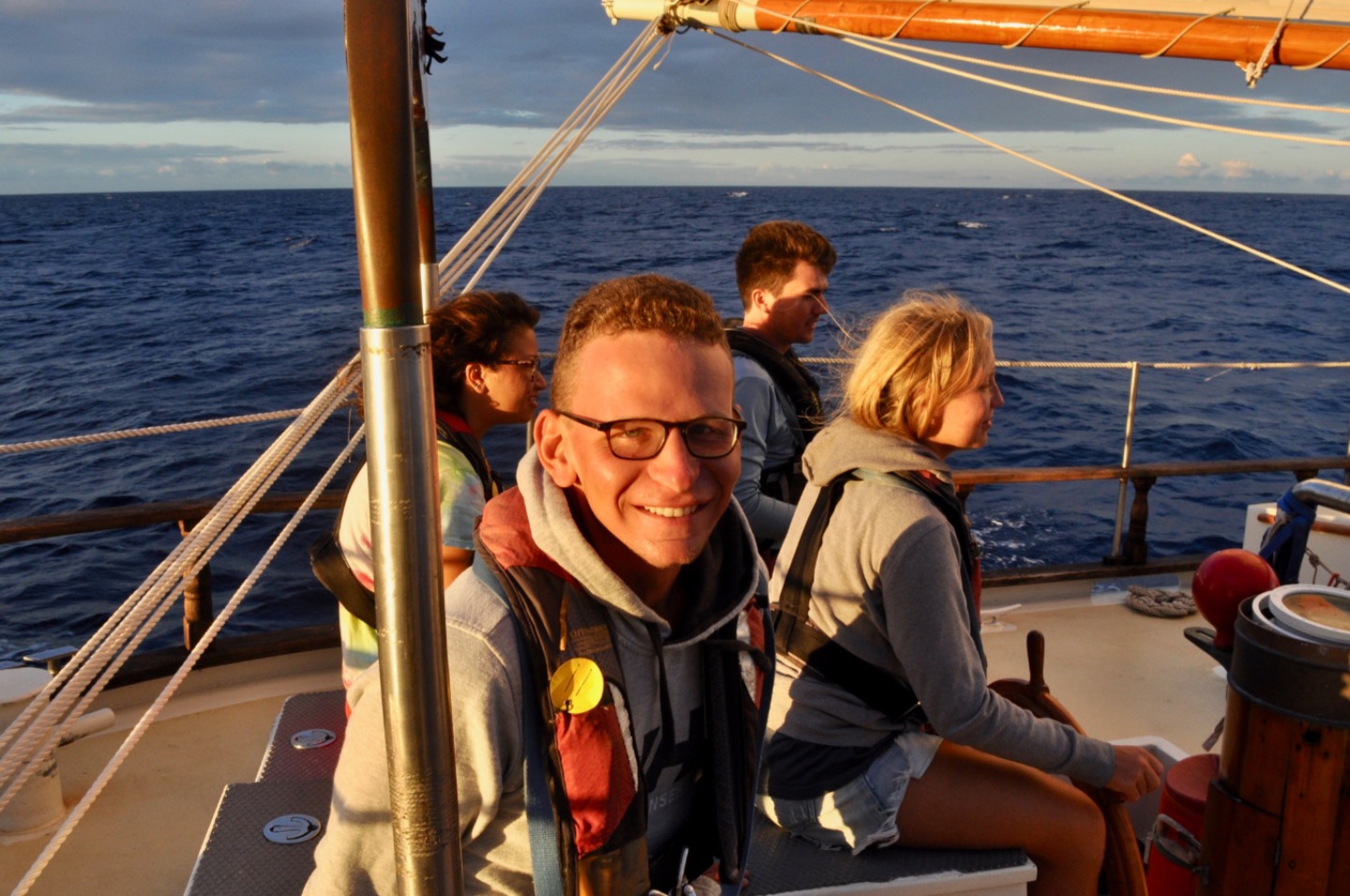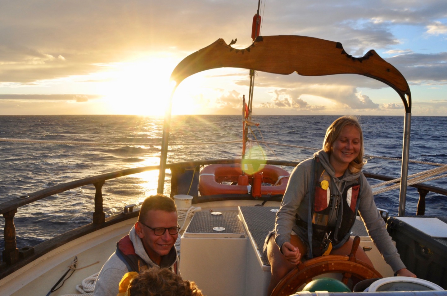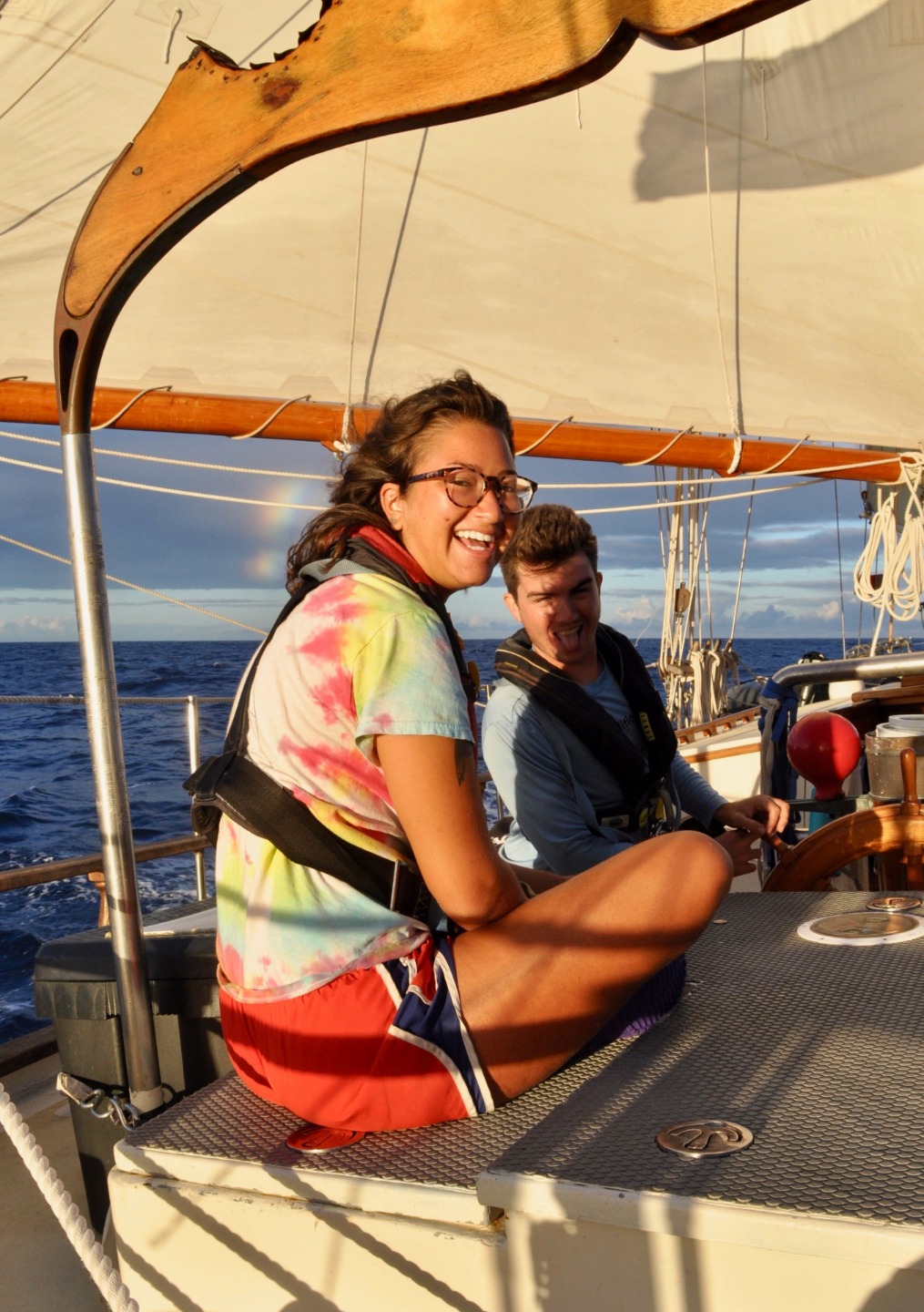 Sydney woke me up as she walked past me on her way to the head this morning. So I rolled out of bed to wake the rest of the crew up at 0300, bright and early for our sail back to the BVIs. By 0400, the mainsail and staysail were up, and we were on our way. Watch team one (Ian, Dasha, Sinclair, and Zach) took the first watch from 0400-0700. They got to witness the sunrise behind the island of Saba, and it traveled across the sky, exactly where Ocean Star was heading. Then, watch team two (Steph, Carolyn, Emma, Sam, and Ian) took over from 0700-1000. They listened to some tunes and, unfortunately, had to turn on the engine because the wind died down too much. Then I watched with my watch team (Steve, Sydney, and Will). Will and Dasha made us delicious Cuban sandwiches that we all enjoyed underway. Team 1 went back on watch at 0100 while everyone else headed back to bed. About halfway through their watch, I was told, they saw a huge pod of dolphins! Watch team two took over at 0400, and they woke everyone up to drop sails around 0445. Dasha and Will had already begun making Moussaka, and everyone got a quick shower in after striking the sails and tidying the deck before dinner. Dinner, as is every meal Dasha makes, was fantastic. Then, after clean-up, of course, the crew headed off to bed. CYA – Allie 🙂