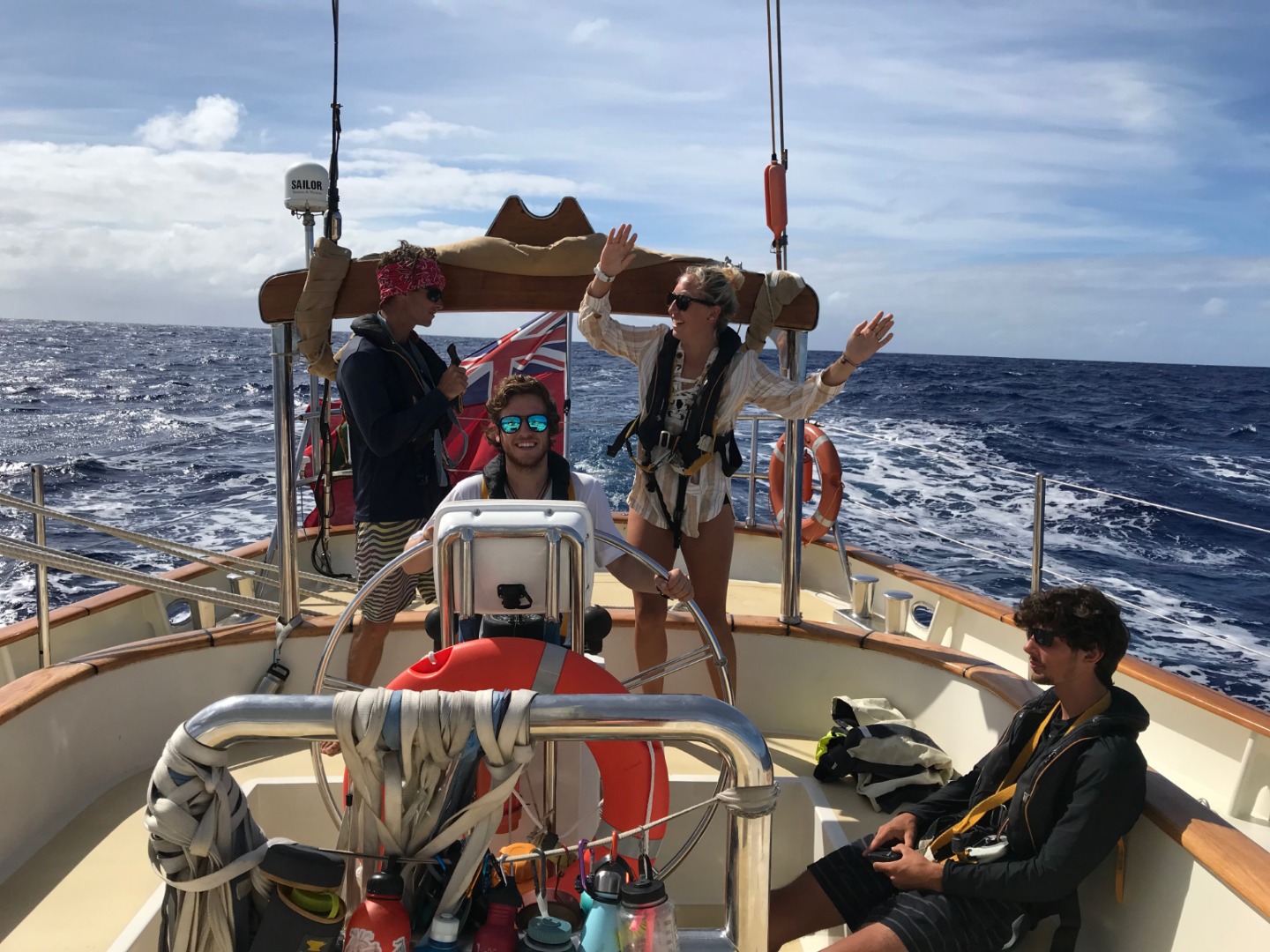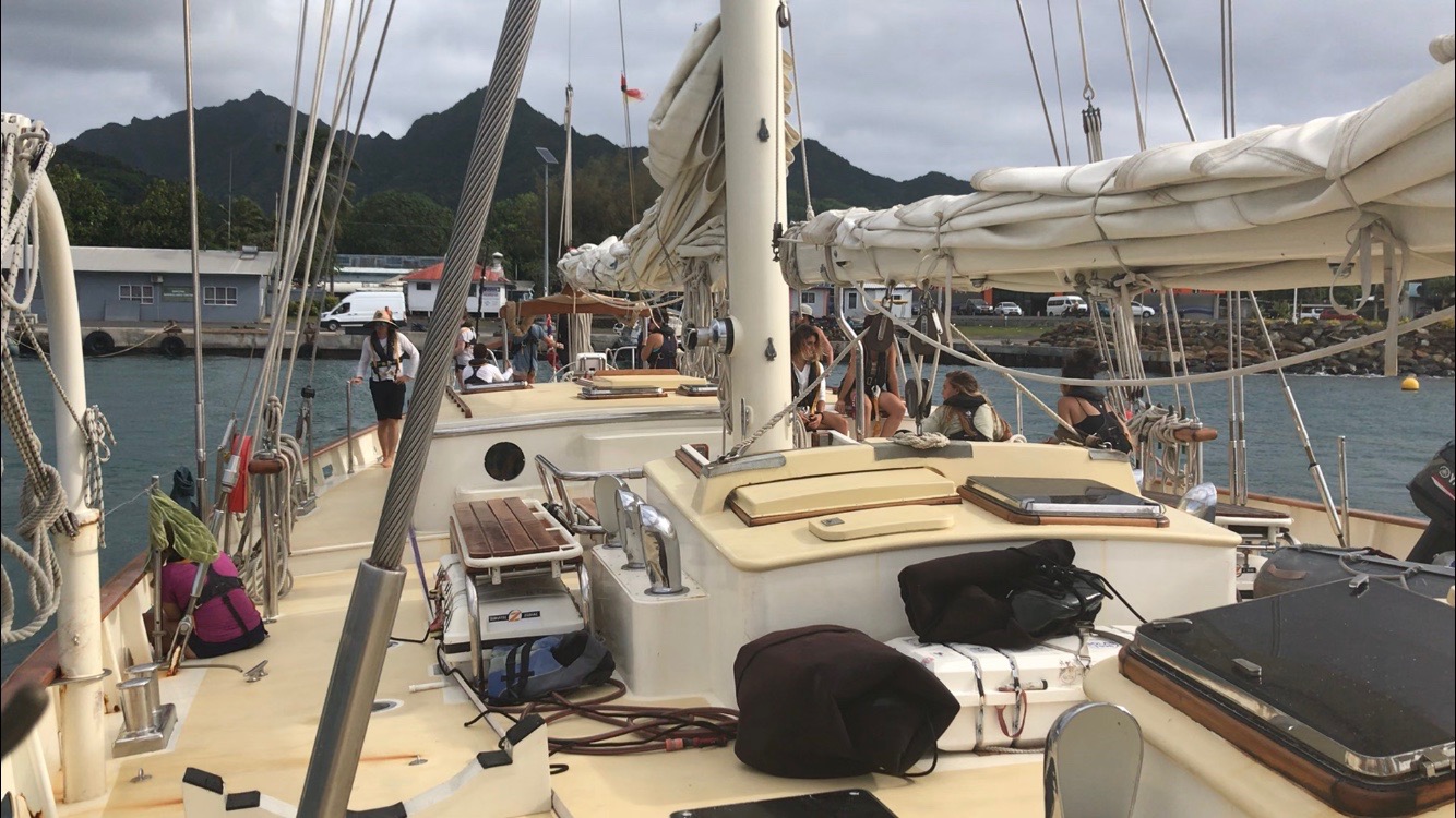 Yet, we don’t only bond amidst the chaos when times are calmer. Even more, bonding happens. This community is strengthening, and each day we get to know more and more about one anothermaking Argo a bit more like home and the crew a bit more like family. As we curbed the northern point of Rarotonga, one of the Cook Islands, we made our way through the small port and docked. This required all hands on deck. We lowered the sails and flaked them neatly. We inflated fenders and cushioned the sides. And finally, we had some “Argo Appreciation,” which entailed everyone cleaning their personal areas and scrubbing the deck of Argo until she looked brand new. With a hose, a few buckets, brushes, and sponges, our boat was free of sea spray and as glorious as ever.