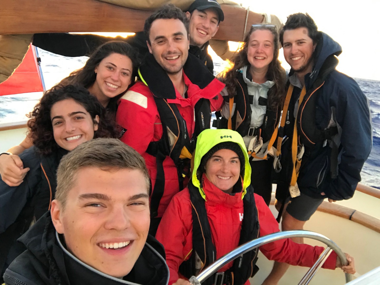 Pictured: sunrise this morning; Watch Team 1 enjoying the sunrise watch; me at the helm with Tim and Shelby having a dance party; the harbor upon our approach; anchor team getting anchors set; the crew getting started on boat appreciation; a view of Argo’s sails before we came into the harbor in Rarotonga; Frank happy to be on land again.