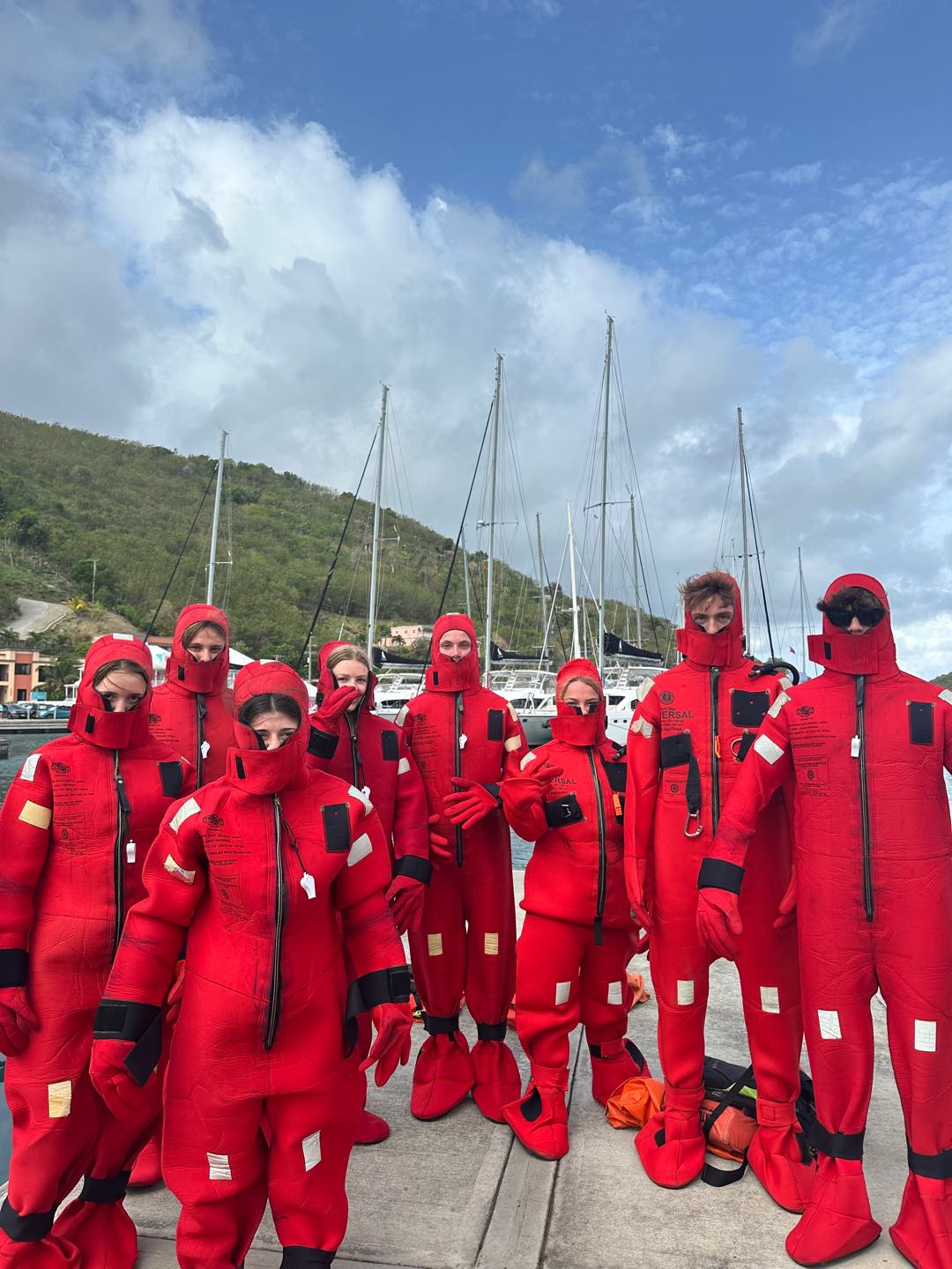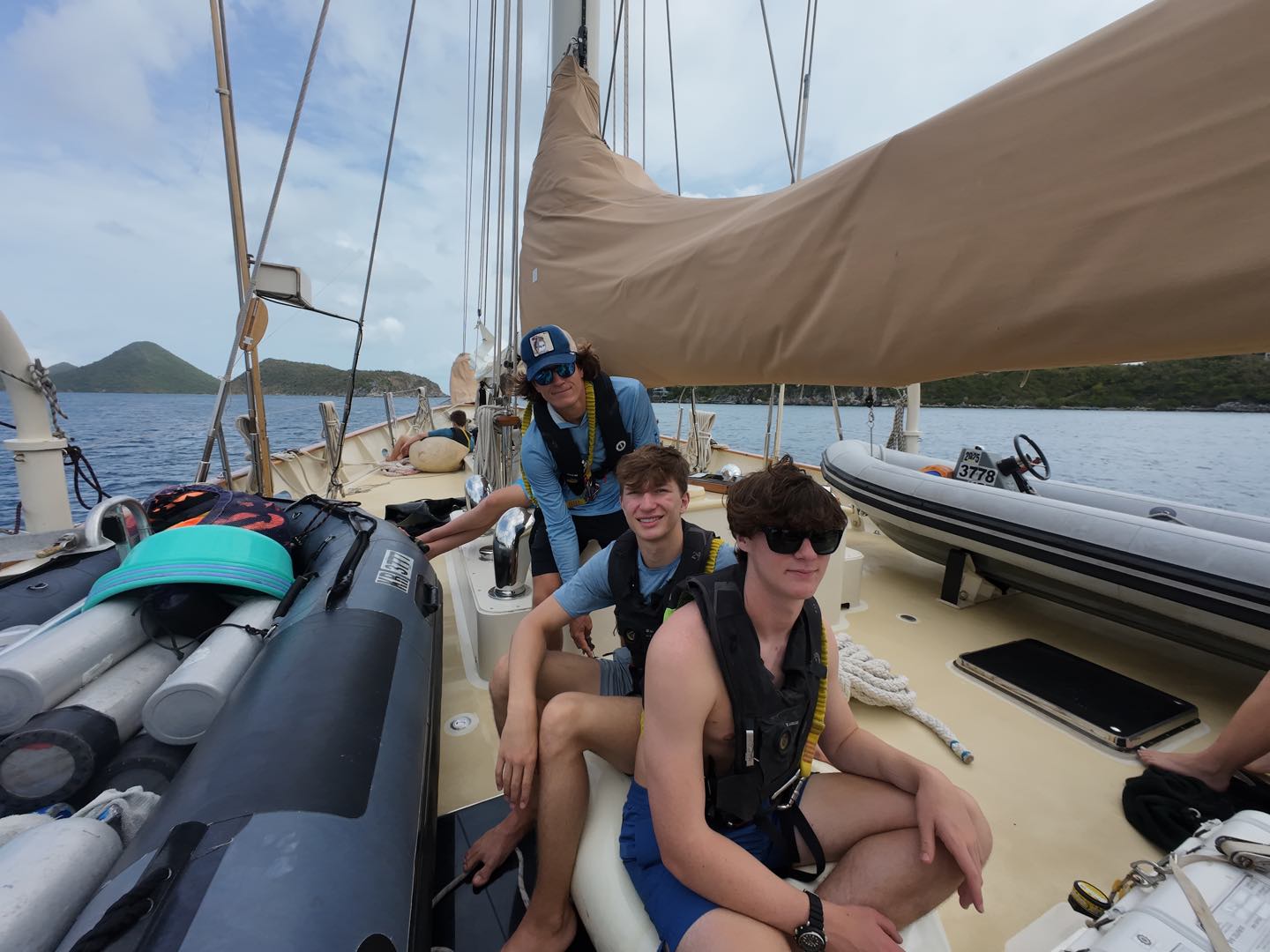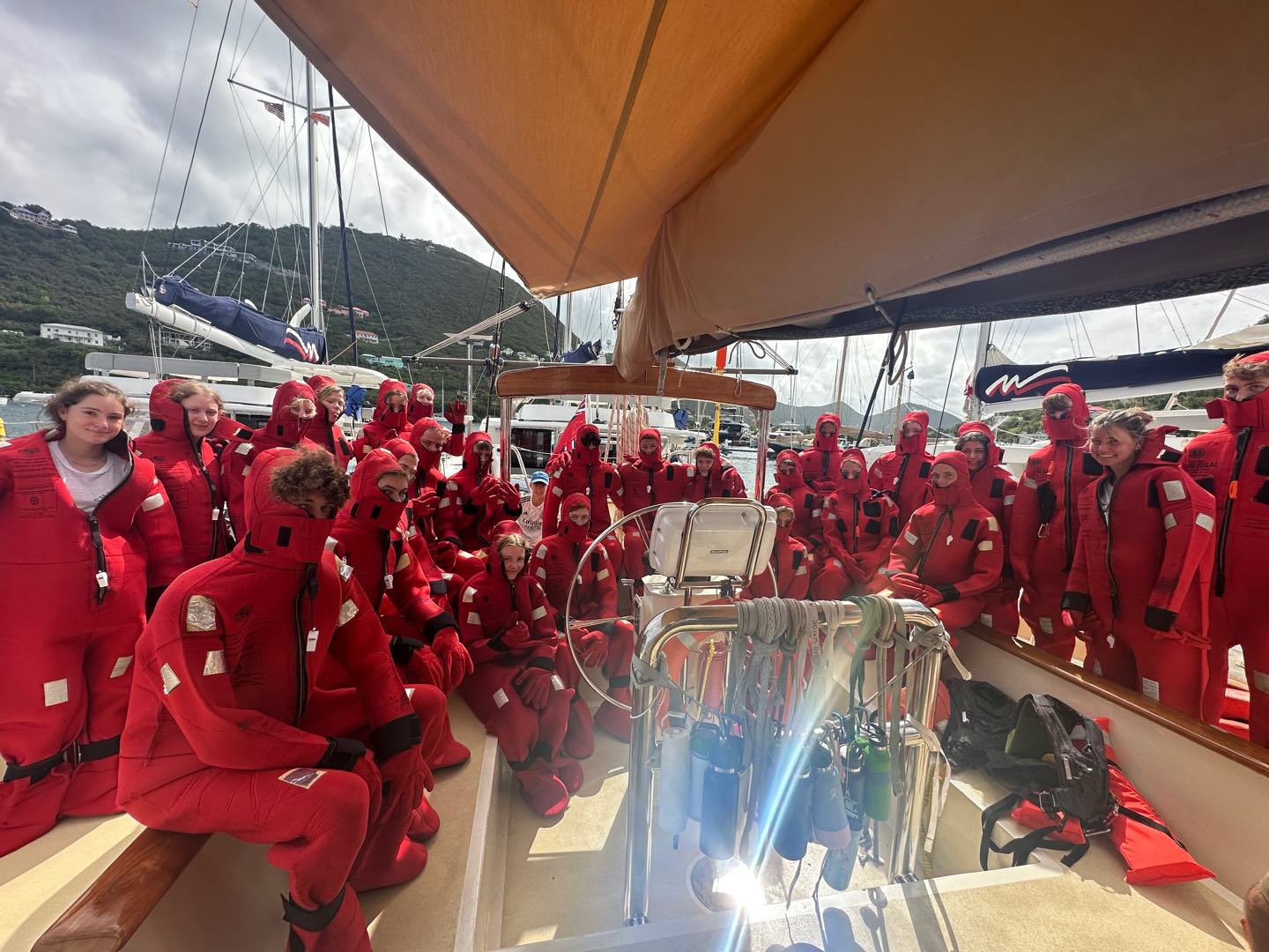 Today was our first full day on the boat! We started our day early by eating smoothie bowls for breakfast and getting to know each other better. Afterwards, we learned how to use and put on the three different types of PFDs (Personal Floatation Devices). The Gumby suits were difficult to get into, but very funny to walk around with. We had a race to see who could put it on the fastest. After that was over, we finally set off. Hays and Andrew took the sail covers off while Alex worked the roaming fender so we wouldn’t crash into the dock. Ella and Andrew deflated the fenders afterwards so they wouldn’t take up too much space on the trip. While Dylan, Logan, and Brady took shifts steering us to Savannah Bay, we began our introduction to Argo, our vessel. We learned how it functions and how life is going to be for the next 40 days. Also, while underway, we had a fire drill and quickly brought out the firehose and practiced how to use it. After our drill, we indulged in a lunch of tofu with vegetables, peanut sauce, and rice made by the chefs of the day, Nicole, Lanie, and Alexis.