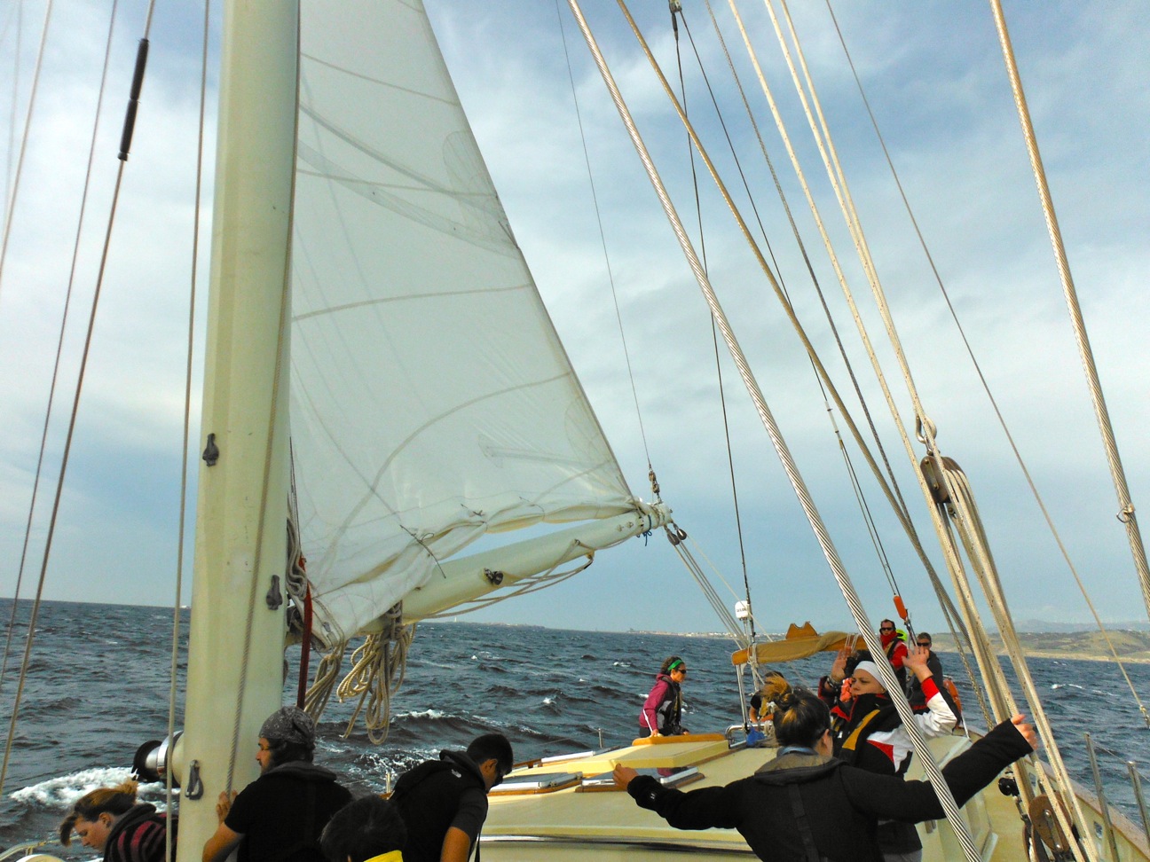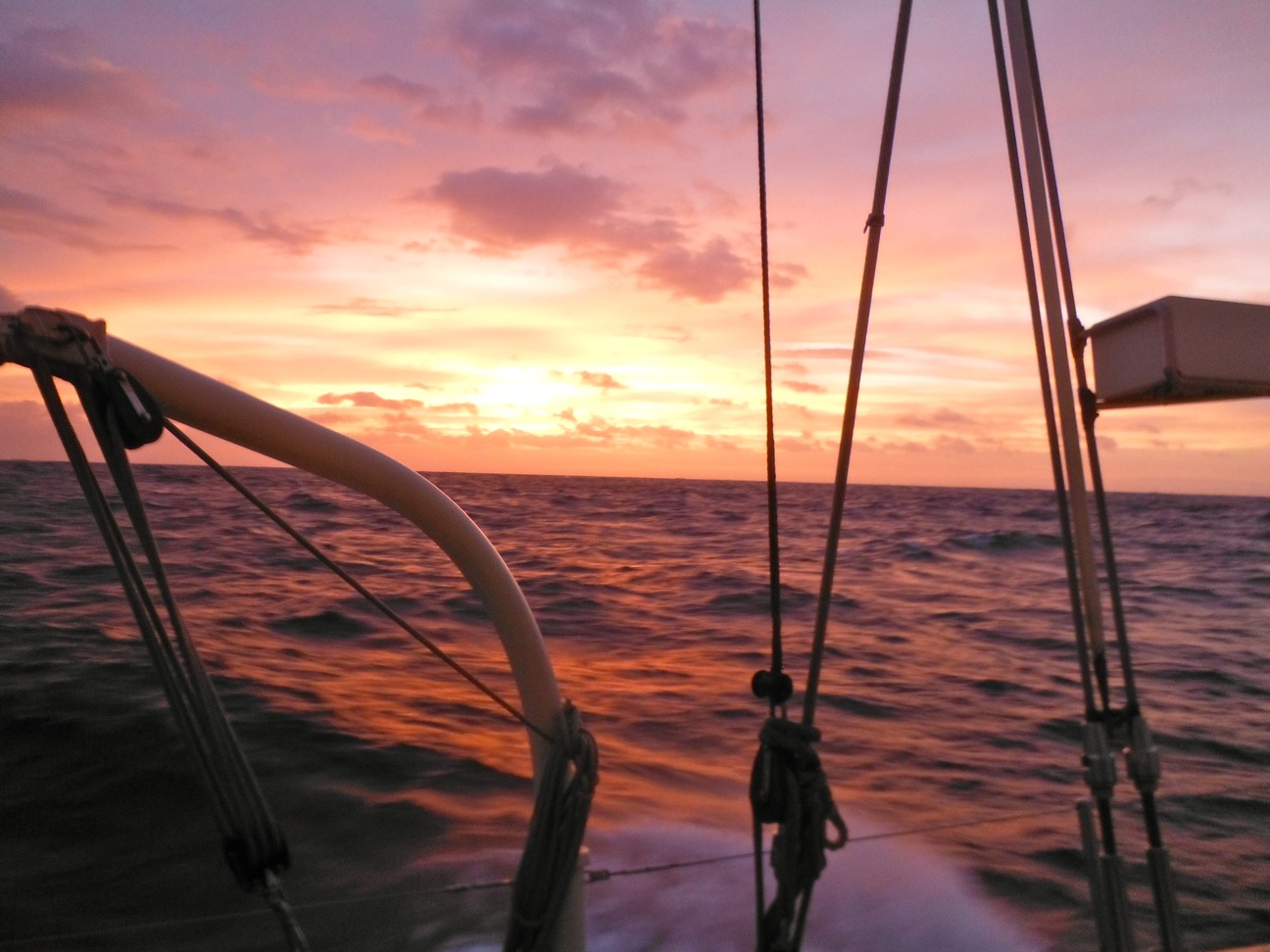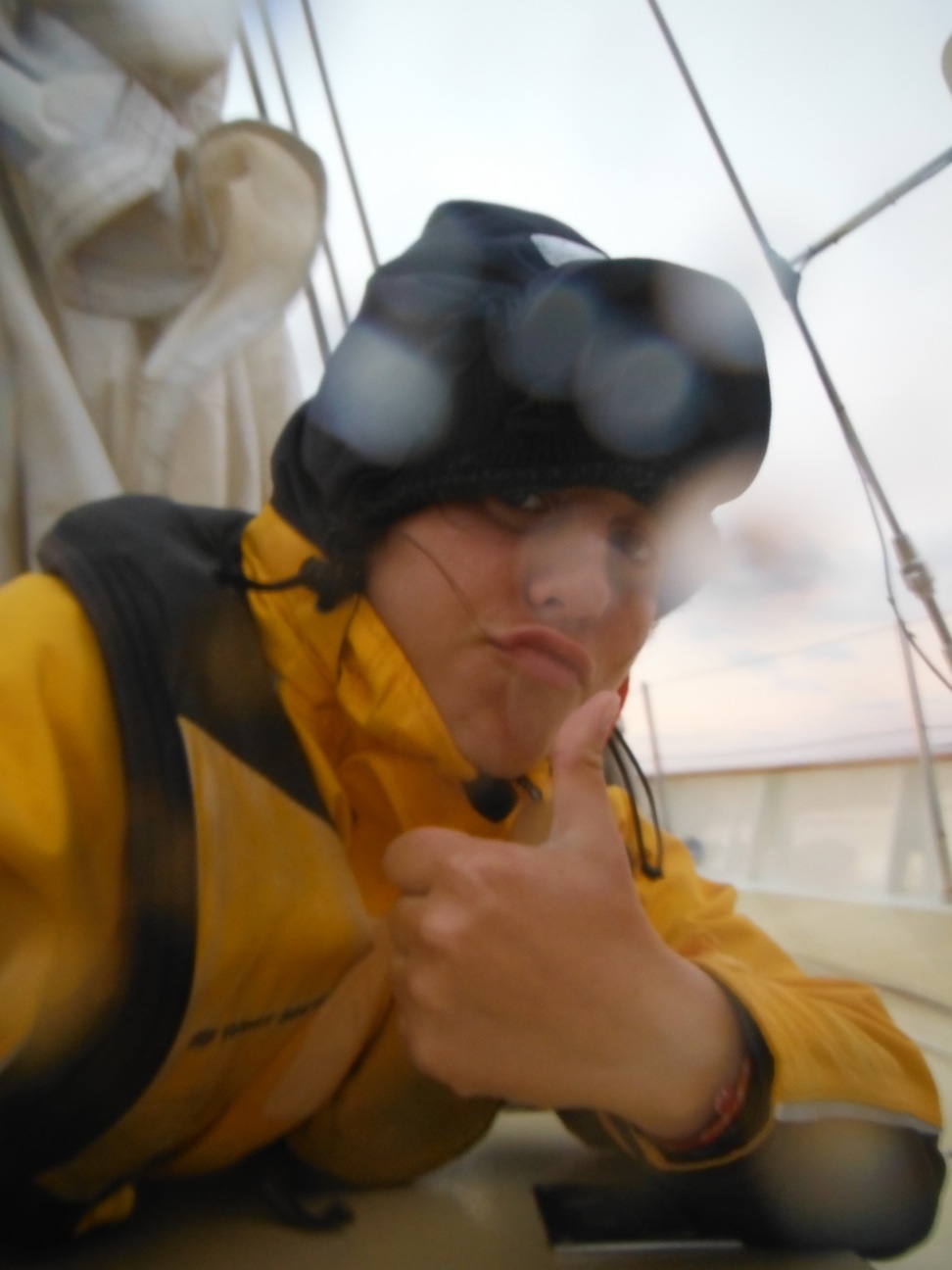 Foul weather gear becomes one of your greatest possessions on board a boat. When the seas are big and the skies are dark, you spend a lot of time wearing that lime green hooded jacket and farmer-esque set of bibs. For the majority of the crew tin his passage, foulies have been the look of choice. You know the little kid that has just put on all their winter clothes, about ready to go out and play in the snow, puffy and hidden underneath all the layers, well that is the dress code on board for the time being. All you can see of each person is a tiny slit near their eyes, between the hood and the collar. Dont assume, though; this stops all the chatter that occurs at all hours of the day and night while the watch teams are on deck. The laughing may be muffled by the wind and the collar of the jacket, but that only means the watch team huddles up closer together to talk about the hilarities of the current weather and life in general.