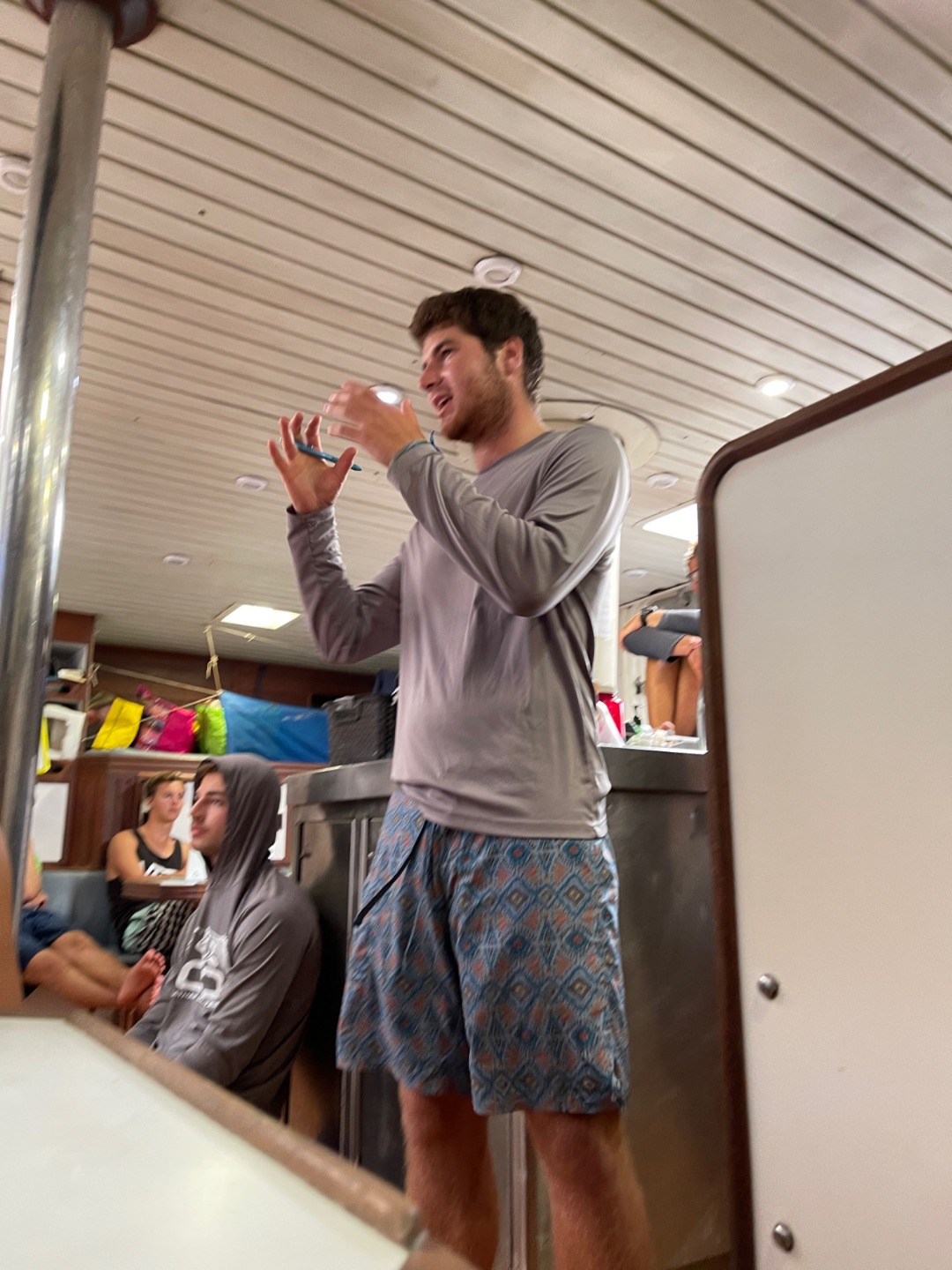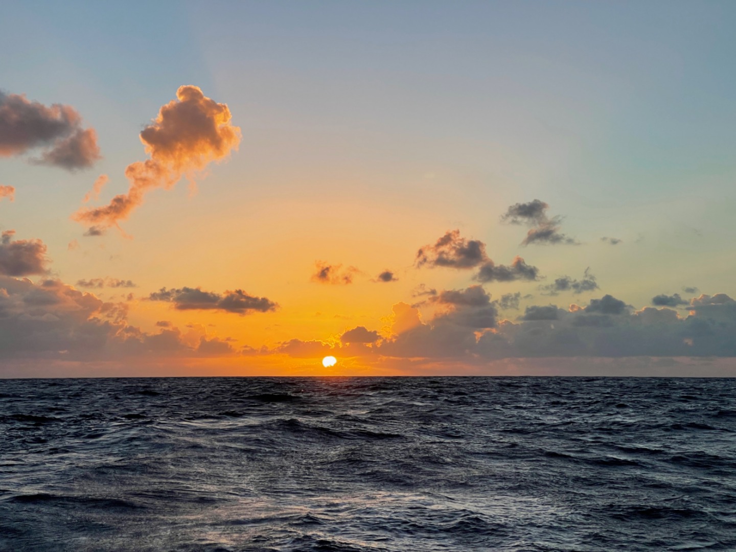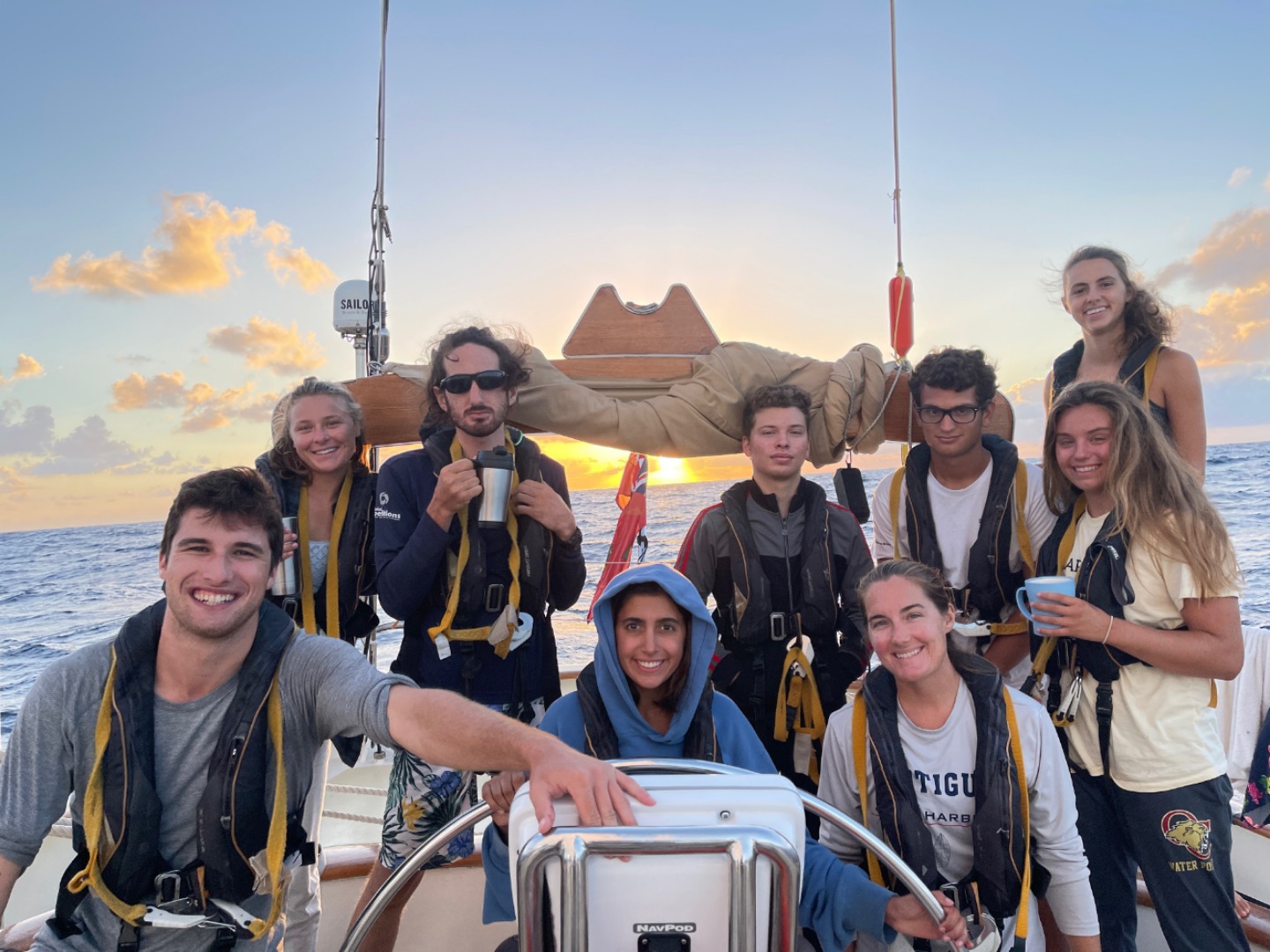 Hello families!!! Another day traversing the Pacific began bright and early with another stunning sunrise and watch team 1 leading us through some more sail handling. This morning we were visited by a ridiculous amount of birds, and radar spotted the first boat we’ve seen on passage (close to land)!!!! After Bella cheffed us up some lunch, we completed our Emergency First Responder scenarios on deck with some very entertaining acting and successful life-saving. Next, we switched it up with some TED Talk presentations where Amanda presented on turtle tagging, Gabe presented on traditional Pacific Islander navigation, Lewis presented on concerts, Sam and Una on the book Solitude, Ezra on meditation, Riley and Niko on things they learned from college, Frankie on autism, and Trevor on Photoshop. It was such a fun and interesting way to learn about different topics from our friends. We then rolled into deck showers and dinner, during which we reached the 6,000-mile mark!!! It’s really crazy how far we’ve come on this journey, and as it rounds down, I am already nostalgic about what an incredible adventure it has been. Crossing an ocean with your best friends has been an unbelievable experience that I will cherish for the rest of my life. I am so excited to make these last couple of weeks as memorable as possible. TILL FIJI!!!
