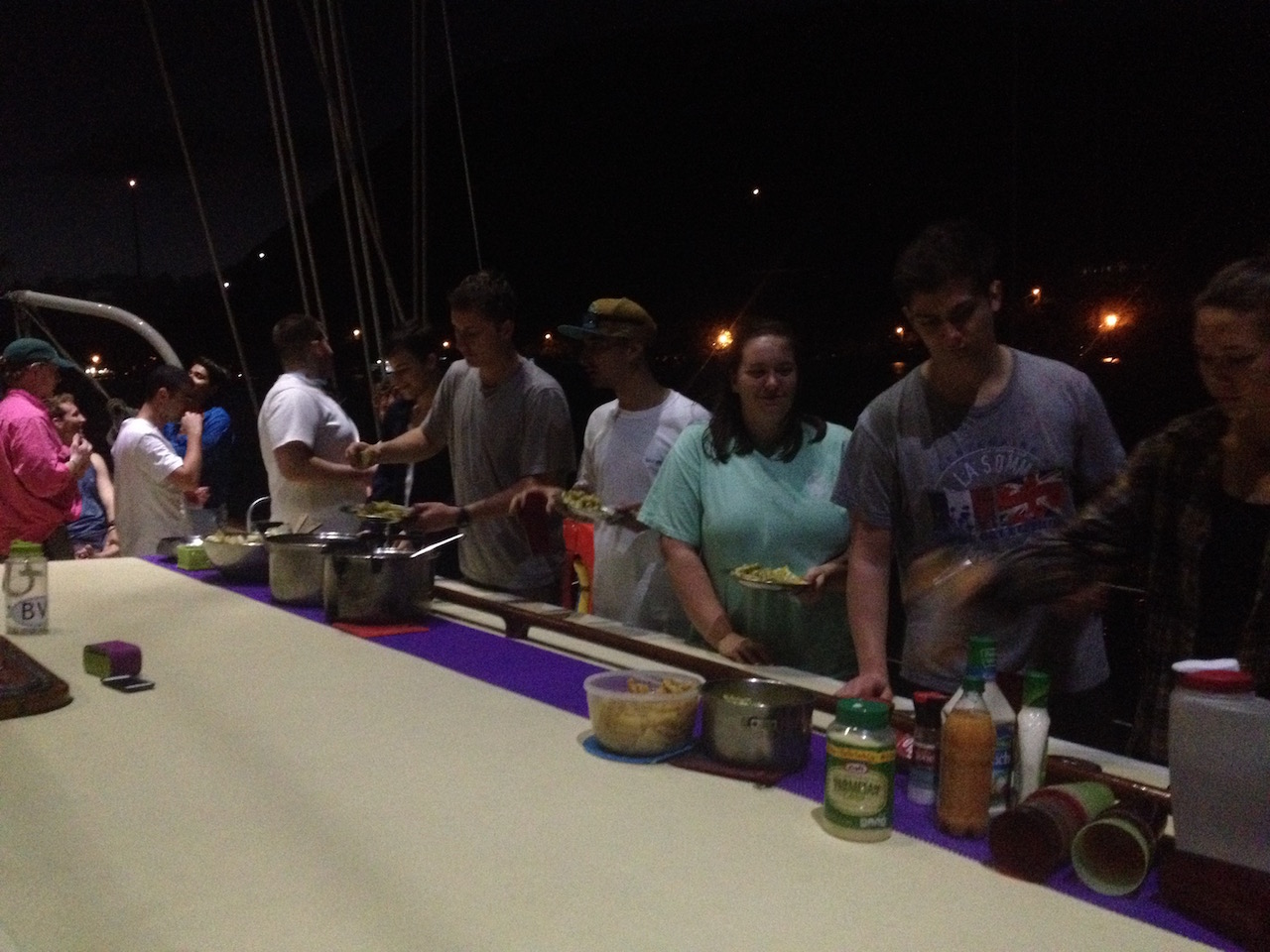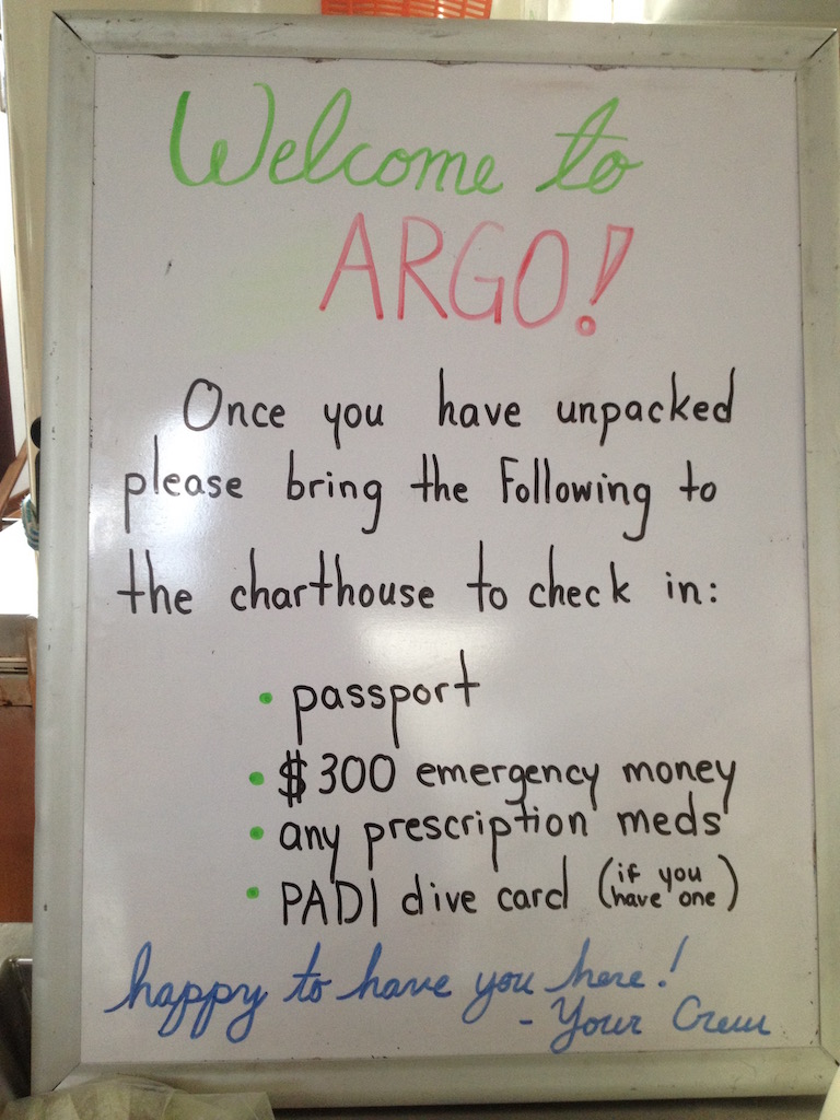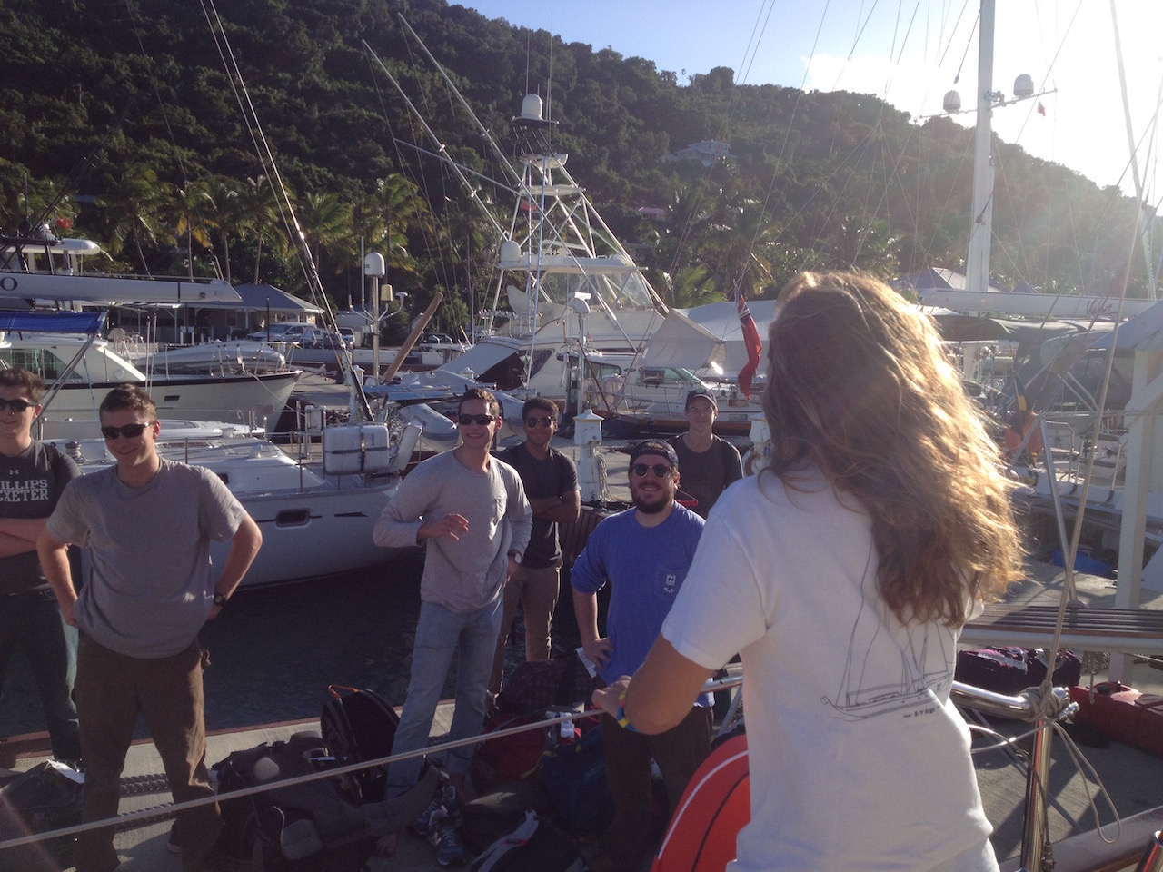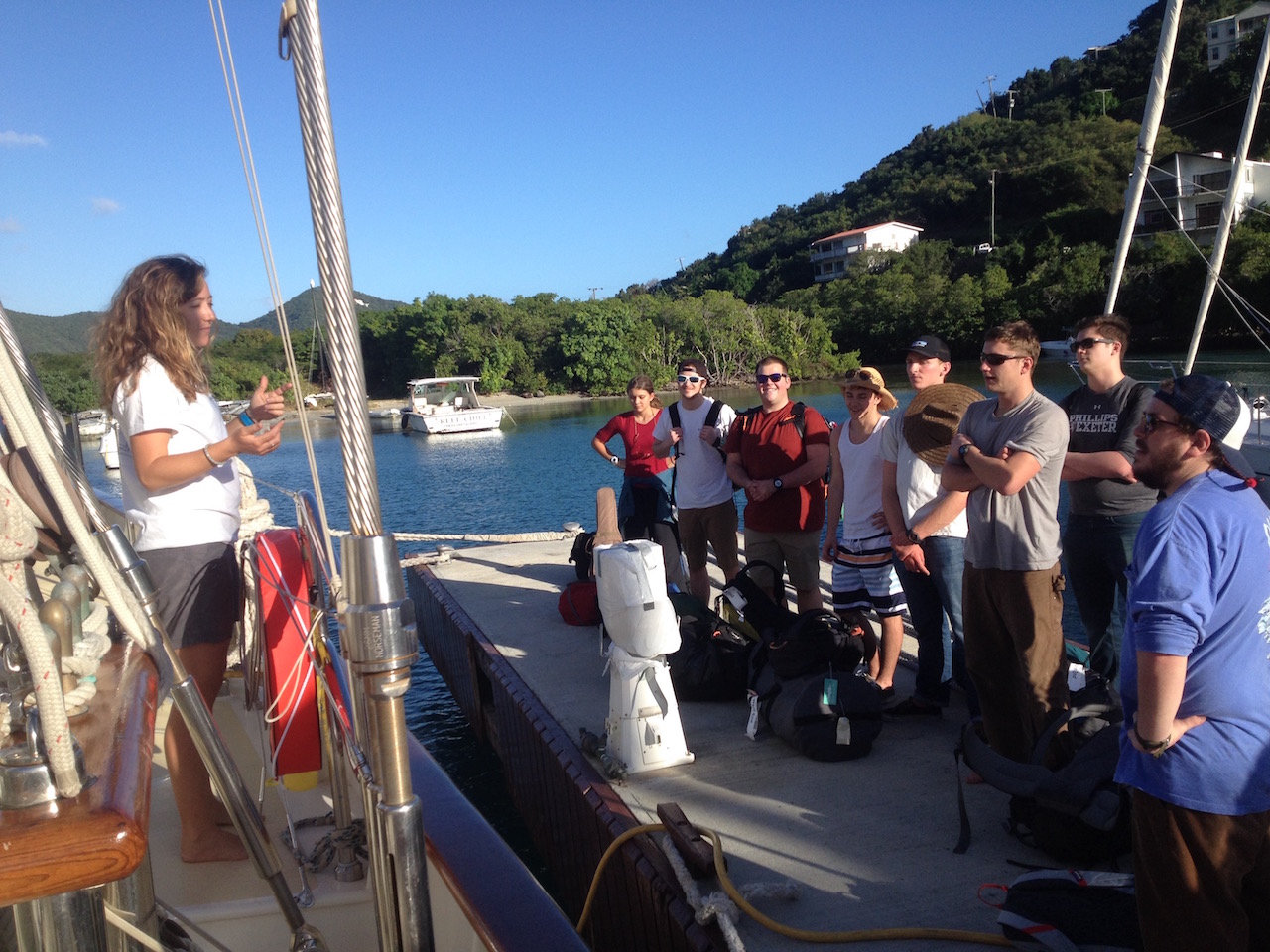 We are happy to report that Argo is full of all of our shipmates (and their bags!) after an exciting arrival afternoon. There was a mass arrival of shipmates on the 4 pm ferry from St. Thomas, followed by a flurry of learning names, unpacking into their bunks, tying dive gear up in the laz, and having our first squeeze. After dinner, we learned about the daily roles onboard the boat and rolled into cleanup, trying our hand for the first time in the roles of deckies (cleaning the deck after the meal), salties (washing dishes), and gophers (passing up food and putting away dishes). As I write, these several students are already asleep after a long day of travel, while others are up on deck hanging out, getting to know each other, and playing guitar. Everyone is excited about the trip, and we are equally excited to have them on board.