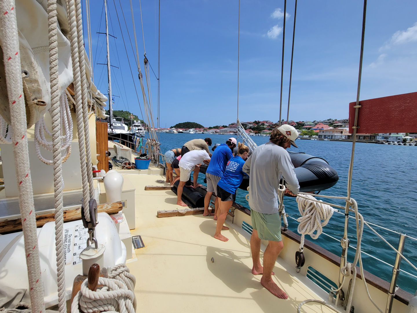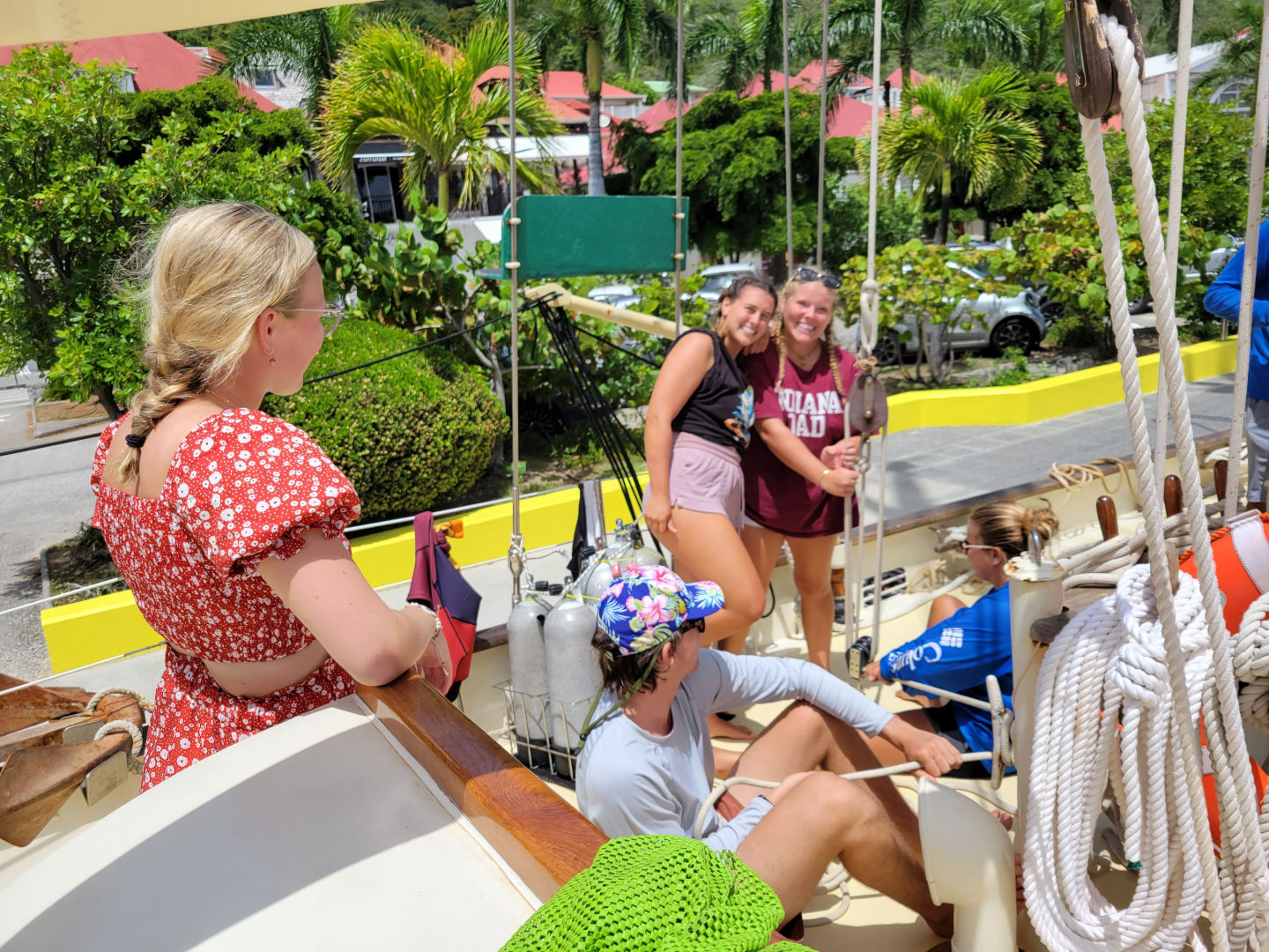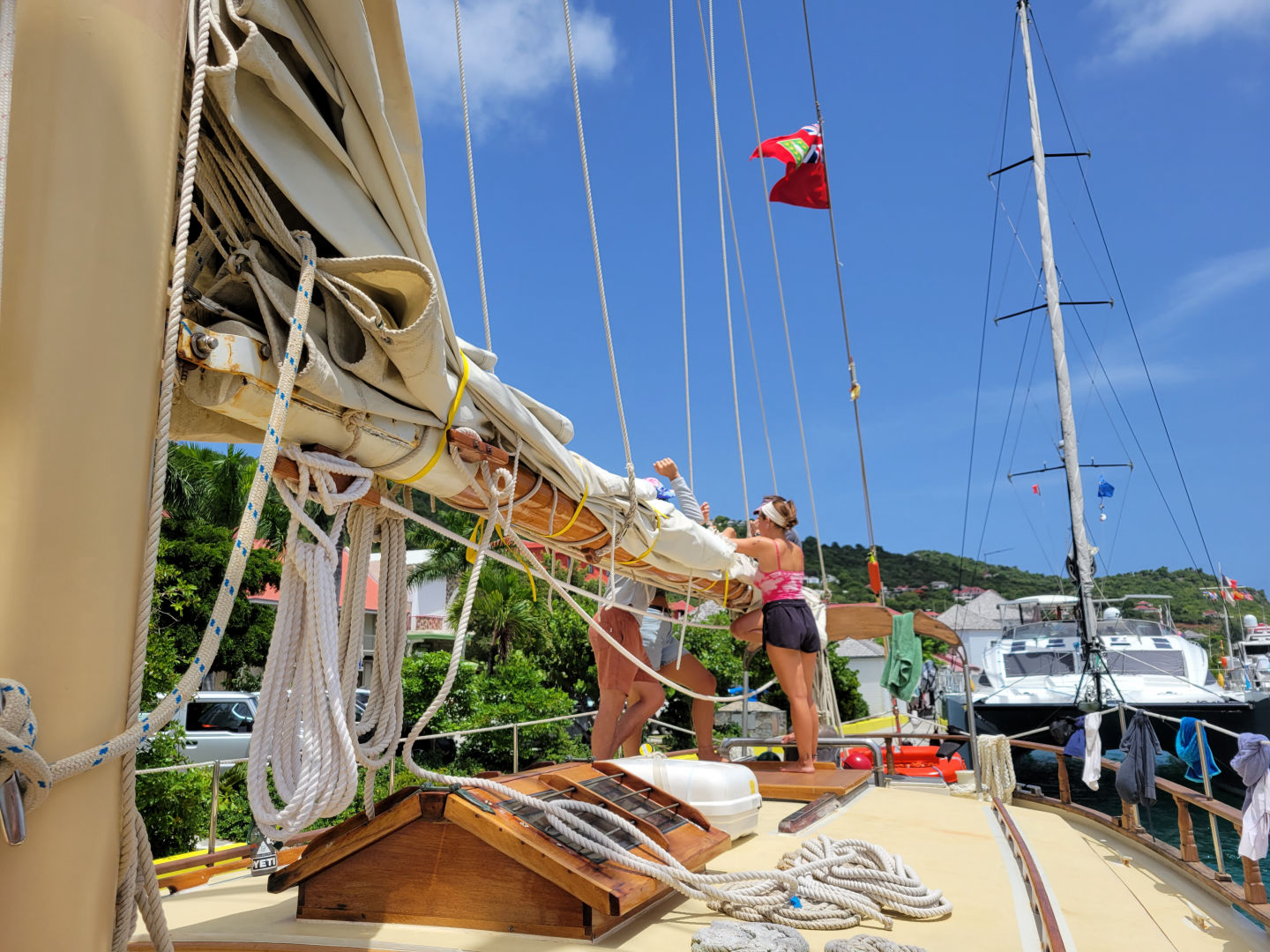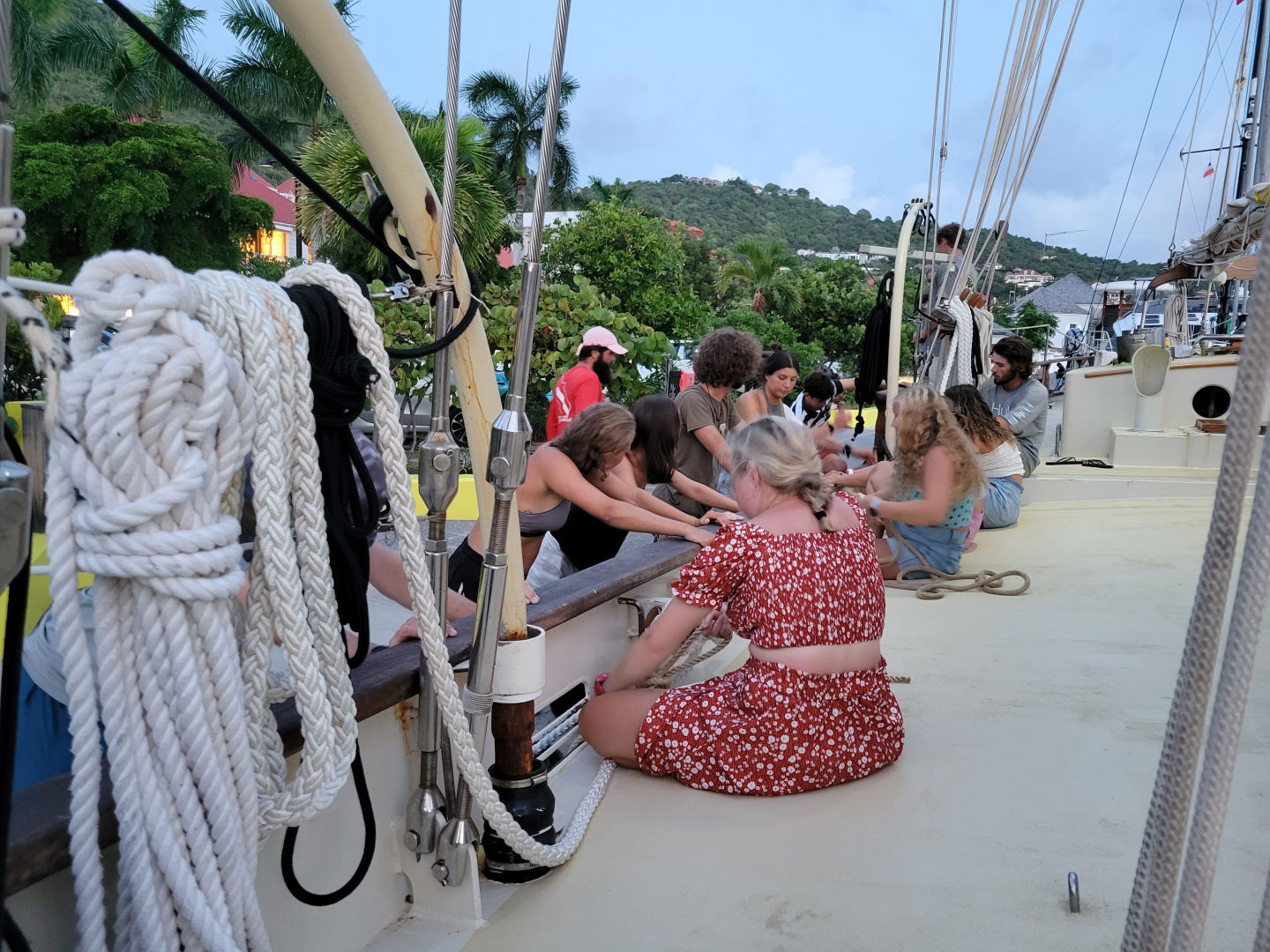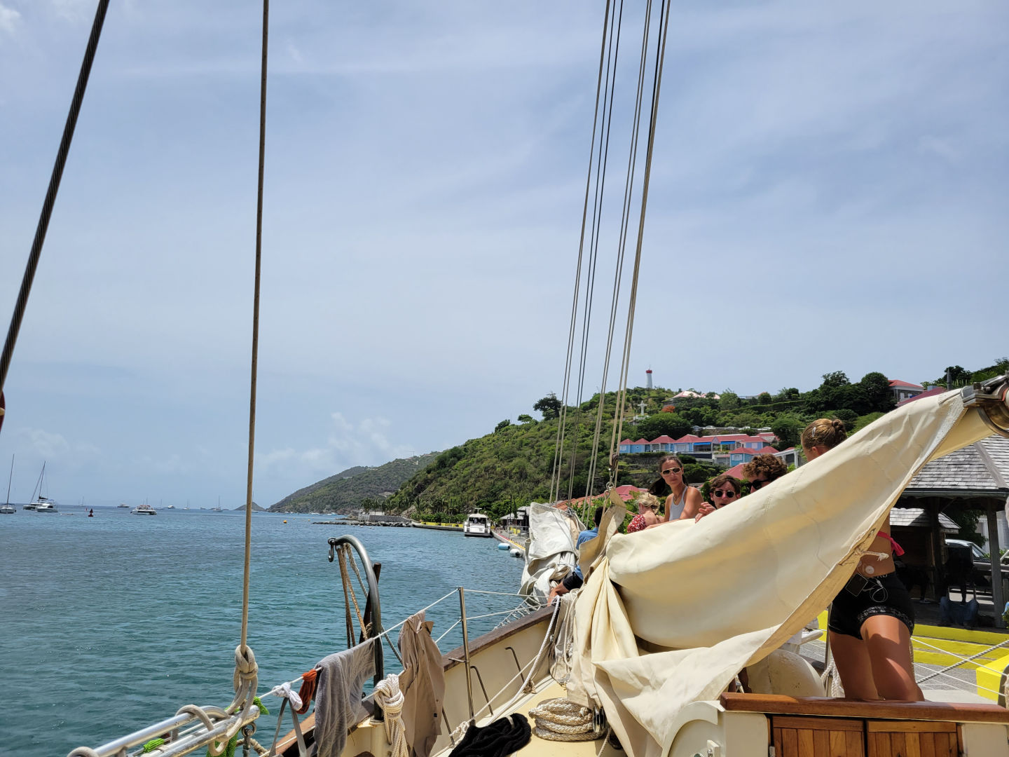 After sliding during squalls and sailing under the stars overnight from Guadeloupe, we arrived this morning in St. Barths, a small touristy French-speaking island. All of us students were expecting to drop anchor out in the bay like we usually do whenever we arrive somewhere new, but we were pleasantly surprised to discover that we would actually be at the dock for our time here. Once docked, we took care of the boat first, making sure all sails were properly flaked and all lines were cleanly coiled so that Ocean Star would look her best. Within moments of us being here, several people had already walked by and taken photos. Some of them even stopped to ask us questions, curious about the beautiful classic style of our boat compared to all the other similar modern yachts nearby.