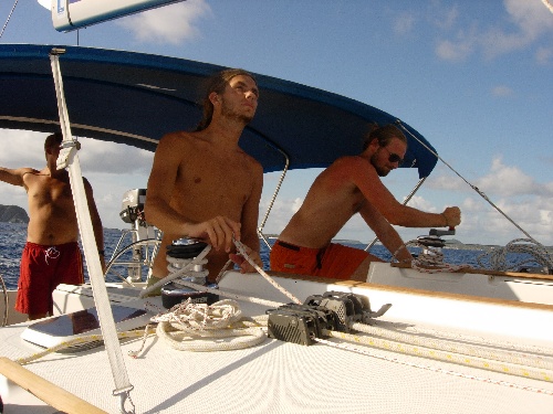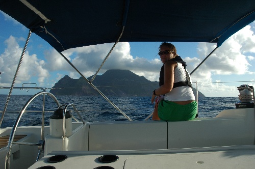 After an all-night passage straight into the wind, we arrived in Nevis at 1500 along with Ocean Star. We dropped anchor, and Simon and I went ashore to clear while the crews did an excellent Boat Appreciation. Tonight was our first scheduling meeting, and we assigned Telltale editors and writers. The first shipmate rotation happened today, which was exciting. While we say goodbye today on Near Enough to Kevin, Peter, Nick, and Mike, we say hello to Eric, Mark, Gabe, and John. Sarah and Katie are showing these boys the ropes. Life is good on Near Enough.