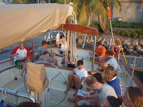 Despite my complete inability to get the Beach Boys song out of my head these past two days, our stay in Aruba has been a pleasant and relaxing experience. After two morning classes (a marine science slideshow and Professional Skipper and Crew Training), the crew split up and headed off for some free time. Some stayed onboard for a while to help put the new provisions away, and a few helped Dan change some oil and filters in the engine room, but most headed off for that one last ice cream with lunch. Some shipmates took the shuttle over to the nearby resort’s private island and spent the afternoon on the beach with some flamingoes and iguanas. We all met back up again for a delicious dinner of stuffed peppers and green beans cooked by head chef Andrew and his team. After cleanup was complete, the oceanography students had a short quiz, and the basic seamanship class had a rousing “pin rail chase” on deck under the floodlights. As fun as our stay has been, I think everyone is looking forward to sailing off once again, this time to a completely different way of life in the San Blas islands. We’re expecting some bumpy seas, but these Argonauts are excited and ready to go.