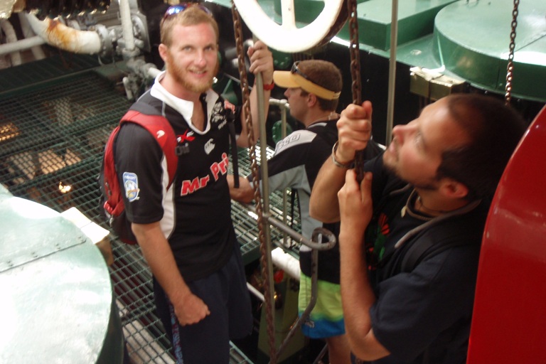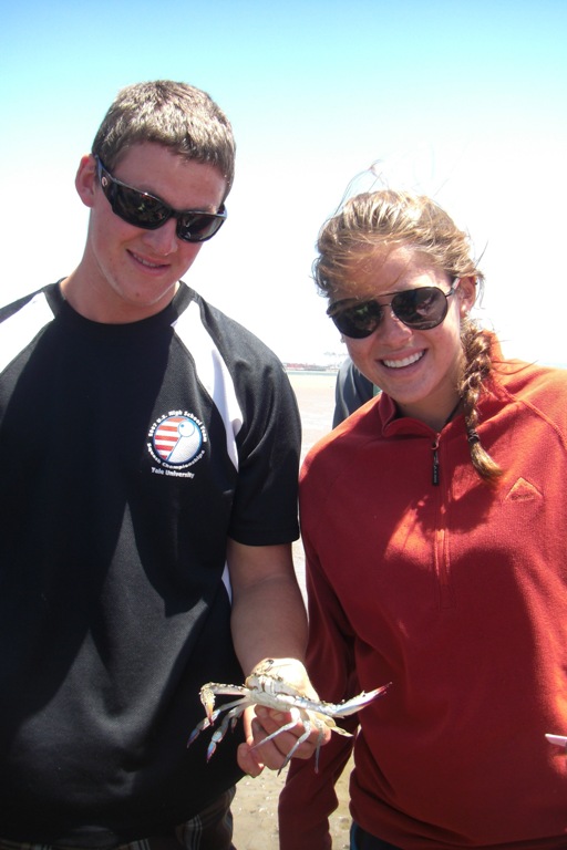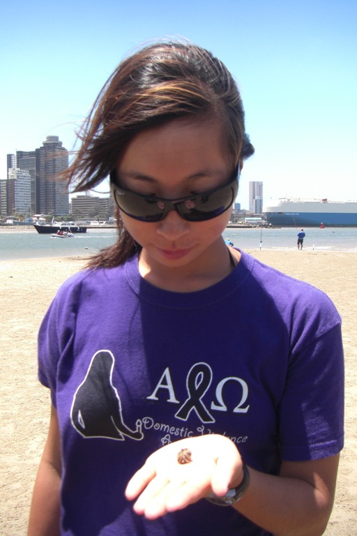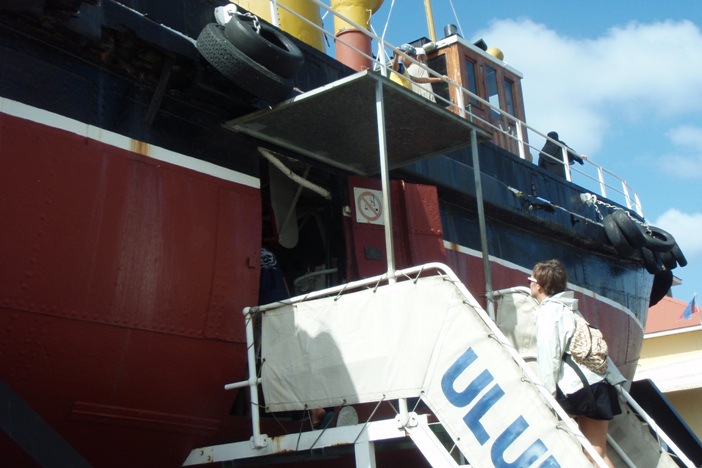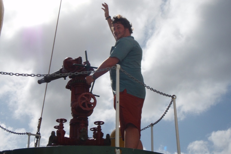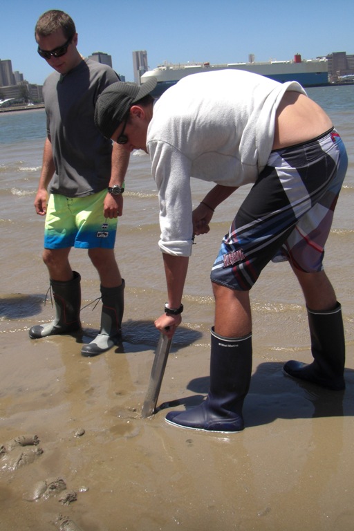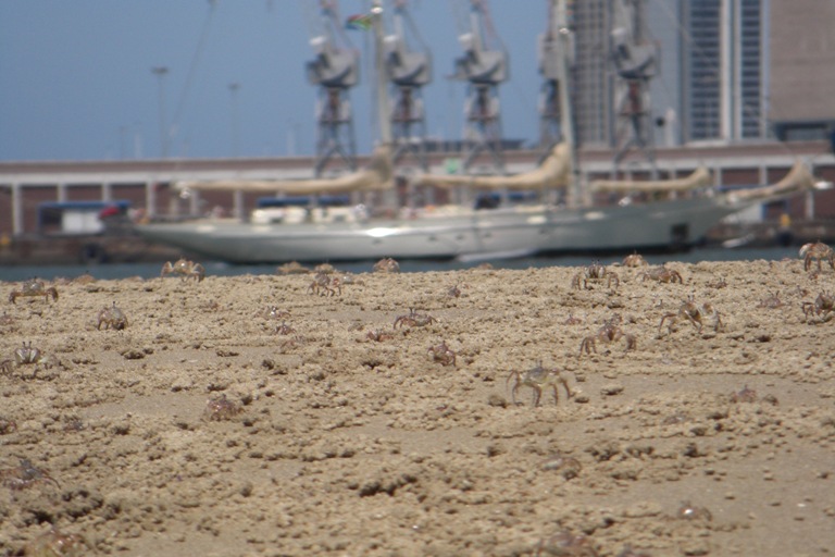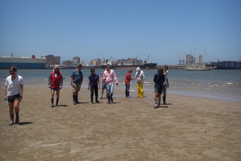 Today is our last day in Durban. It has been an exciting stay from the shark dissection, action-packed mall, and wet and wild water park. Yet today was no different. We had a full day, starting off with an oceanography course, which was quickly followed by Beaker demonstrating how she makes her trademark Beaker Bags. So now most of us have a Beaker Bag in progress and, once finished, can use it to stash our sweets like Dan or use it as a stylish one-of-a-kind handbag. After the crash course, we had an outdoor lab on the sand bar in the middle of Durban Harbor, just feet from the shipping lanes, where we spotted crabs maintaining their homes in the sand. Also, some of them made their way into Luis’ boots, which inspired a comical dance on the sand bar, where he attempted to remove the invader from his boots. After that, we all collected back on Argo for a quick pasta salad lunch, then promptly disembarked at the Maritime Museum, which is located just near the yacht clubs here in the harbor. There, we wandered around on board some old steam tugs, learning the history of Durban Harbor and the tugs that made this huge shipping hub possible. Now, back on board, there is still not a dull moment as everyone is doing their jobs in preparation for our sail later this evening to East London as soon as our barometer reaches the magic number of 1020.
