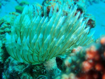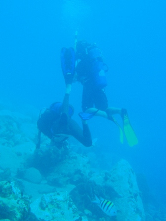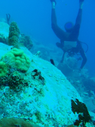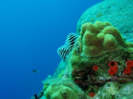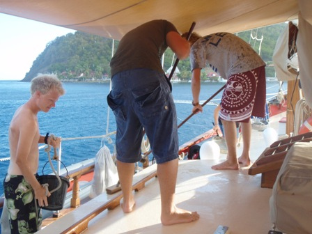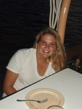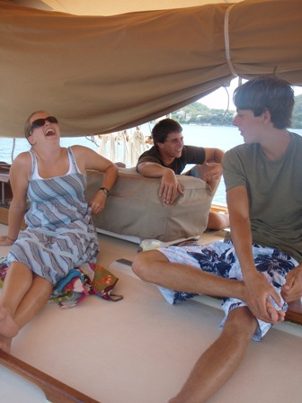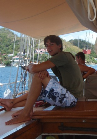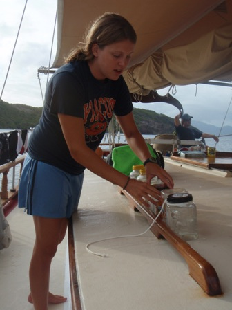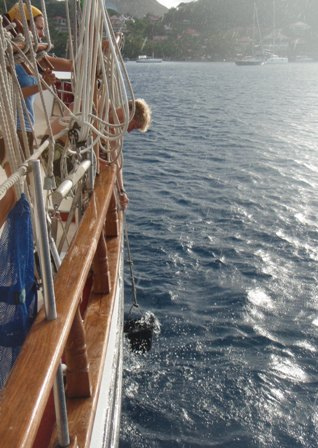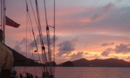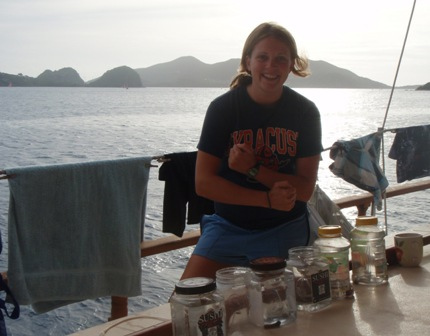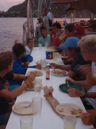 Our second day in the Saints was spent much the way our first day was, devouring baguettes, croissants, fresh, strong coffee, and enormous amounts of gelato. Beaker and I rose at the crack of dawn to get in another early morning run before a perfectly prepared breakfast (courtesy of Anne): french toast, appropriately. After breakfast, we had an MTE class on winds and weather conditions at sea, and then shipmates were free to continue their explorations of the island. After yesterday’s group successfully began collecting data for a reef fish behavior survey, several students decided to come back to Ocean Star early to organize a research dive for their Oceanography projects. They collected samples of sponges to analyze regeneration patterns and timed feather-duster worms’ reactions to disturbance. Back on deck, everyone was in good spirits, heavily caffeinated and full of chocolate ice cream and coconut pastries, just in time for dinner. In typical Ocean Star form, we poured on the hot sauce and still managed to eat enough to feed twice as many people. Our dinner entertainment: another spectacular Viridian Saints sunset.