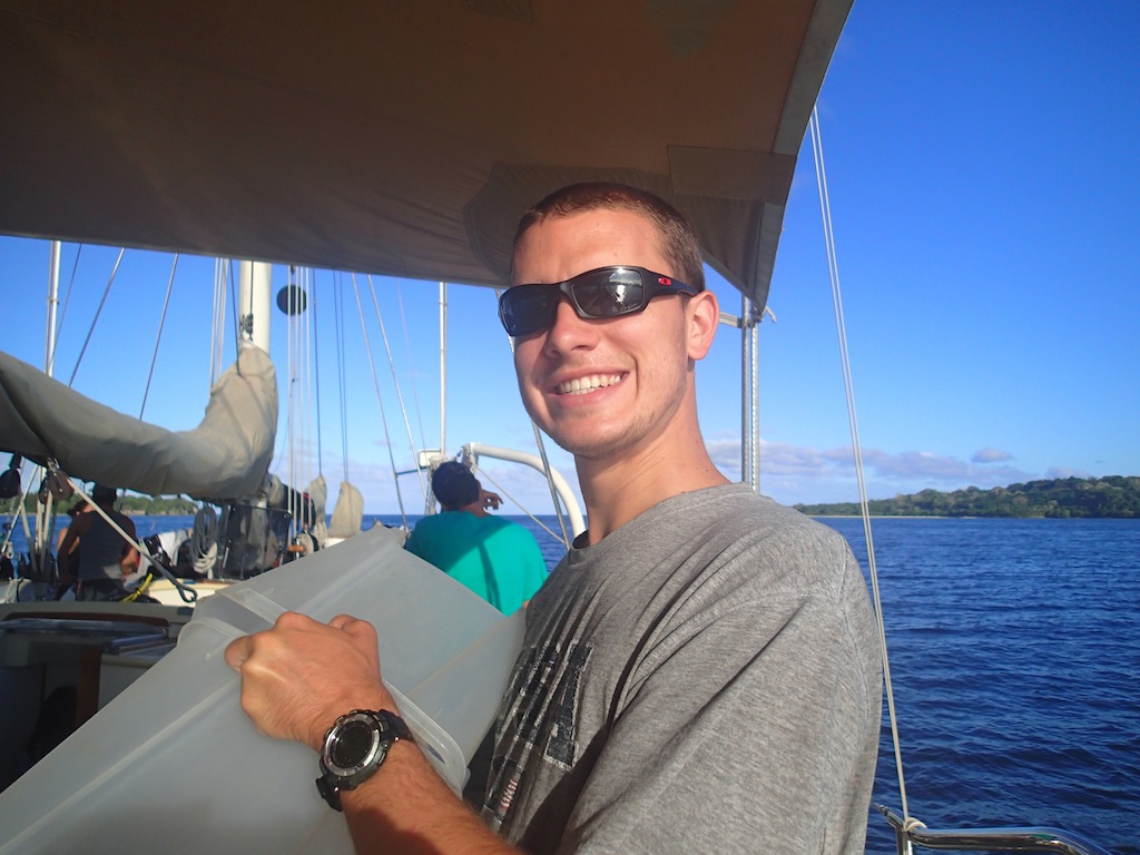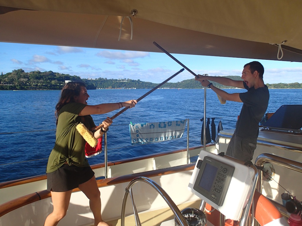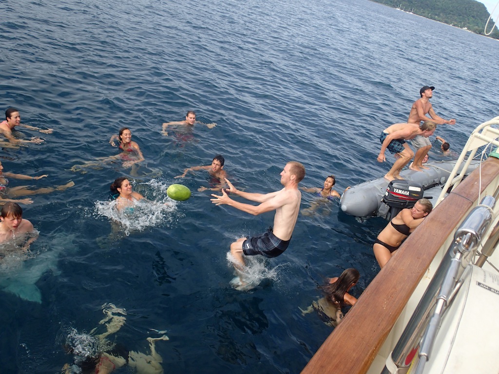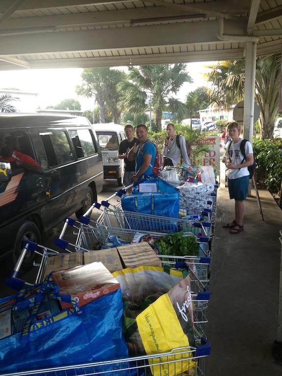 After five spectacular days in Vanuatu, it’s time for us to soak up every last bit and prepare for the longest passage yet. Today, we had two how-to presentations in the morning. Ermi taught us a relaxation form of Tai Chi and taught us what not to do when we go to China. She explained how we should NEVER get a tattoo of a Chinese character because most of the time, they say chicken or are written in terrible handwriting. She also informed us not to try and speak the language because we no doubt will have it wrong, and they will have no idea what we are trying to say anyway. It was wildly entertaining, and I say we learned a lot and are very prepared for our travels to China. We then had Katelyn show an egg beating, the water polo form for treading water. She did fantastically; she managed to get everyone in the water to practice egg beating and pass around a watermelon, our substitute water polo ball, of course. I was tired after about 10 minutes in the water, and these players had to beat me for hours. I have a whole new perspective on egg beating and water polo. After the morning, we had the afternoon for shore time. Students went and saw the waterfalls, jumped in this beautiful blue lagoon with a rope swing, rode horses, shopped, and loaded up on food for passage. There was also a pretty large group of us, RJ, Jim, Eric Sturm, Ryan, Leah, and myself, who all went provisioning to make sure we had enough food for our next passage. It is a lot of fun filling up nine shopping carts of at least 9 of everything.