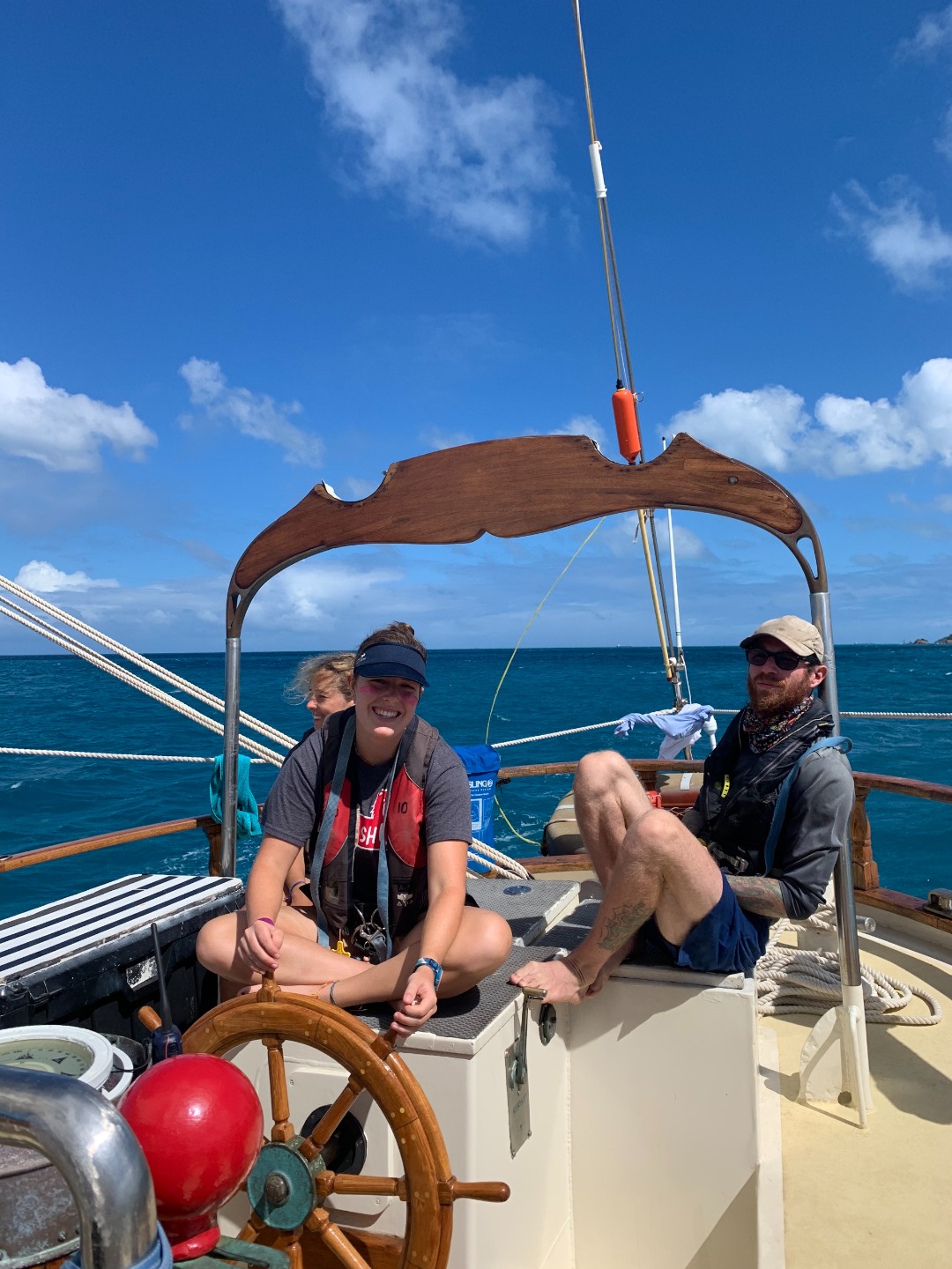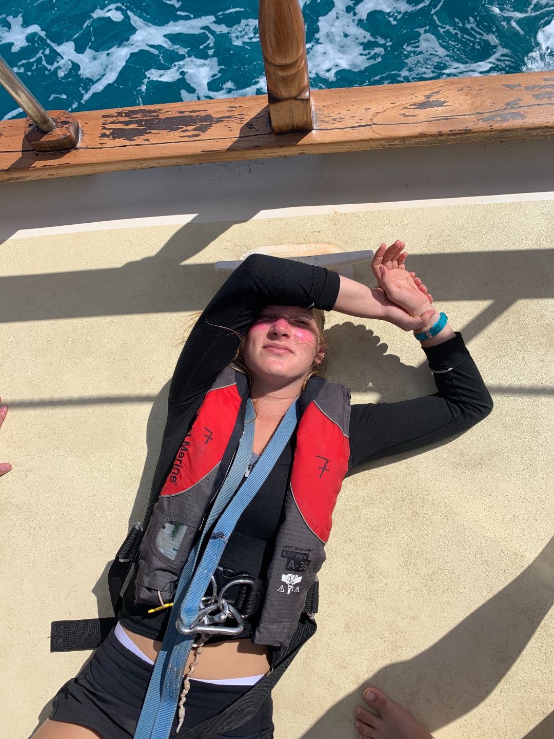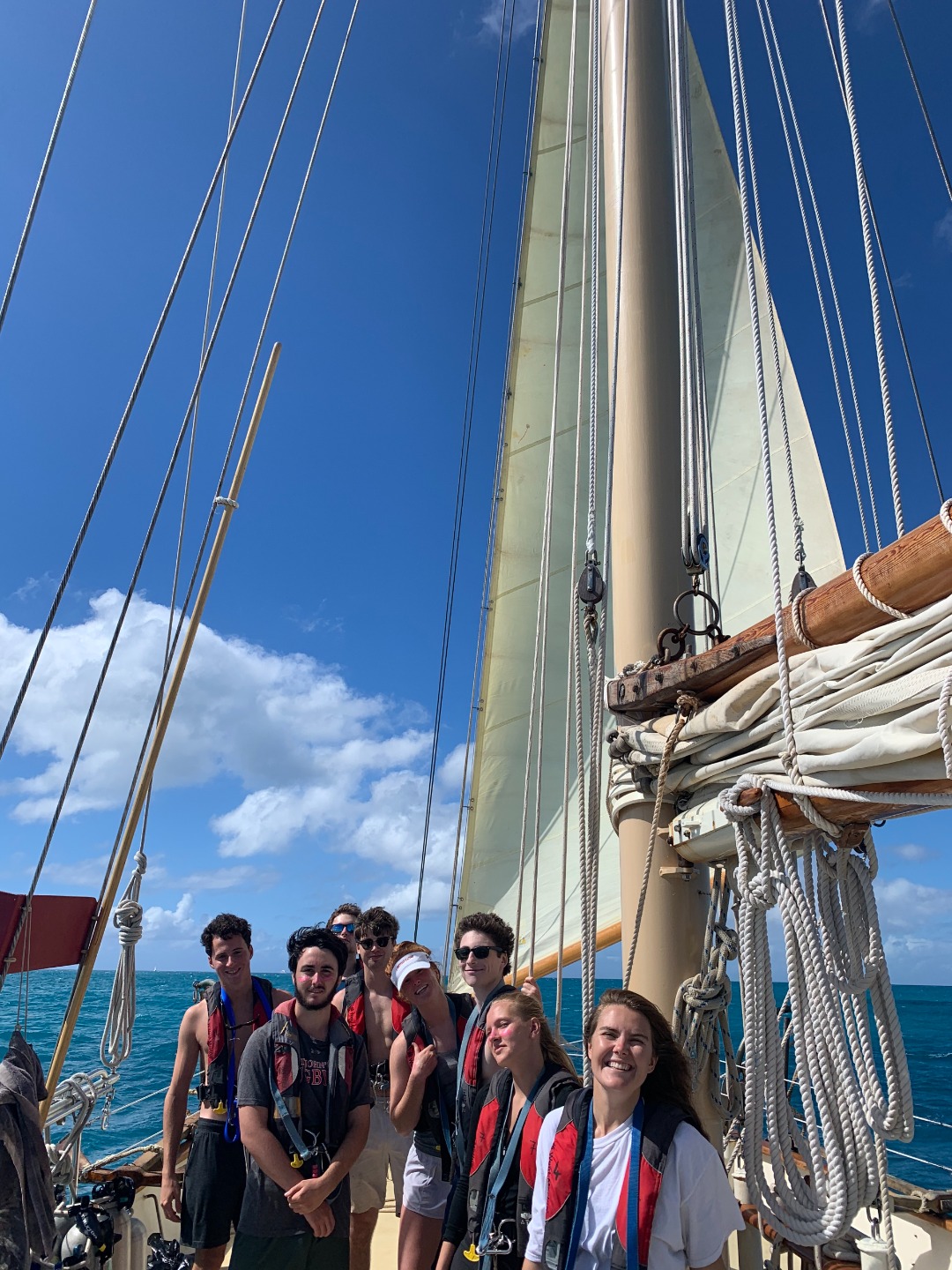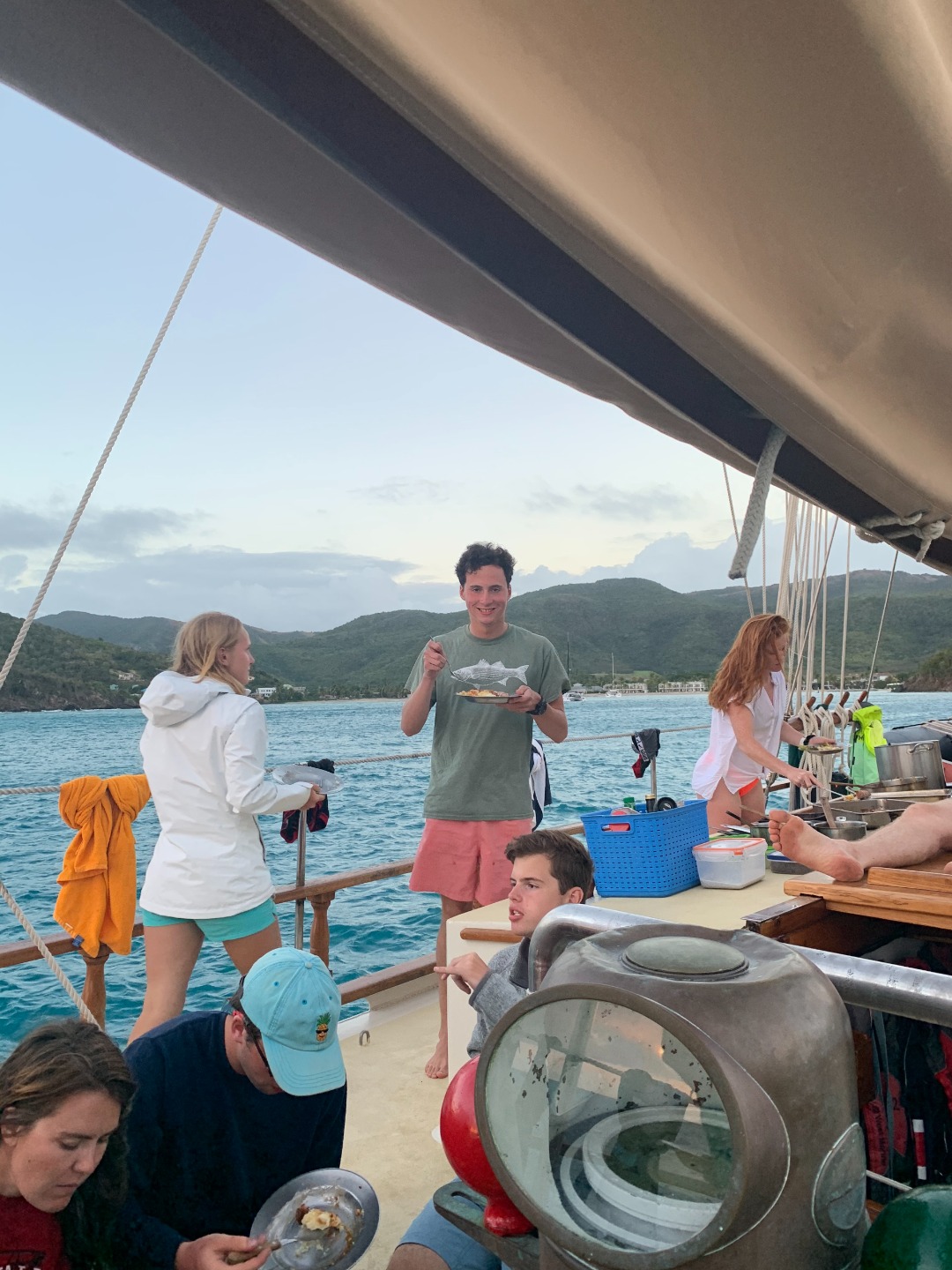 They say that Special K is the breakfast of champions, but we’re convinced it’s actually Marshmallow Mateys. Think Lucky Charms, but very off-brand. Keaton is convinced that we see rainbows when we eat them, and today we saw two! I think it was a good omen for our bio test, but we’ll see when the grades come back. Steve did not hold back on the questions about phytoplankton. After the test, we sailed away from our anchor spot so that we can get our Covid tests tomorrow in Antigua. Celia loaned us some of her pink zinc, so we felt like real sailors, and we managed a pretty seamless sail besides Henry’s lost hat. Maybe it will reunite with Julien’s airpod that also went overboard. After a great pasta lunch from Ash, Brahm taught us some knots that we then tied to every available surface of the boat. At this point, I think I’m going to be tying clove hitches in my sleep. No diving today, but a fun afternoon of swimming and throwing a deflated football we found. Grady also figured out how to work the surround sound speakers in the salon, much to Steve’s chagrin. Don’t Stop Believing can get pretty loud on those things. Dinner was Toad in the Hole, a Steve specialty, and although some of us (me particularly) were skeptical, it turned out to be a big hit. Gearing up for a movie night and, hopefully, some chocolate chip cookies, followed by my 1-2 am anchor watch. We’re all getting excited for our first passage to St. Vincent and the first day of student head chef tomorrow! Liam, we’re all rooting for you. Goodnight from Antigua, and miss you all at home!