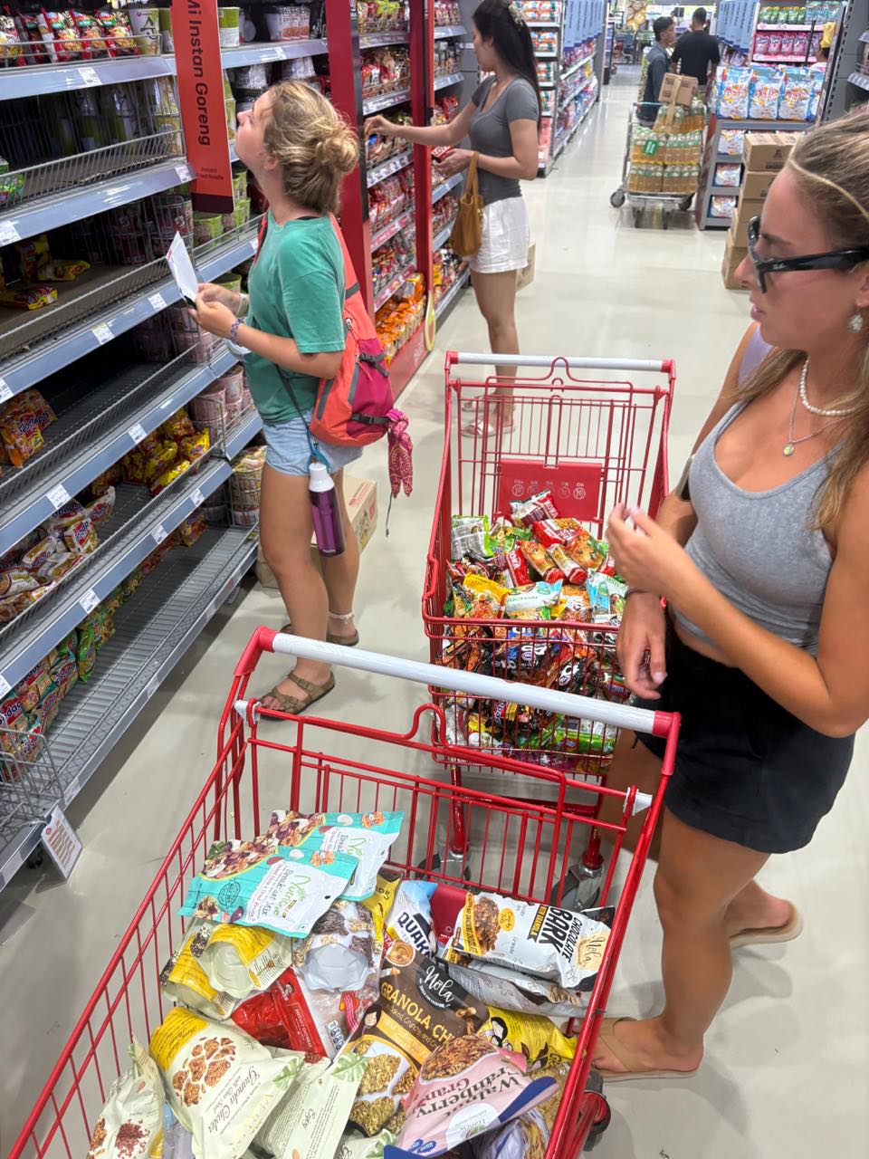 The rest of us stripped out sheets and luckily Enough got the chance to send out Landry off to get professionally cleaned. Then a game plan was set, and everyone started working on certain jobs. People on top bunks started clearing out their beds and cleaning everything in sightespecially fans. The rest were on deck, in the chart house, or in the salon, organizing and cleaning every part of Vela. After a while, almost everyone has moved around the boat, changing jobs to let each other clean their bunks. A quick stop for lunch, and we go right back into it. I stayed up on deck with Jewel, Maia, Adda, and Riley, scrubbing everything in sight. After a much-needed scrub, we brought everything back and into its correct place, including sail covers and life rafts. We add some more people to our crew and fishing at the stern. At this point, the deck is scrubbed, the galley and salon are organized and cleaned, the bilges are reorganized, the heads are cleaned of everything in sight (thanks Thaxton), the chart house is finished off, and gray water is pumped, and Im sure so many more things that I missed. But we are Done. So we eat dinner, and then the missing 4 arrive with what seems like enough food to last the whole 90 days. They all seem a little crazy after 8 hours in one store with one song on repeat. We then load up all the food into carts with flat tires and wheel them back to Vela. Then the real chaos begins. Or what the staff like to call it organized chaos. We unload it all into the salon and start tearing everything we just worked on up, to get all the new food back in the boat. It all makes its way into its respective place, and we seem to have done it all!! BA is DONE!! Everyone seems to be a little spaced out, but we have new, fresh fruit, so its all good.