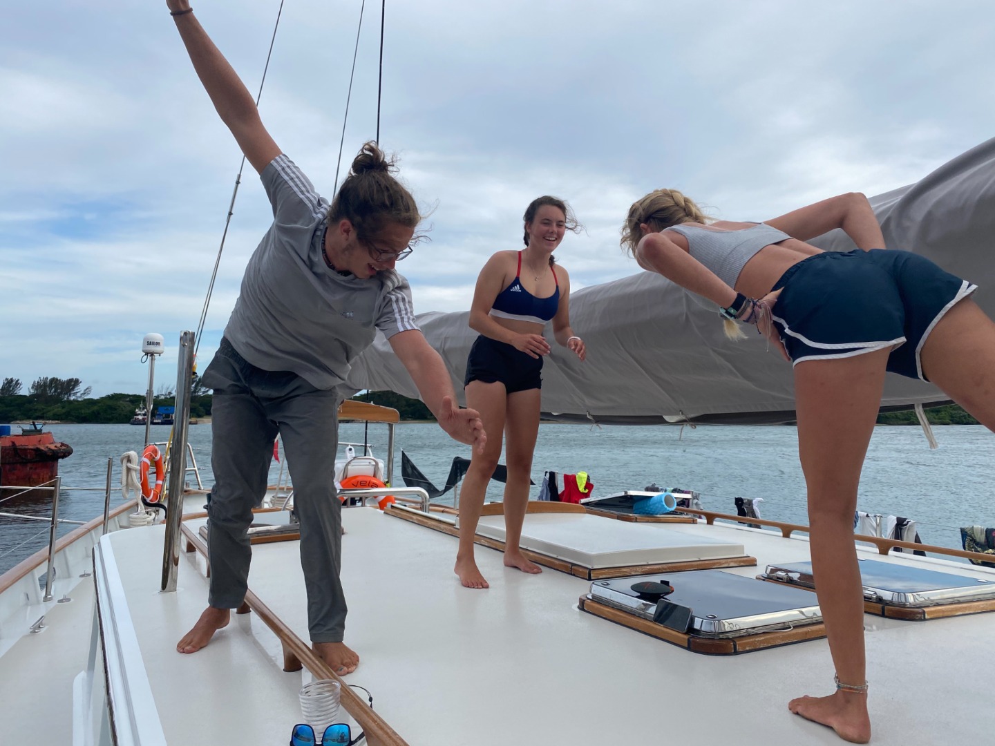 Today we received awesome news! We got cleared into South Africa and were told today that we could go on a safari. Everyone was so excited to hear that we were going to be able to go ashore. We were all shouting and yelling. After breakfast, we had a thorough boat appreciation, cleaning the sea salt off of everything and clearing the dirt out from down below. There was a lot of work to do, but we all got stuck in where we needed to and got the job done. Just before dinner, the team that was allowed on land for provisions came back with fresh food. Because of the way we are tied to the dock, we aren’t always right up next to land and have to really stretch to grab the groceries from our onshore buddies. Our brave captain Tom decided to take a quick break to play with the rugby ball and, in the process of getting the ball back on the boat, somehow punted it straight into the water. He was quick to make up for this mistake, however, as he tapped into his inner orangutang and climbed on the dock lines to retrieve the ball with his feet. We all love Tom’s feet!