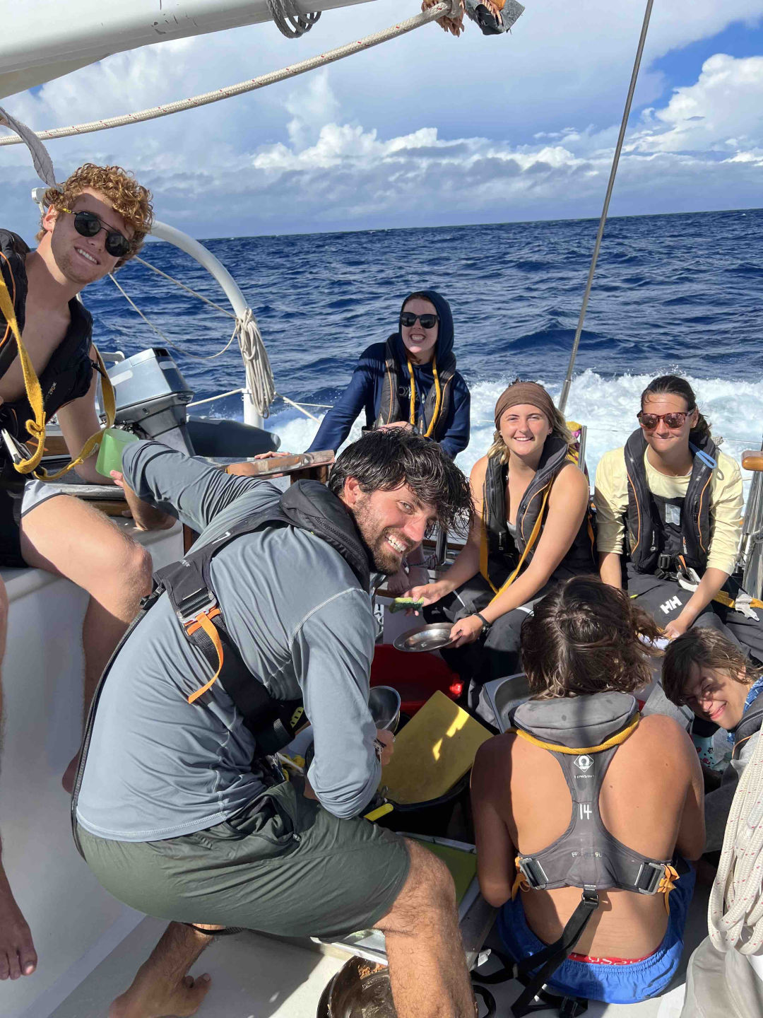 I then got to say hi to Joel’s mom and shout out to Ms. Gibson. Dinner was then served as we ate under the cotton candy clouds. We then finished the day off with some snickerdoodle cookies. Thanks, Maya, and squeeze. Ash might make a good pirate, but Emy wouldn’t because she would be writing everything down for her thesis, and apparently, Allie would be the worst pirate. The passage definitely did not feel like five days; it felt so much shorter. Maybe I’m sleep-deprived or going crazy like Mia. It is nice to be back at anchor, though, as I won’t get my life jacket butt straps caught on the six-stack door anymore. We’re all getting ready for a night swim and to finish the outlines we forgot are due tomorrow, and all super excited to go canyoning soon.
