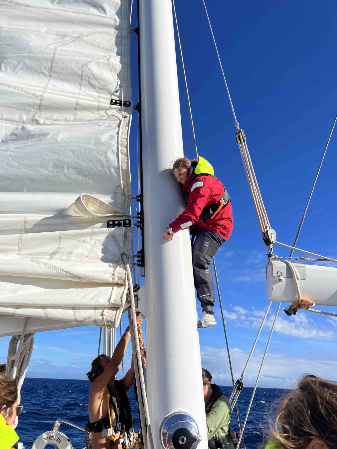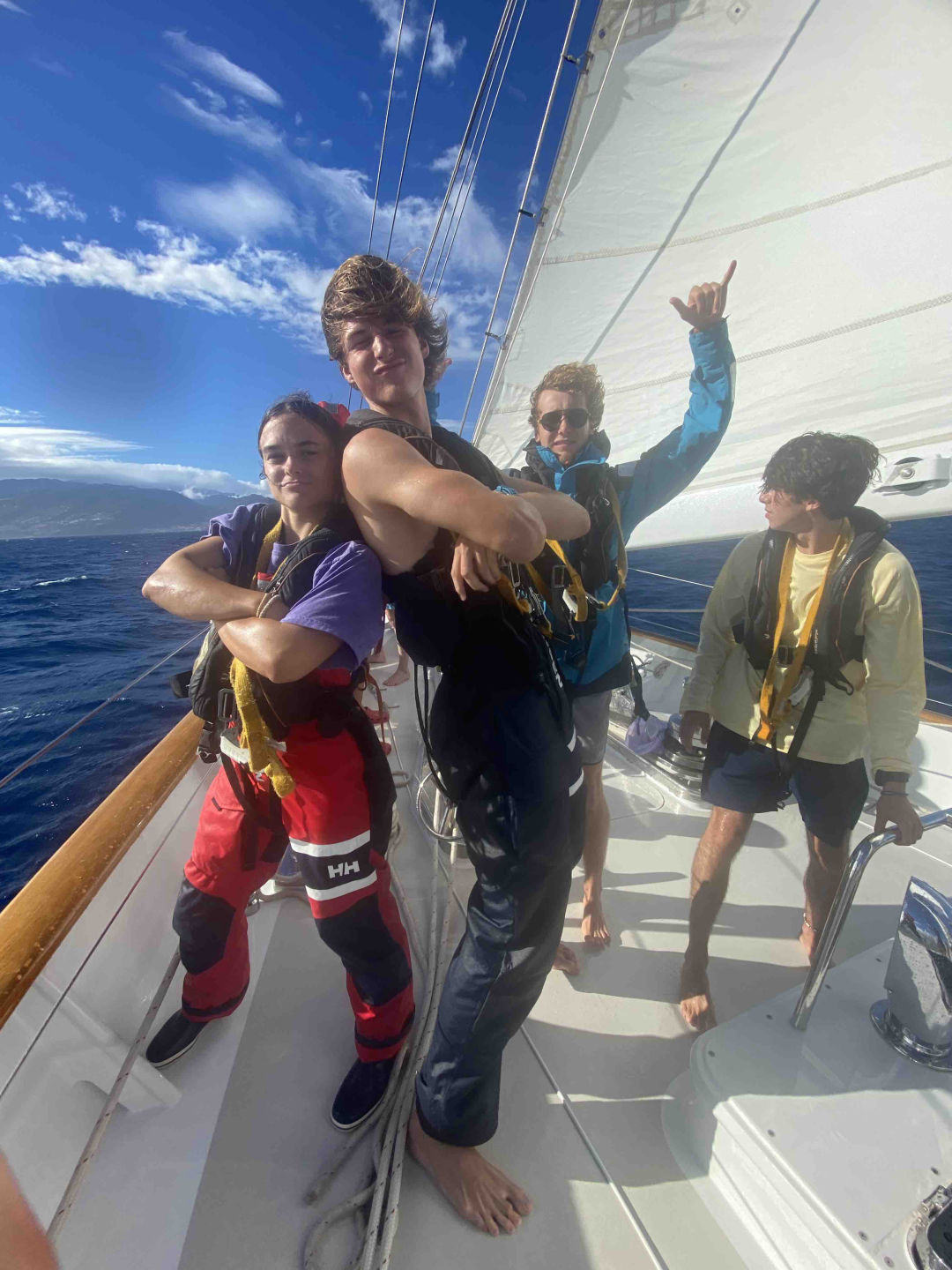 Babushkad, under layers of blankets, watch team alpha huddled together as we listened to Emy recite the Odyssey and bore witness to Mia’s fake arms. Like, they are not hers; I don’t know where they came from. We then sailed into the sunrise as the strong winds pushed us forward. The chef team prepared some gorgeous nachos that Mia somehow made with her fake arms. Although there was lots of confusion about where we were going to eat, we gathered into the cockpit, hearing lovely shouts of “scoot out of the way”. After lunch, Allie and I serenaded the boat with “Madeira, Madeira” to the tune of Shakira’s hips don’t lie while we were fulfilling our jobs of intimidating bouncers. The day was filled with lots of sail raises and strikes and screams every time we were covered with sea spray. We are a salty crew currently. The wind was super strong today, and we even sailed 9.7 knots and had a low of only eight yukes from resident vomer Spews, aka Lindsay. It was an incredible day of sailing with crazy weather. I was constantly in and out of my foulies. The King of Time, Calum, came out again, and now we’re only 4 hours ahead of the east coast, but only after we heard the song by Johnny Clegg. Then, after five days of sailing, we reached Madeira. As we anchored, we had leadership class where Joel and John taught us all about how they would report us if they were our RAs. We then scrambled up on deck to see the gorgeous yet intimidating cliffs of Madeira. A bunch of us immediately rushed to jump into the water, even though it was frigid. We hucked some gnarly backies off the bowie as per ushe.