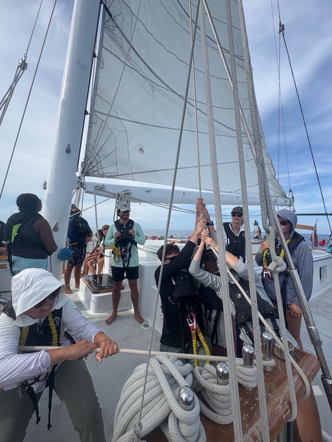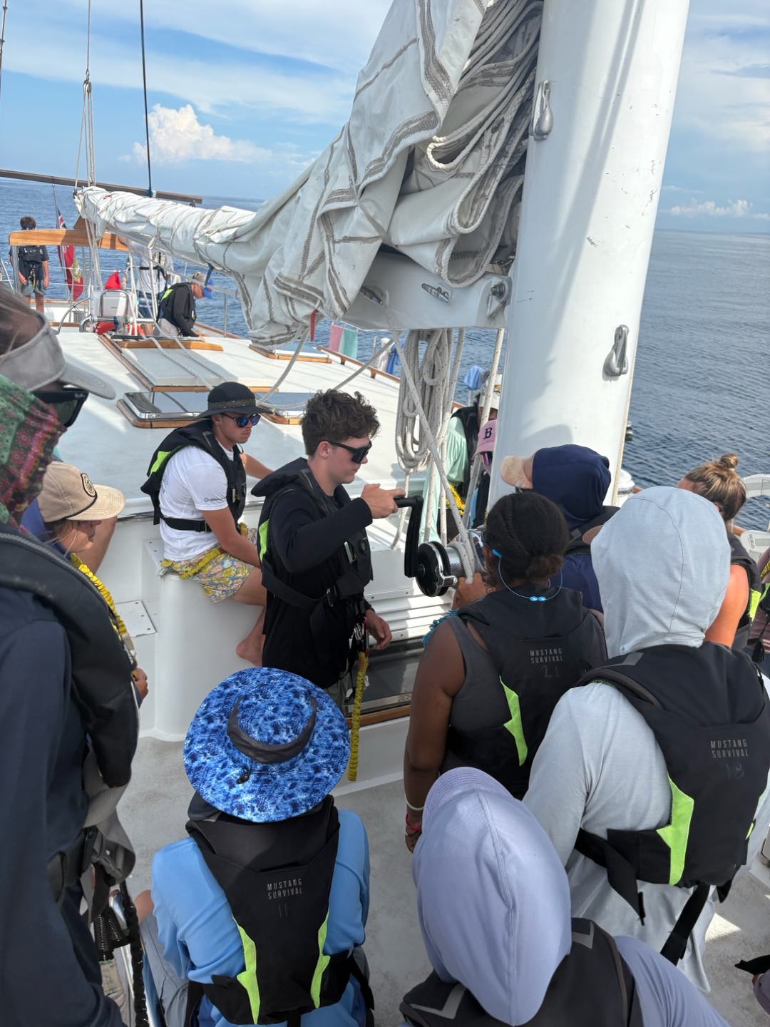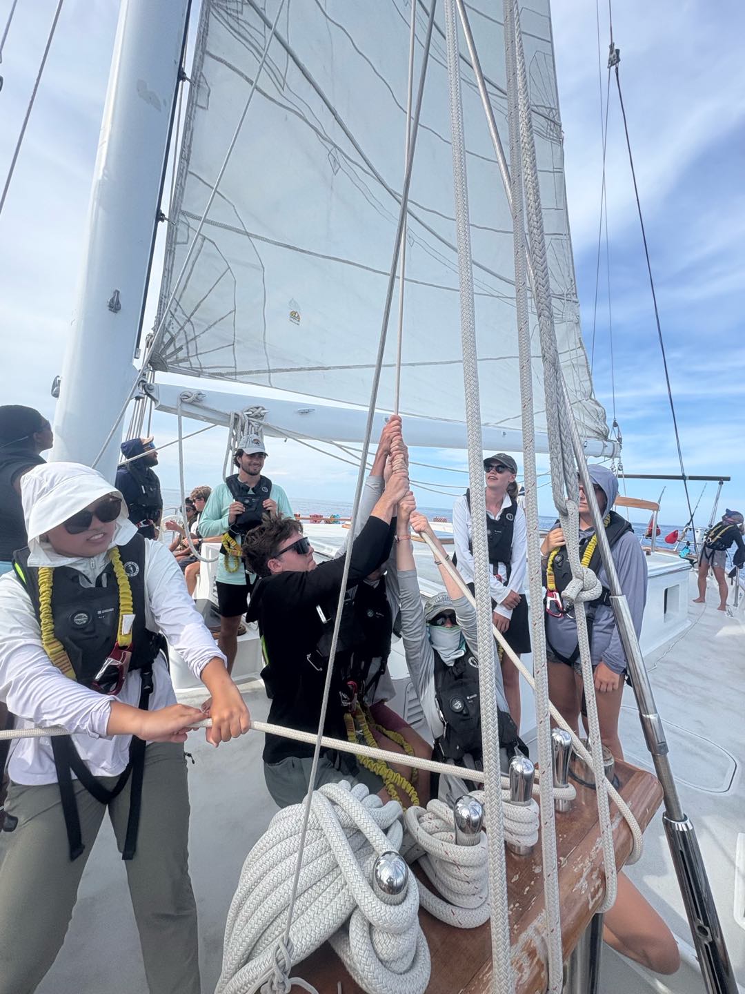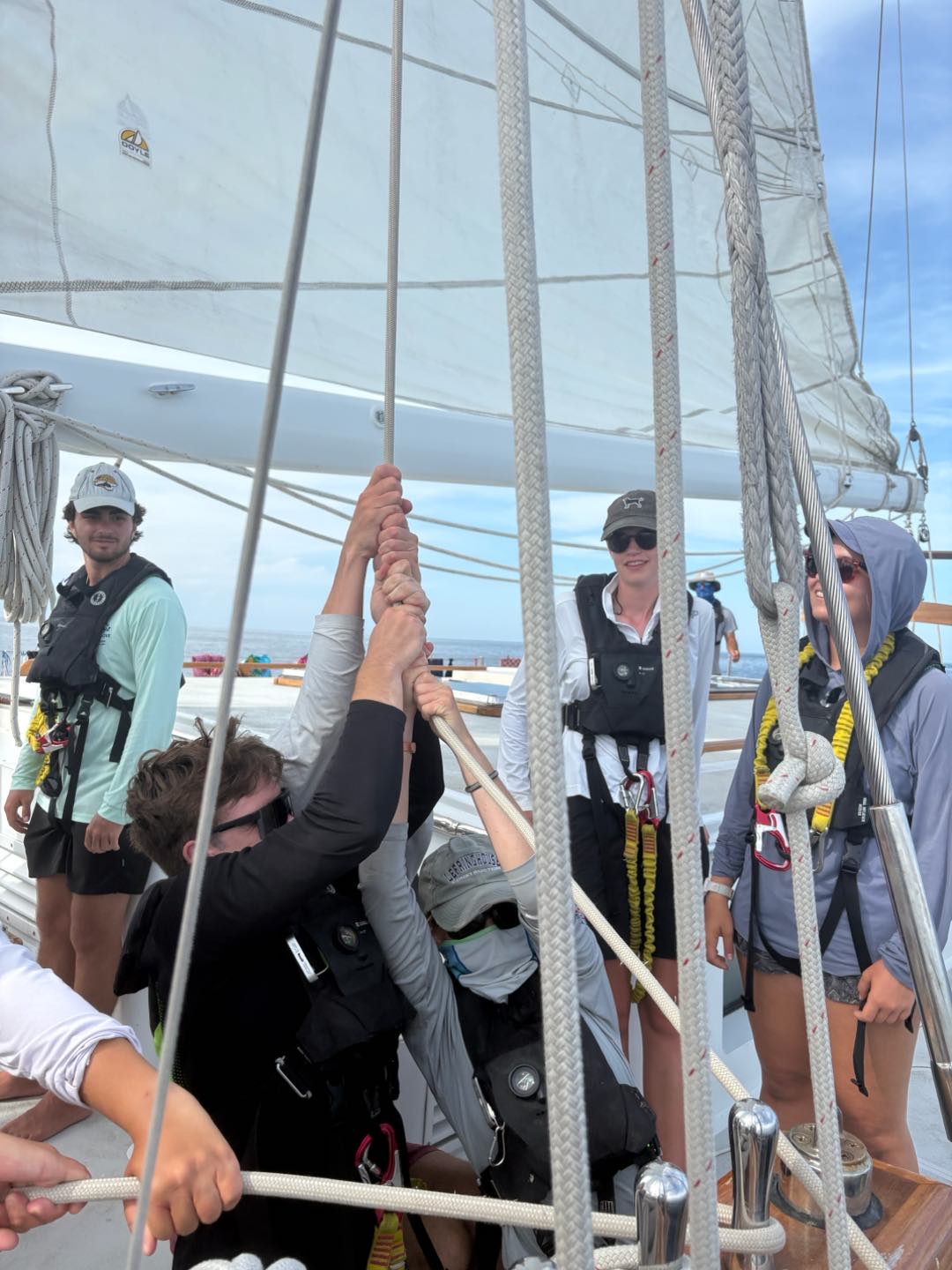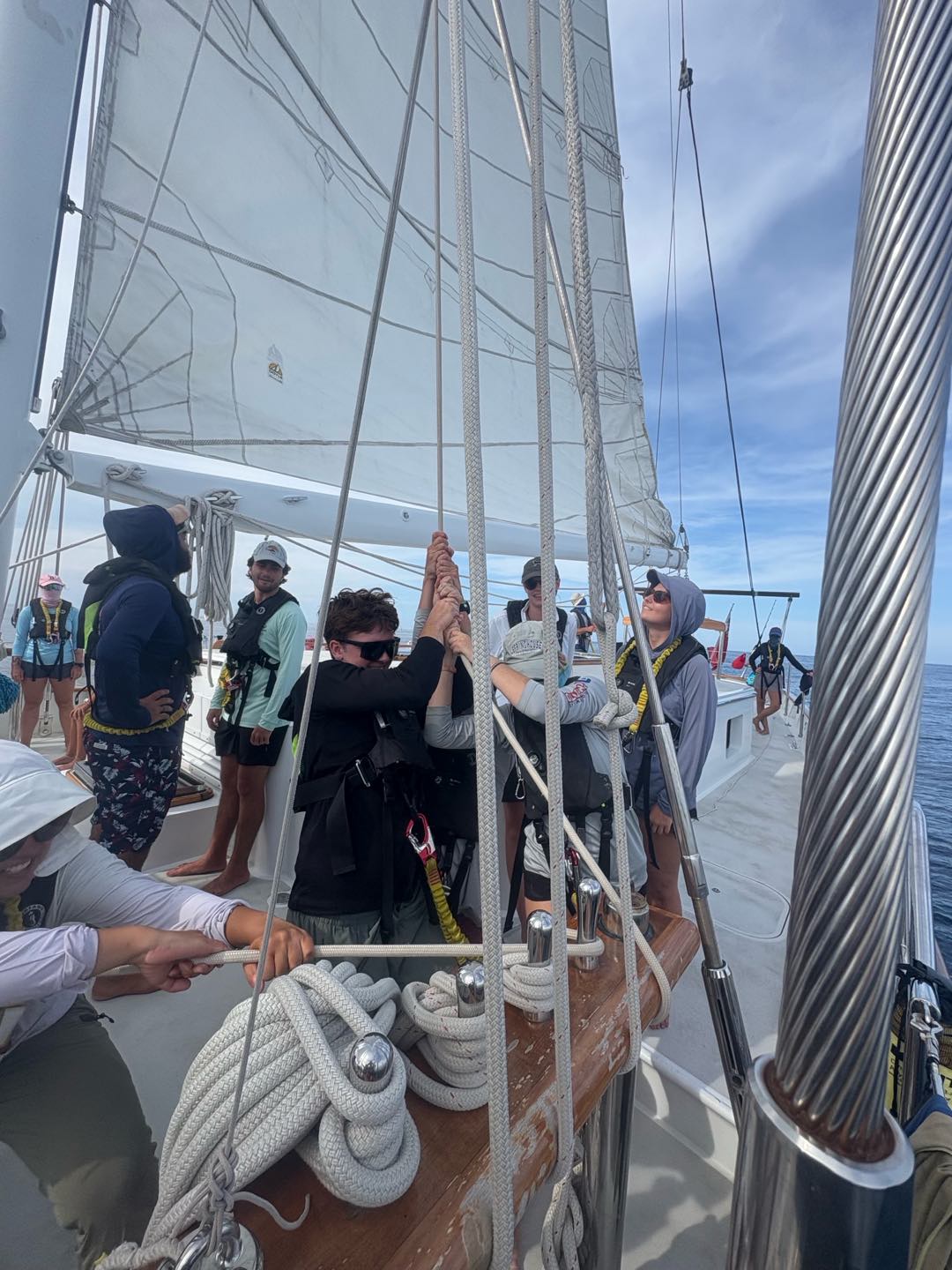 Now back to the day: we had Marine Bio then seamanship, where we set up and striked the Main Sail. It was really cool to see how everyone worked together, split into teams on different lines, and working together on each line to raise it. Then watch team 3 continued the watch until 6 PM, and after the card was passed around down below, and Vera handed the completed card to me on bow watch. Then we had dinner of chicken, rice, and really good bread despite a finicky oven. For my squeeze question, I asked what do you love, and it was really nice to hear people talk about the things they love to do and the people they appreciate.