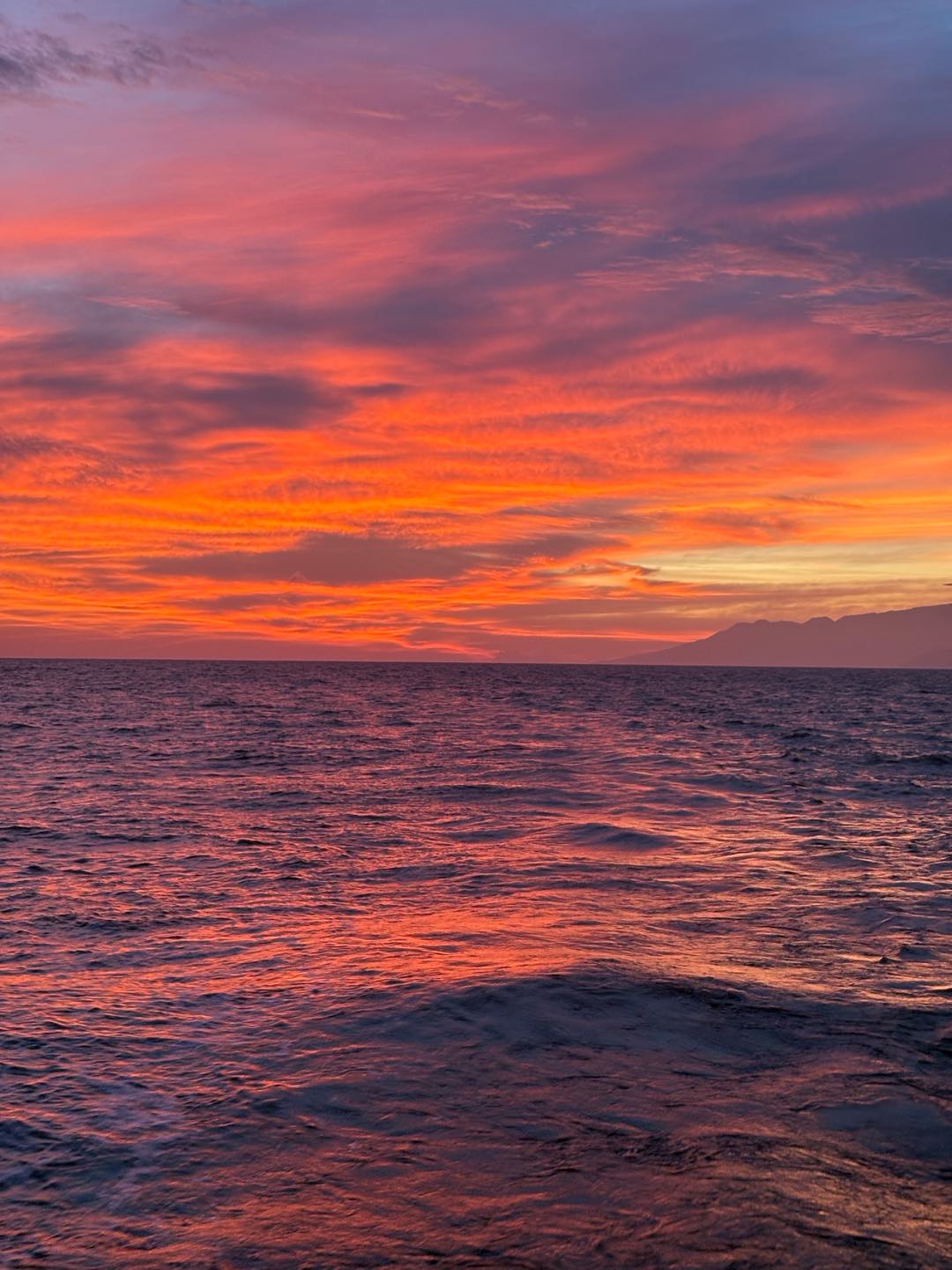Today, 9/30/2025, is our first, full day of passage where were on full watch rotation, as well as Perry’s birthday! The first thing we did on our 4-8 AM watch was singing Happy Birthday for Perry (the 1st time: parenthesized numbers indicate the number of times we sang Happy Birthday for Perry). The sky was also wishing Perry happy birthday, by dying half the sky orange, and other parts a peachy orange-pink, light blue, and light purple. It was a peaceful watch other than dodging a couple of small boats and sang Happy Birthday for him 3 more times (4). Then watch team 3 went to get some precious nap time. I was awoken around 10:30 AM, played a game of very interesting chess with some intense attacks.