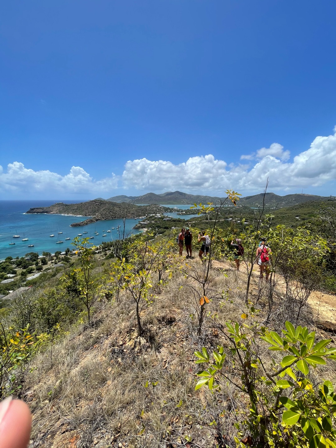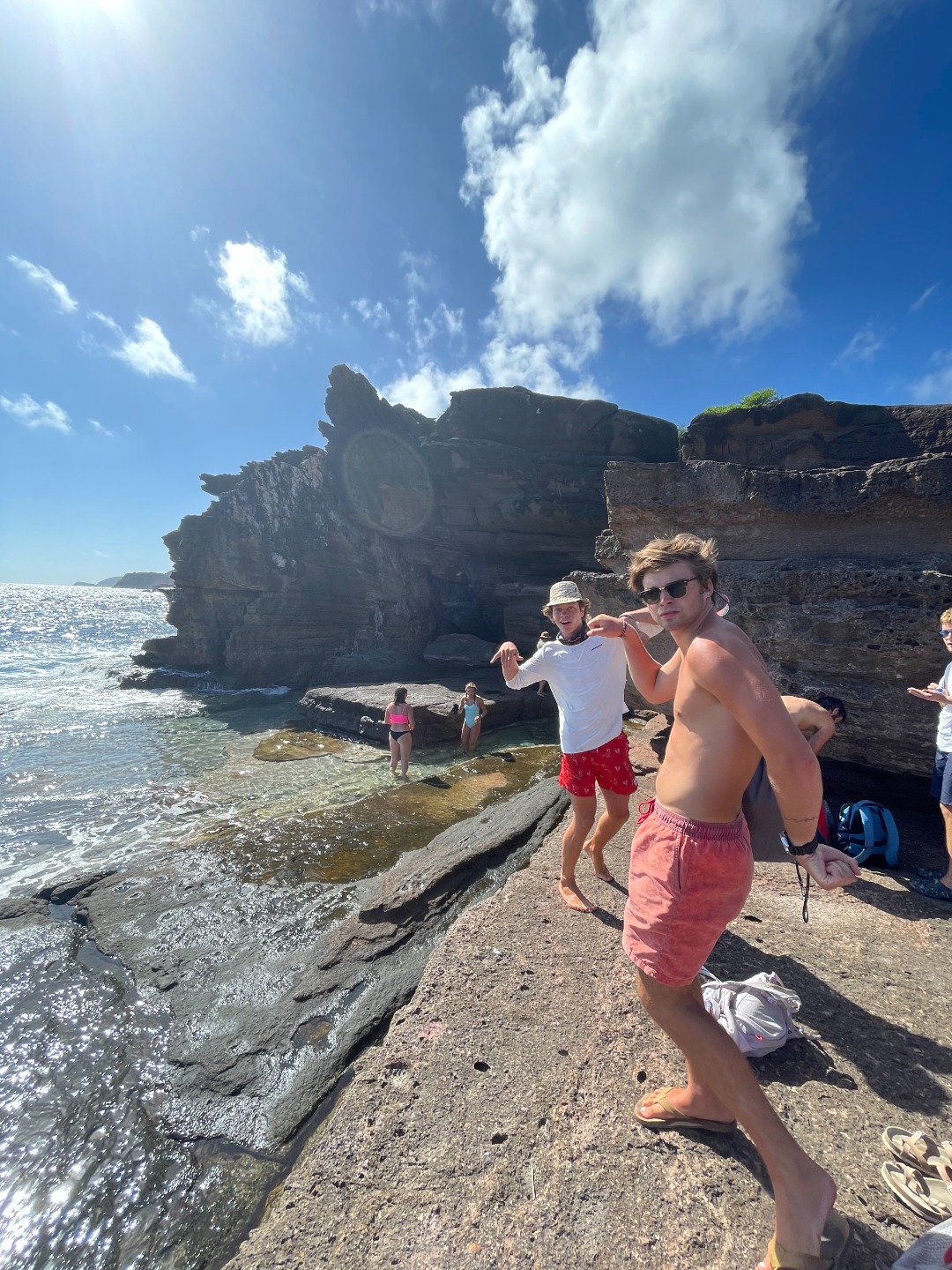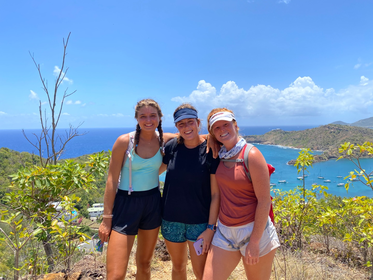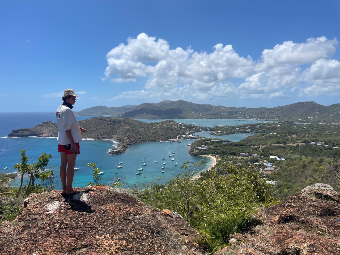 This morning was our final voyage on the S/Y Ocean Star. Although it was a ten-minute ride to our slip, it was still a bittersweet day. The trip is quickly coming to a close, and leaving Falmouth harbor is when reality sets in. Breakfast came out on time as per usual this morning. Keaton, Katie, and Addisen put together some beautiful coffee cakes. Quickly after eating, we packed up our lunches and got ready to take on today’s hike. `The plan for today was to hike Shirley Heights here in Antigua. Anchors were hoisted for the final time, and we made our way to the slipway. We were greeted by some familiar faces as Steve docked like a surgeon, I only award that title to my father, but Steve’s performance today took the cake. We made our way off the boat and walked up some backroads until we found a trail, not the trail we were looking for, but it was a trail, so we naturally started trekking. Soon we realized we were on the wrong trail, so we hiked all the way back down and were able to find the right trail up the street. The actual trail was uphill both ways, but we were rewarded with beautiful views of our home island Antigua. We met a cat, named it Beans. Our trail tapered off as we approached some massive cliffs. Climbing down, we found some tide pools, where Henry and I raced sea urchins and snails. Chris tried to catch some fish with his bare hands to no avail. Continuing back up into the bush, we popped out along a familiar beach, the one us new divers got our open water certification at, and also where we all swam together for the first time. We took a relaxing swim, had sand castle wars, and made a massive sand sculpture. Walking back to the dock Max and I talked about pizza; I can’t eat dairy, so max mostly talked about pizza. Dinner came around with pizza; we each shared some funny moments we have had on this trip, and we laughed while enjoying some cookies.